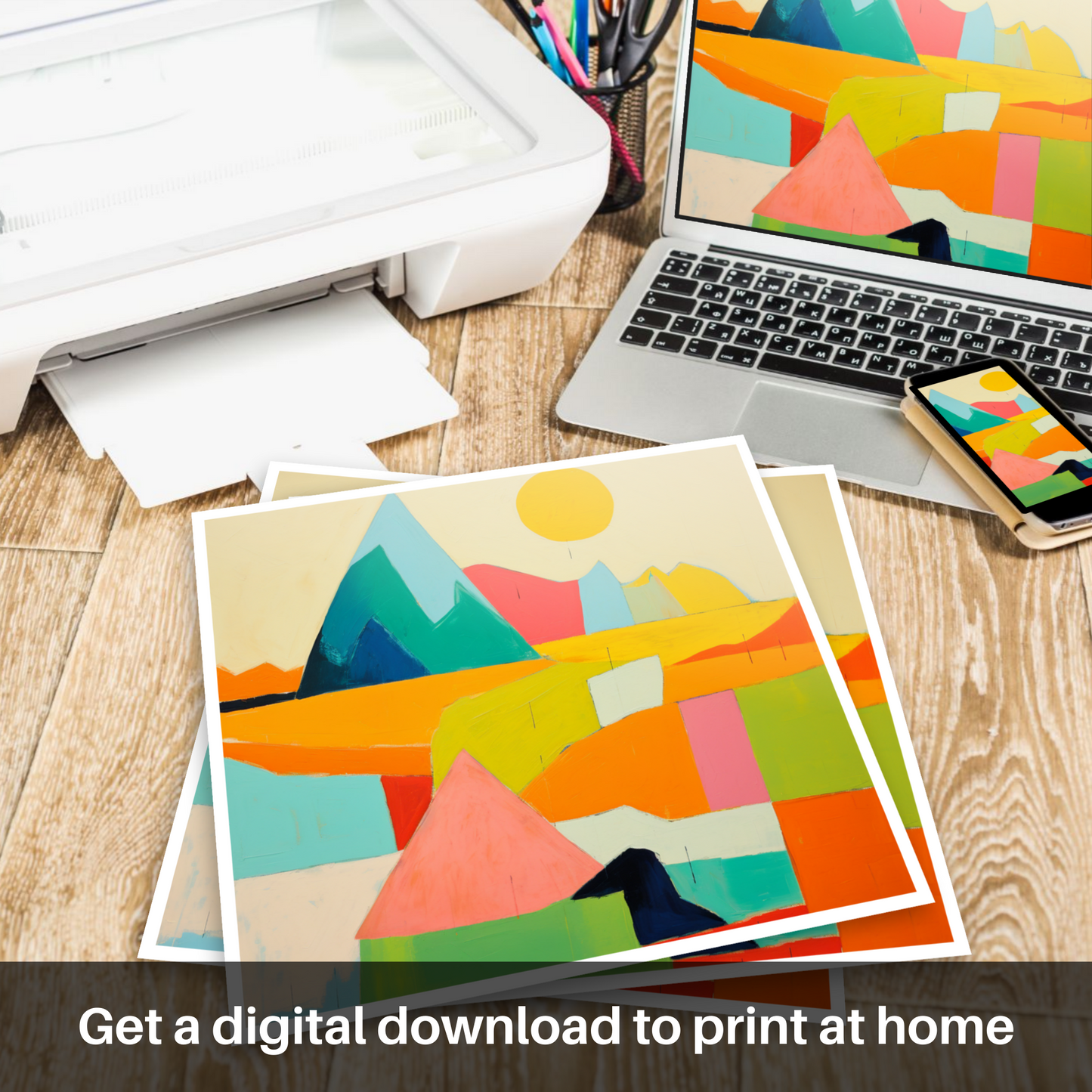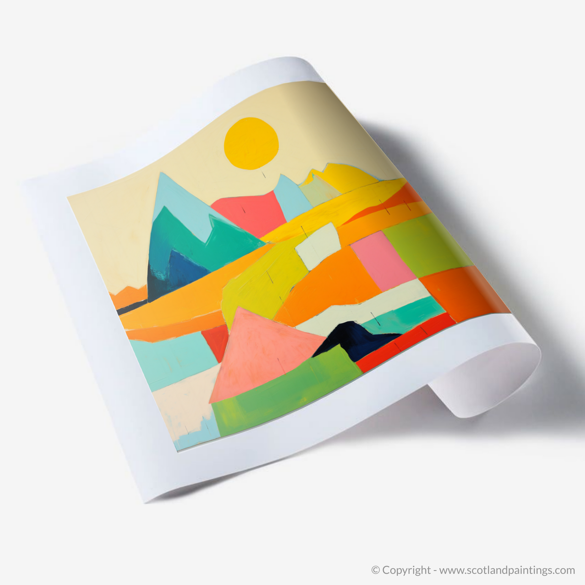 Embark on a visual journey through the peaks and troughs of the Scottish Highlands with this exhilarating abstract interpretation of Mayar. The artwork is an effervescent mosaic of geometric forms, where each brushstroke brims with the vibrancy of the Scottish Munros.