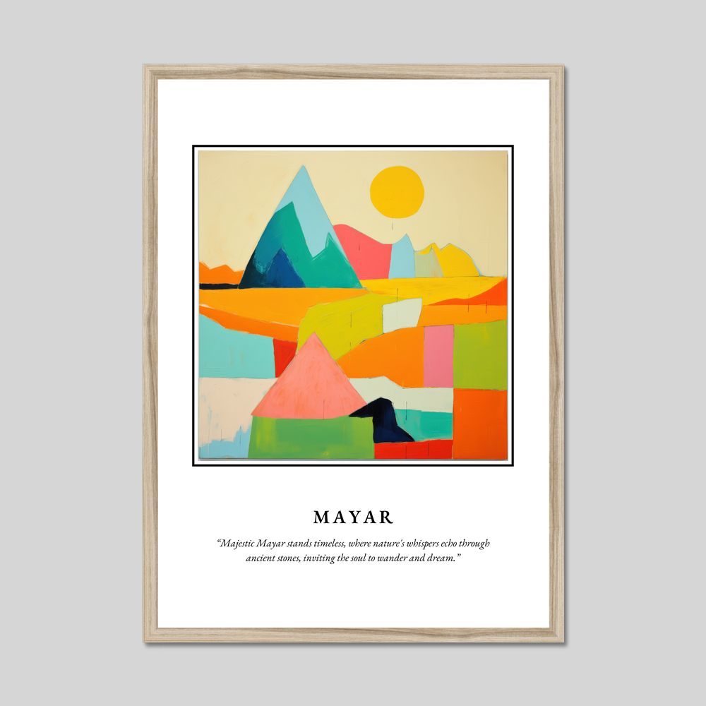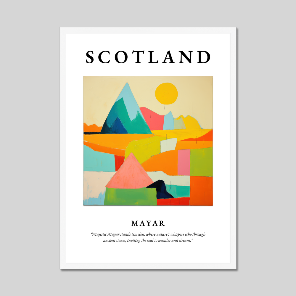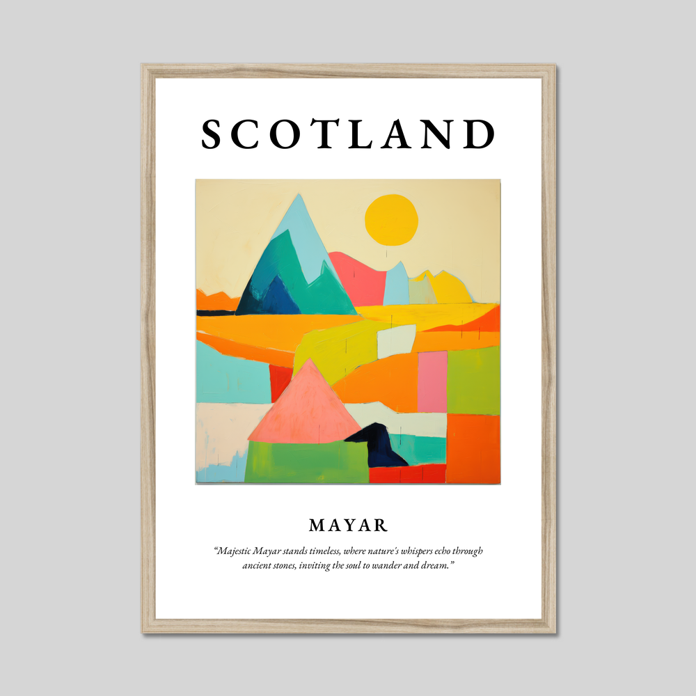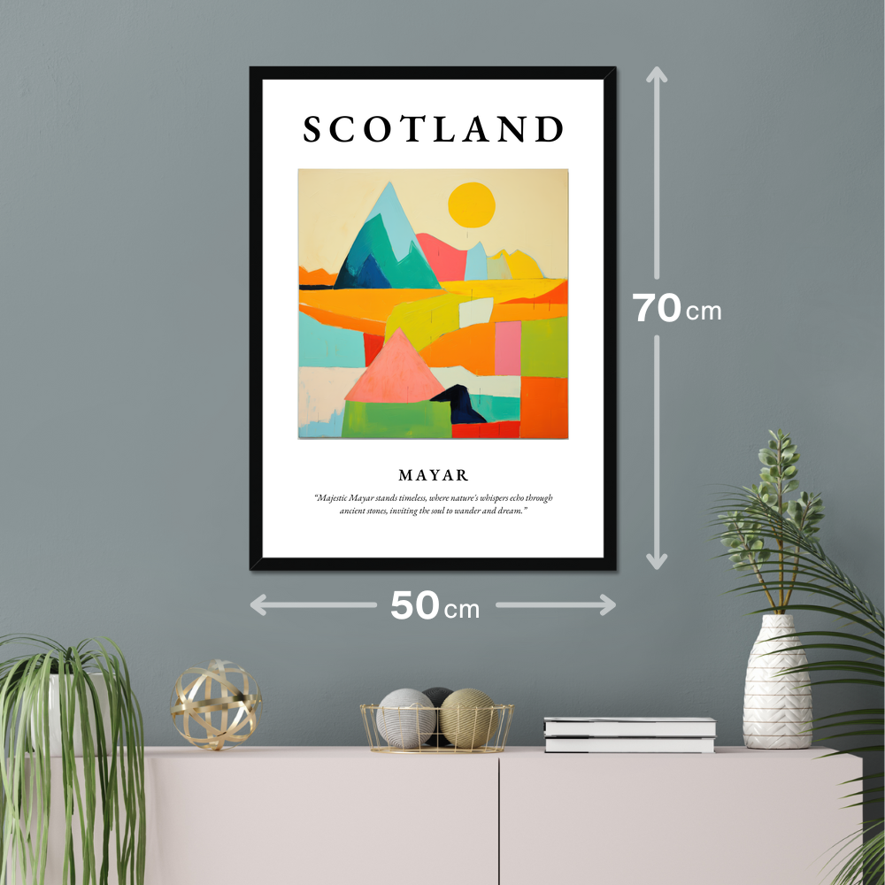 Elevate your space with an exquisite framed art print that captures the essence of Scotland's majestic beauty. Measuring 50cm x 70cm, this striking poster features the word "SCOTLAND" in bold lettering, coupled with a captivating abstract portrayal of Mayar. Below the vibrant painting, you'll find an inspiring quote: "Majestic Mayar stands timeless, where nature's whispers echo through ancient stones, inviting the soul to wander and dream." Available in a choice of black, white, or natural wood-effect frames, this piece is perfect for anyone with a passion for Scotland, art, or abstract styles.