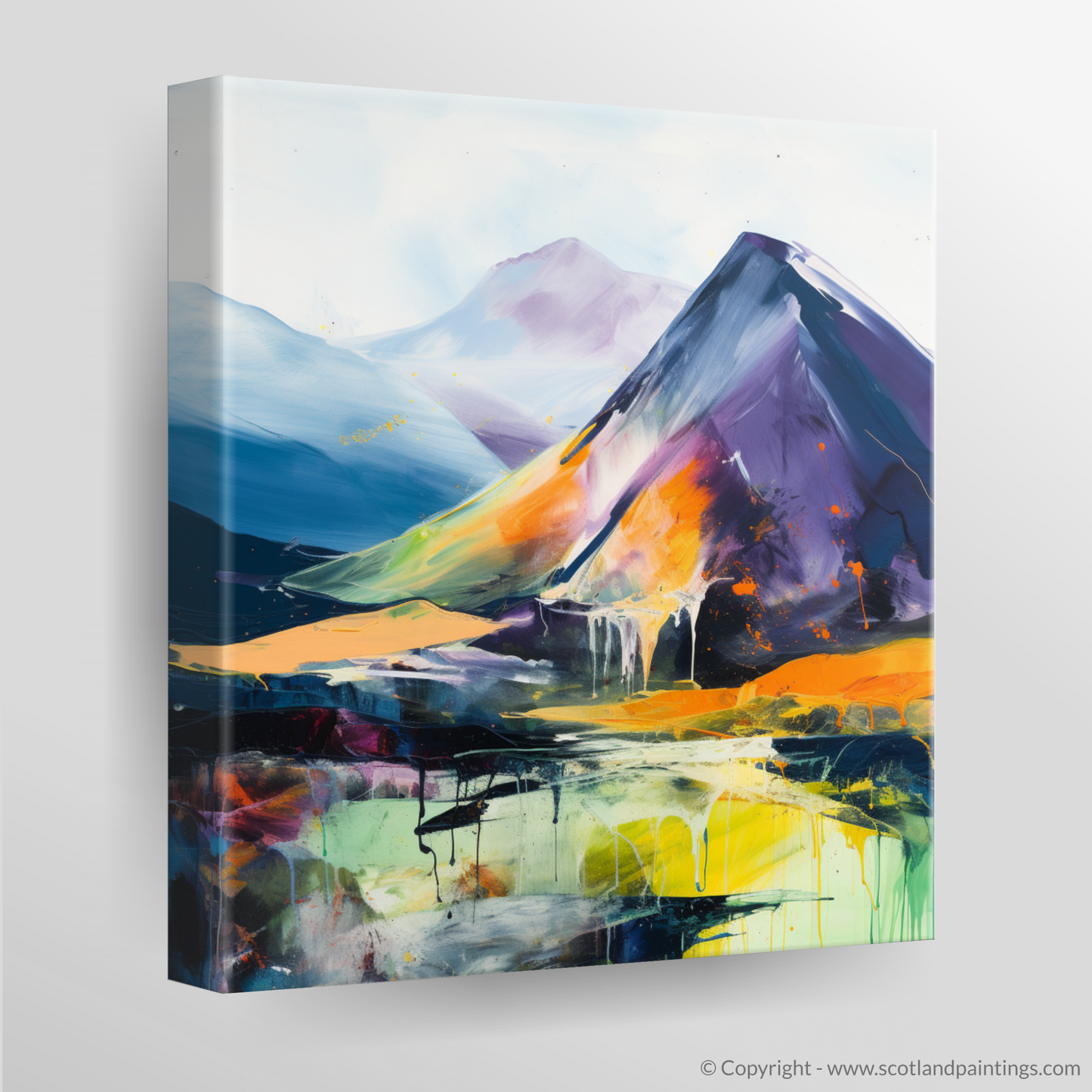 The canvas is a symphony of striking colour, with deep purples and blues recalling the shadowy crevasses and overhangs of the mountain itself. Vivid oranges, yellows, and greens seem to erupt from the canvas, suggesting the dynamic interplay of light and earth, capturing the untamed spirit of the highlands.