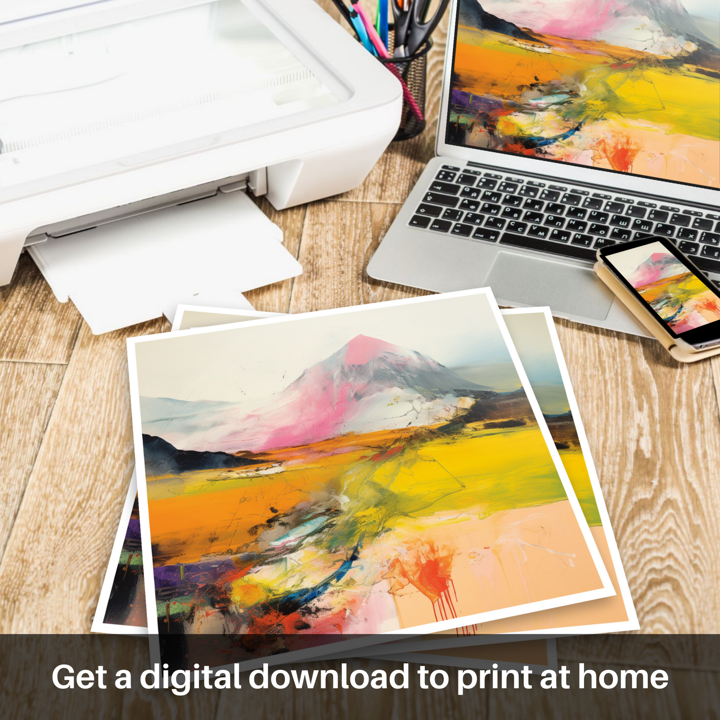Immerse yourself in the vibrant tapestry of colours and emotions with this exquisite abstract rendition of Meall a' Choire Lèith, a jewel in the crown of Scottish Munros. Capturing the raw energy and splendour of the Highlands, this print is a brilliant explosion of hues, where broad strokes and delicate textures converge to evoke the wild beauty of a landscape untouched by time.