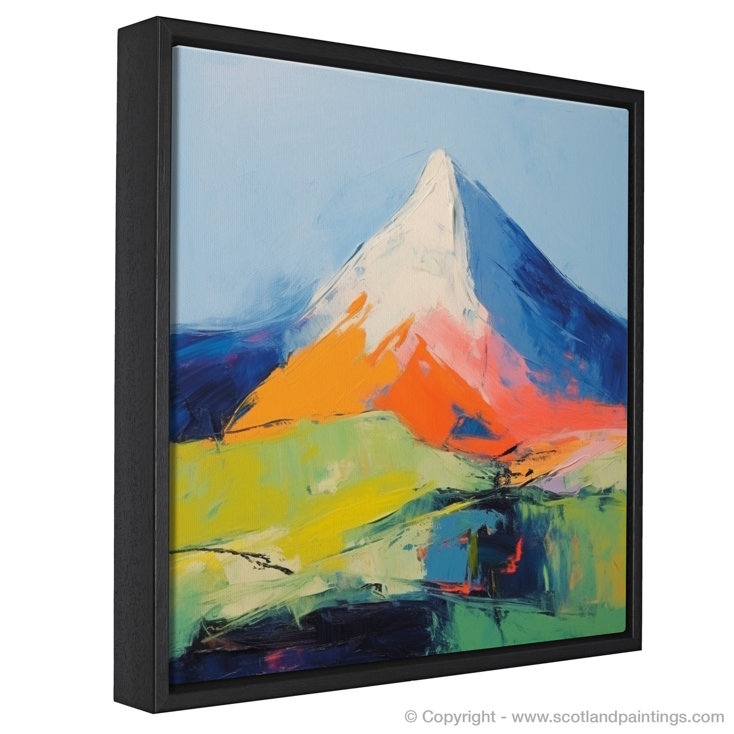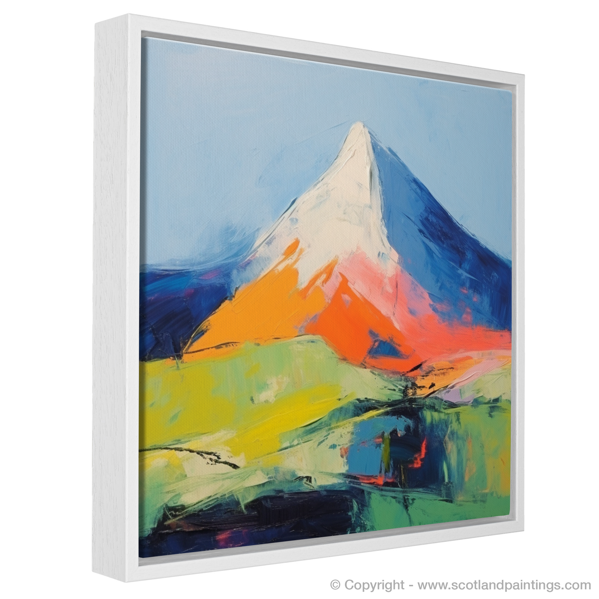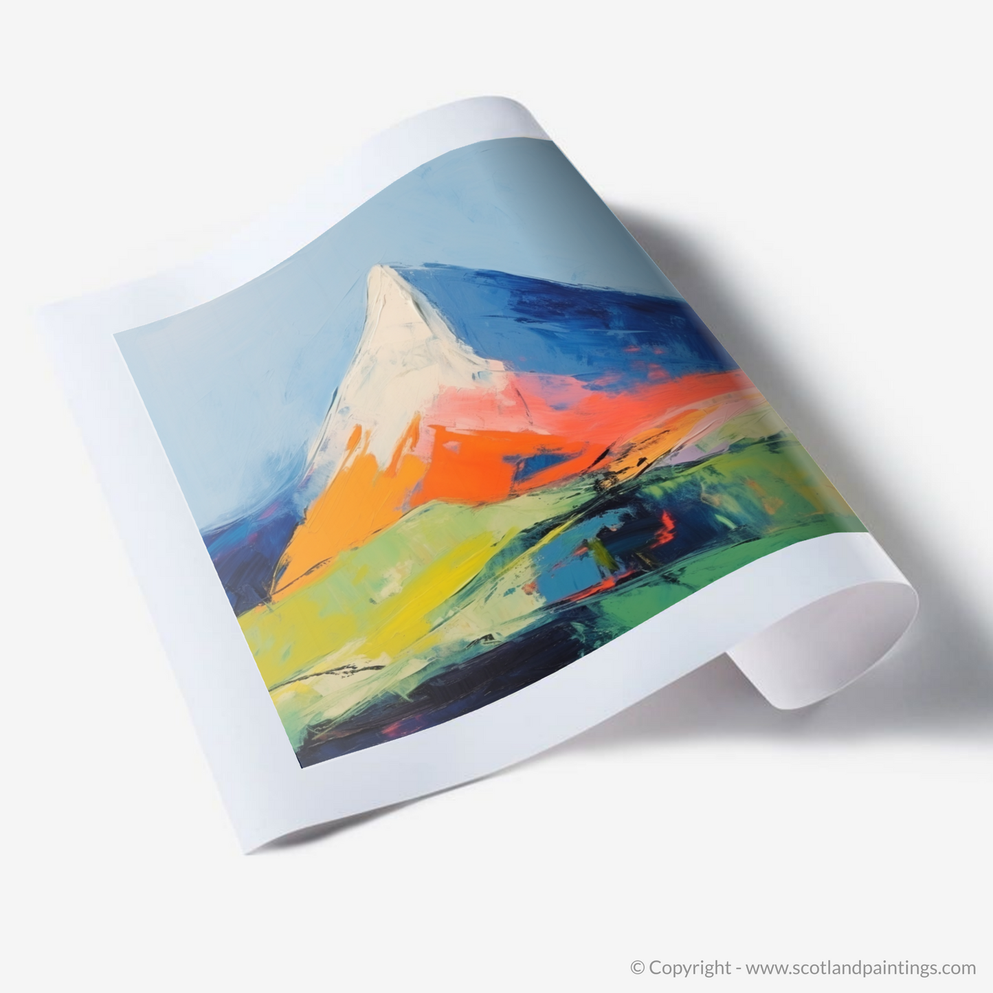 The artwork invites the viewer into a landscape reimagined through vibrant colours and expressive brushstrokes. The peak itself rises triumphantly, enveloped in contrasting shades of stark whites and deep blues, symbolising the snow-capped summit against the sky. Hues of fiery orange and pink at the mountainside suggest the warmth of the sun as it kisses the rocky façades, while swathes of green and yellow in the foreground evoke the wild, untamed moorlands and fertile glens of the surrounding terrain.