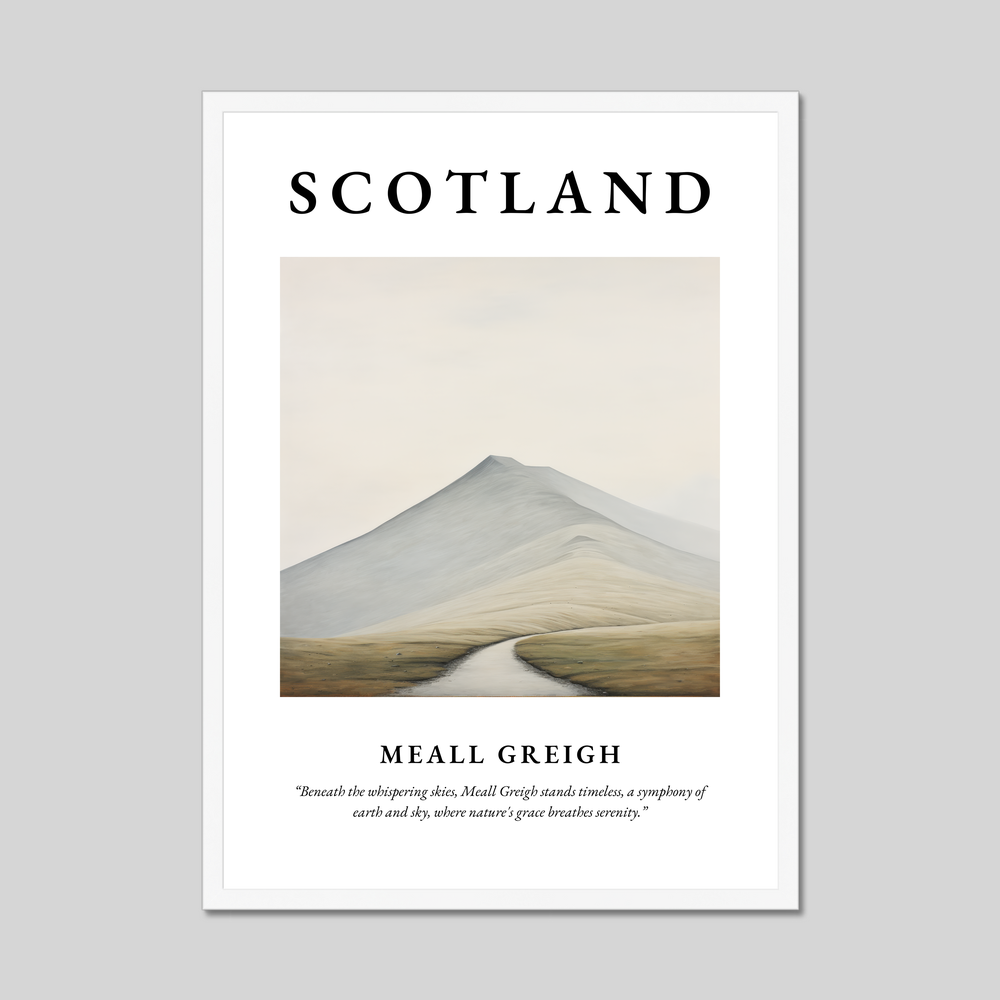 This abstract portrayal of Meall Greigh encapsulates not just the visual splendour of its landscapes, but also the profound sense of peace that envelops those who visit. The artwork invites you into this tranquil world where sky and earth merge effortlessly, capturing the essence of a place where time seems to stand still. Whether you have traversed its paths or dream of doing so, this framed poster serves as a bridge to cherish the wonders of Meall Greigh and the enchanting allure of Scotland itself.