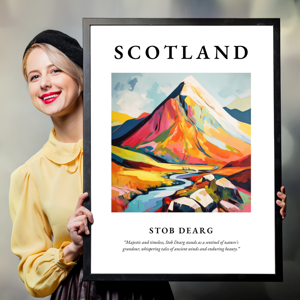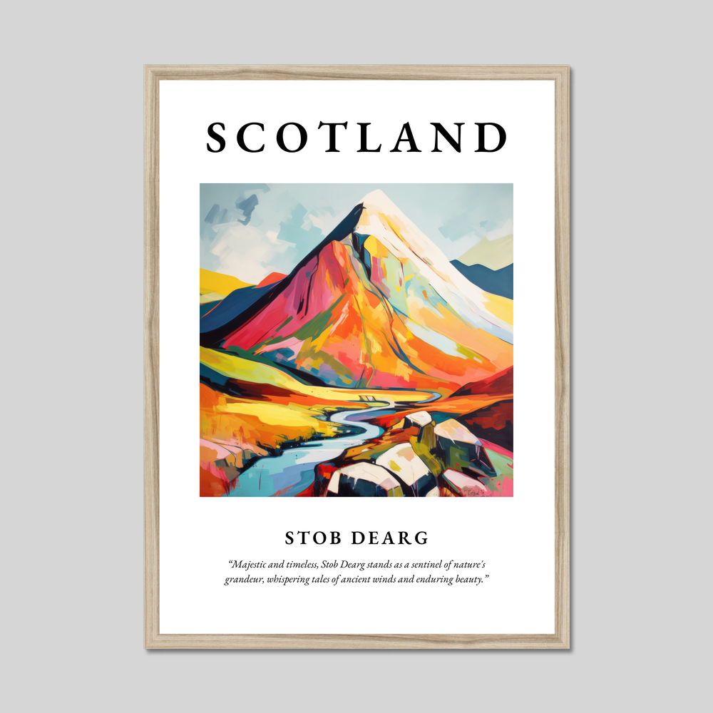 At the top, ‘SCOTLAND’ is prominently displayed in big, bold lettering, immediately drawing the eye and setting the stage for what follows—a mesmerising abstract depiction of Stob Dearg. Beneath this vivid portrayal, the quote reads: "Majestic and timeless, Stob Dearg stands as a sentinel of nature's grandeur, whispering tales of ancient winds and enduring beauty." These words perfectly encapsulate the spirit of the artwork, inviting viewers to pause and reflect.