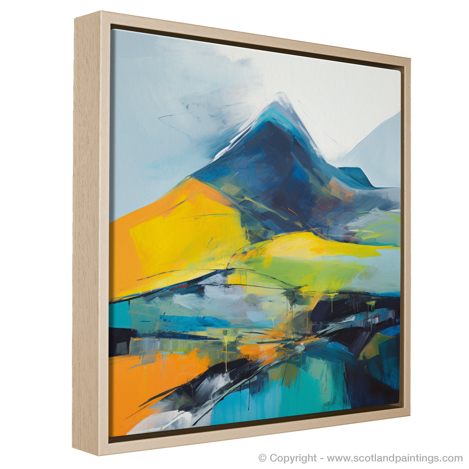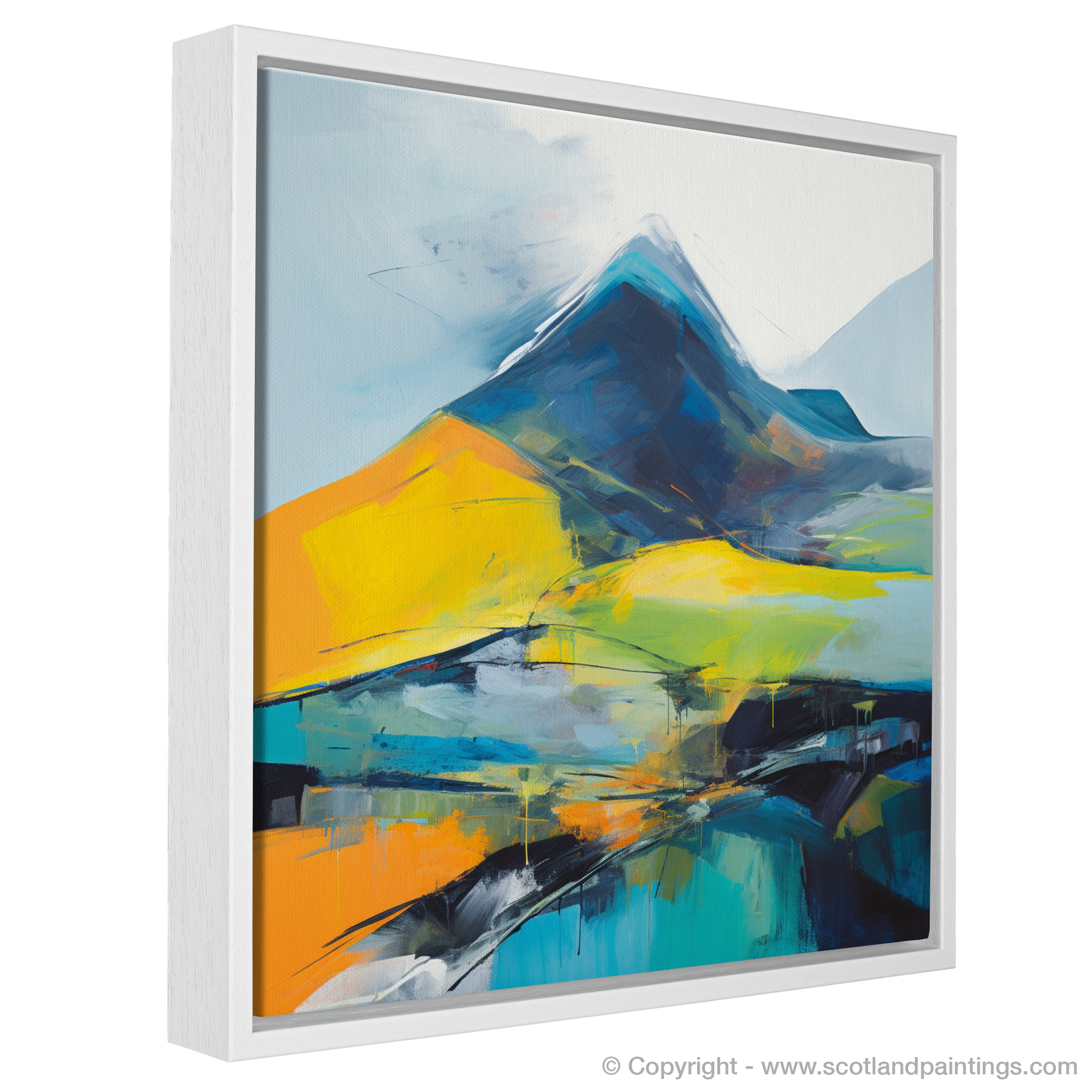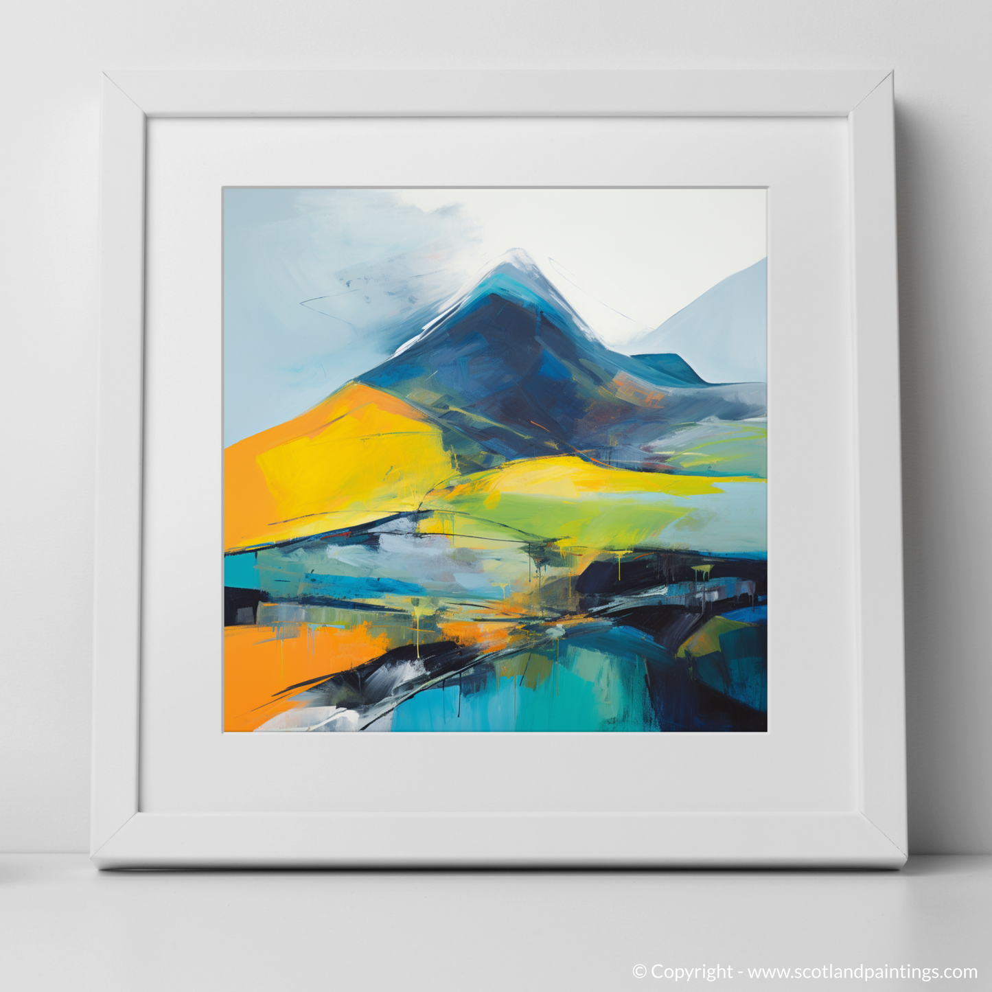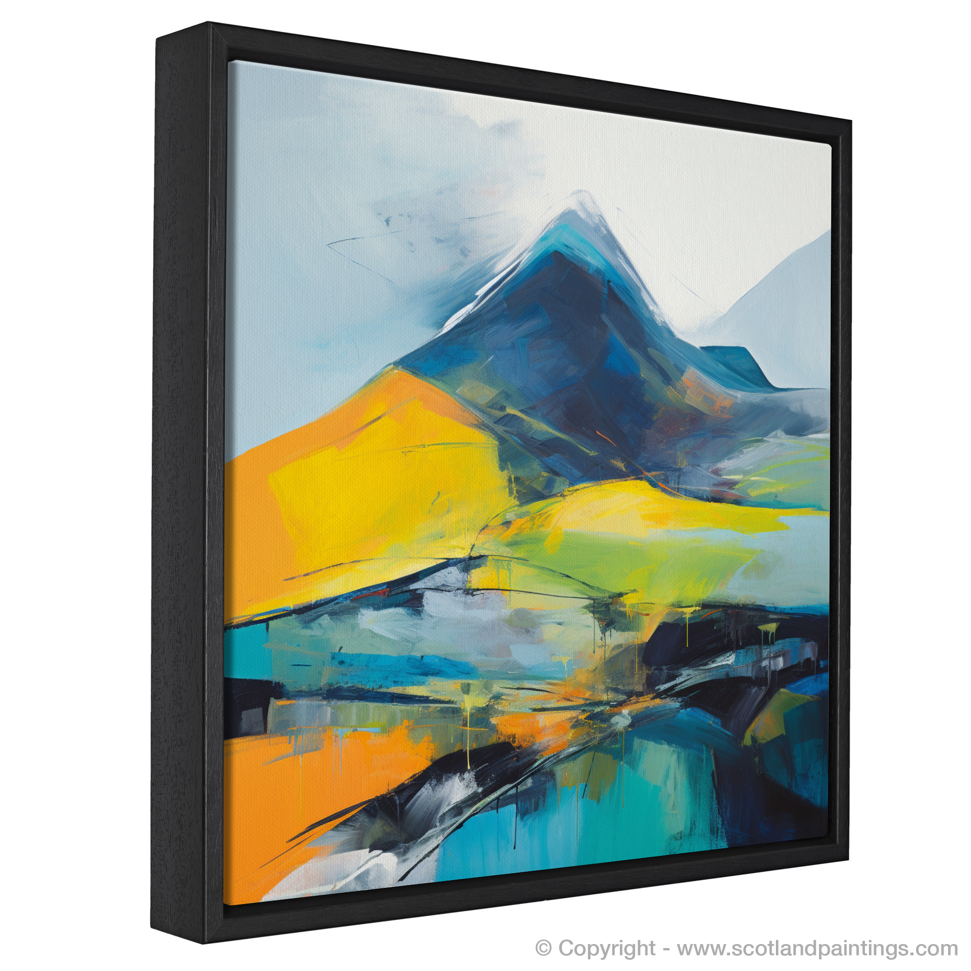 Immerse yourself in the vibrant essence of the Scottish Highlands with our captivating abstract print, inspired by the majestic contours of Beinn Ìme. Swathes of bold orange and luminous yellow dance across the canvas, evoking the raw energy and illumination of dawn's first light cresting over the formidable Munro. Deep blues and blacks are masterfully layered to depict the mountain's rugged slopes, their solidity anchoring the composition with a mysterious depth, reminiscent of the ancient rocks themselves.
