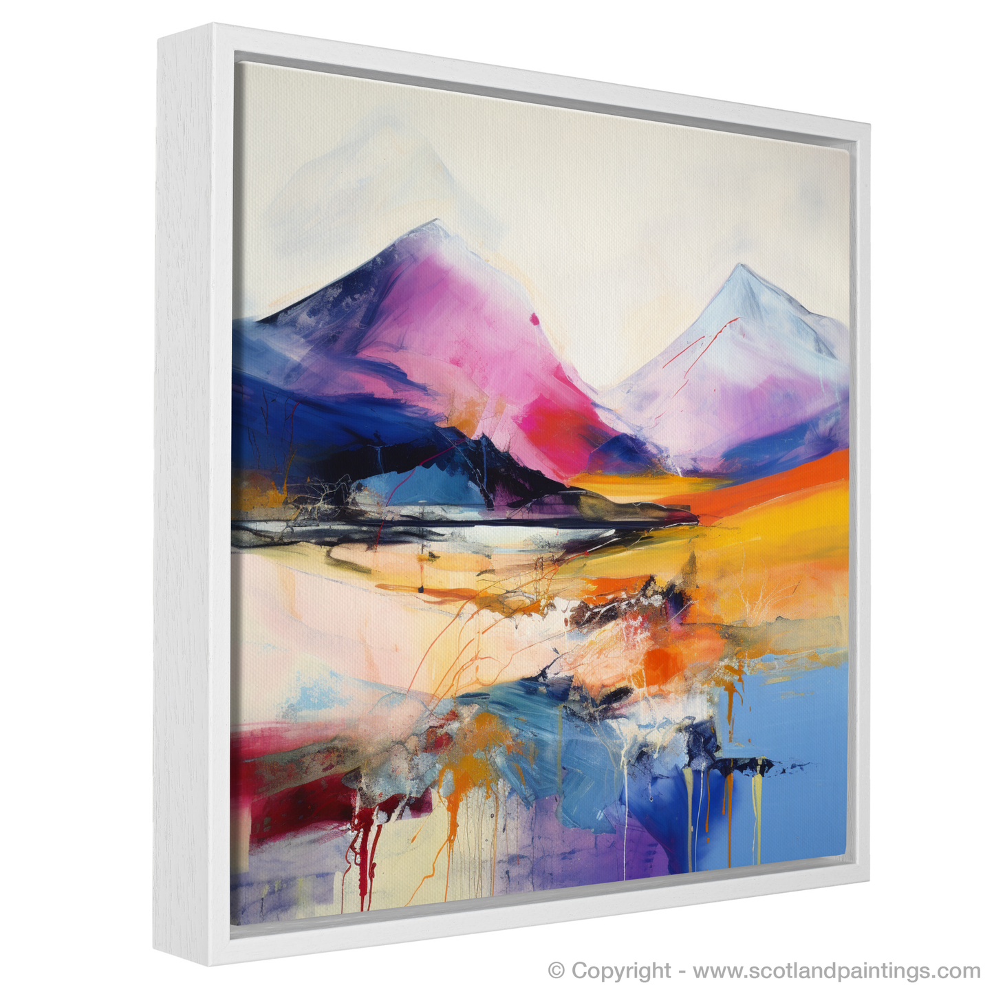 A fluid dance of colour defies conventional forms, with drips and splashes disrupting the landscape, suggesting nature's own unpredictable temperament. Reflections on what might be a mirrored loch are abstracted into a patchwork of soothing blues and gentle whites. The painting, a dynamic slice of Scotland's natural grandeur, promises to add intrigue and a splash of the sublime to any interior.