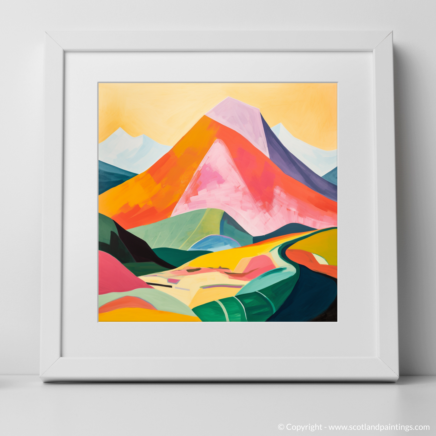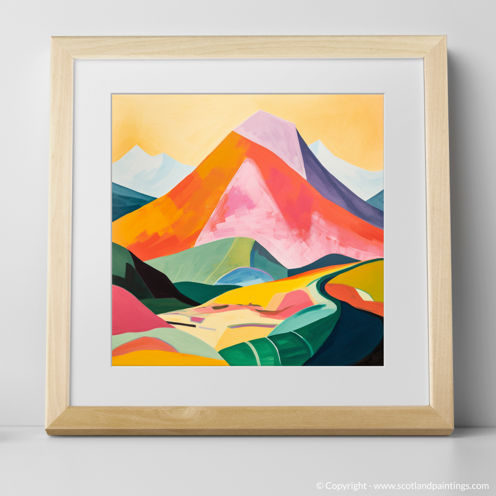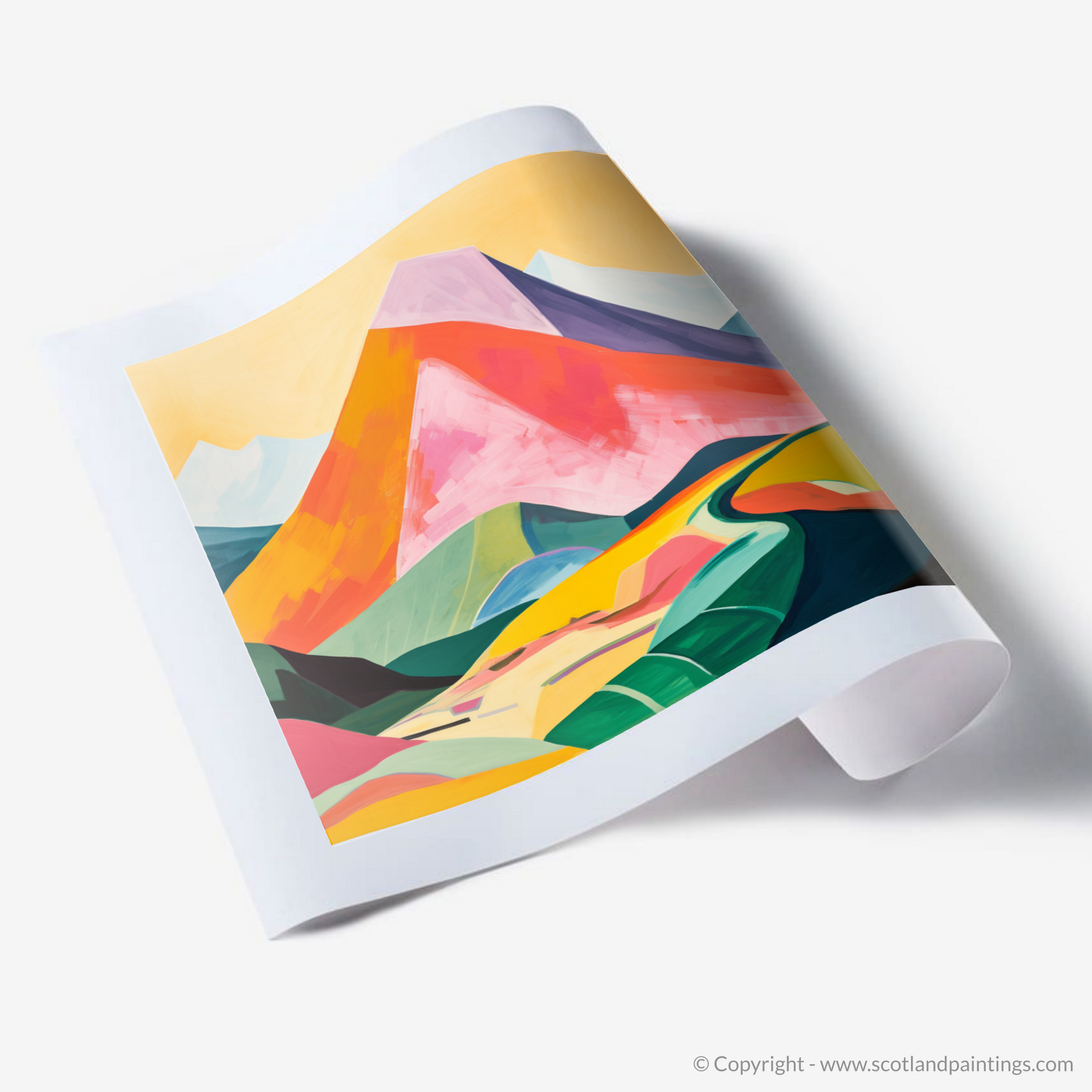 Captivating the essence of Stob Binnein through a kaleidoscope of abstract hues, this evocative print presents the majestic Scottish Munro in a symphony of vibrant colours that challenge the traditional landscapes of the Scottish Highlands. Bold strokes of coral pink and tangerine dominate the peaks, symbolising the dramatic play of light at sunrise or sunset, while the sweeping valleys are rendered in a patchwork of verdant greens, sunny yellows, and deep purples.