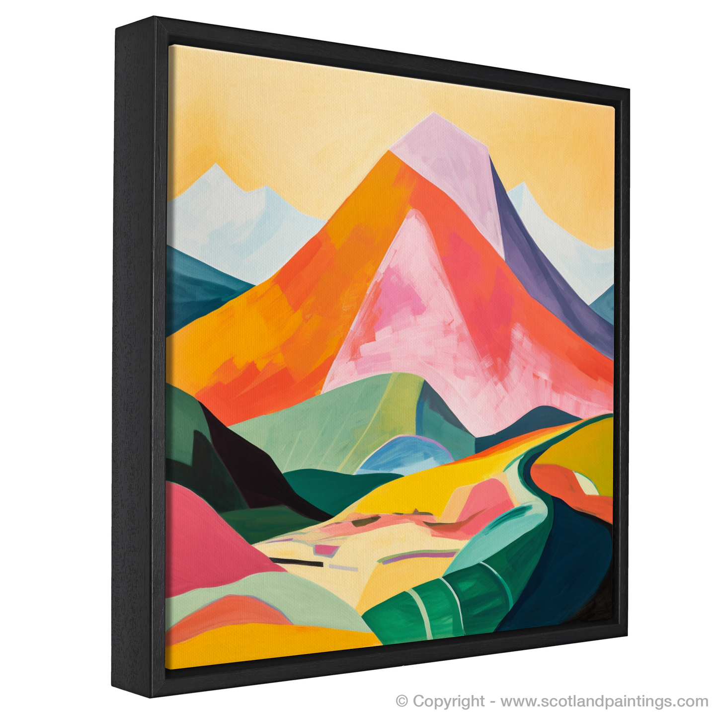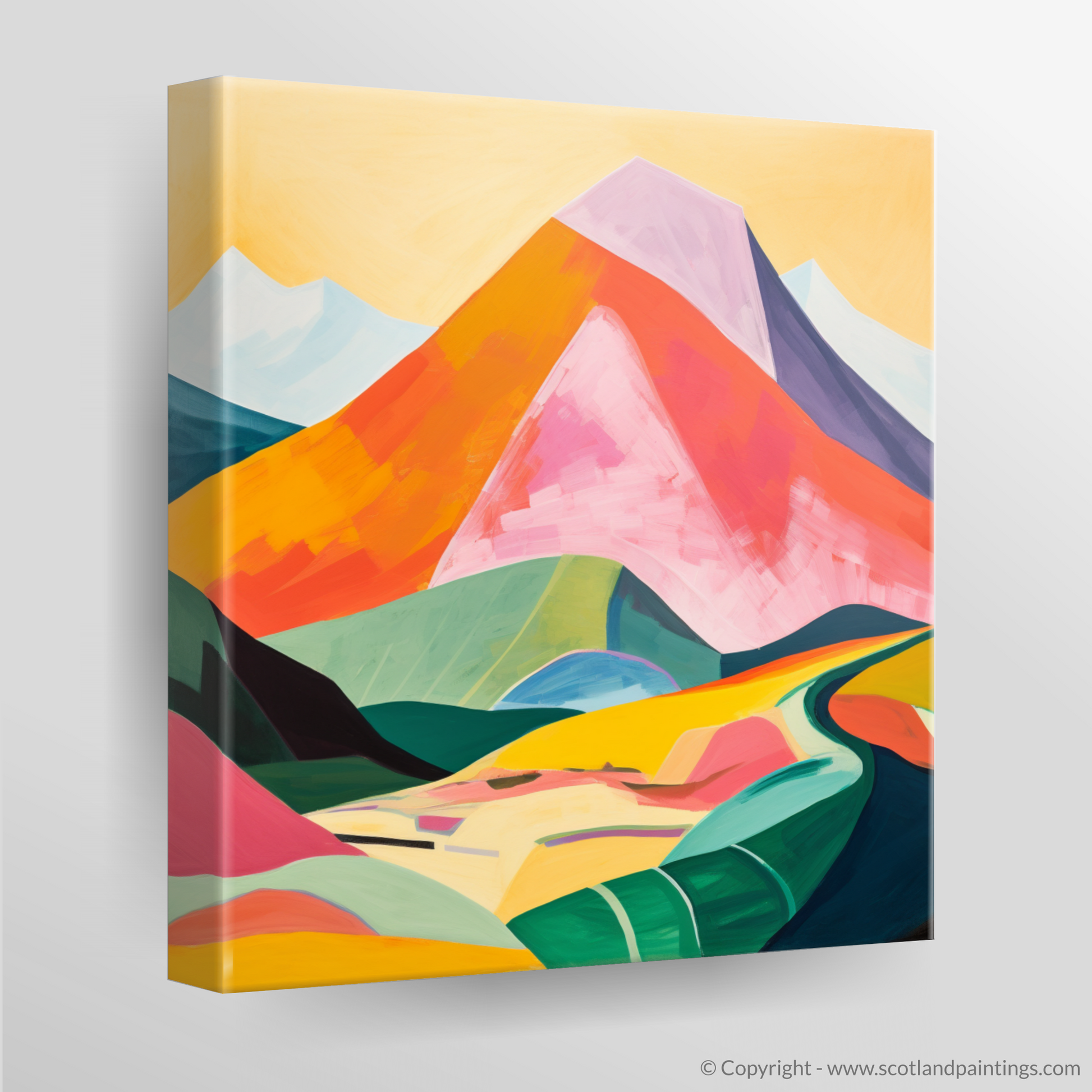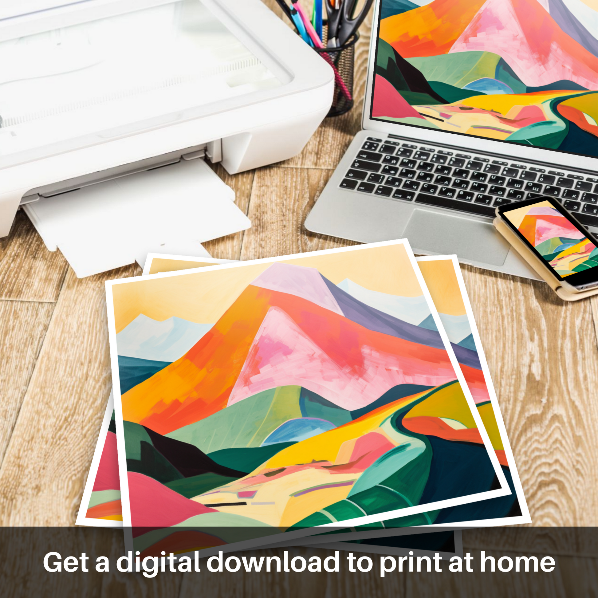 Captivating the essence of Stob Binnein through a kaleidoscope of abstract hues, this evocative print presents the majestic Scottish Munro in a symphony of vibrant colours that challenge the traditional landscapes of the Scottish Highlands. Bold strokes of coral pink and tangerine dominate the peaks, symbolising the dramatic play of light at sunrise or sunset, while the sweeping valleys are rendered in a patchwork of verdant greens, sunny yellows, and deep purples.