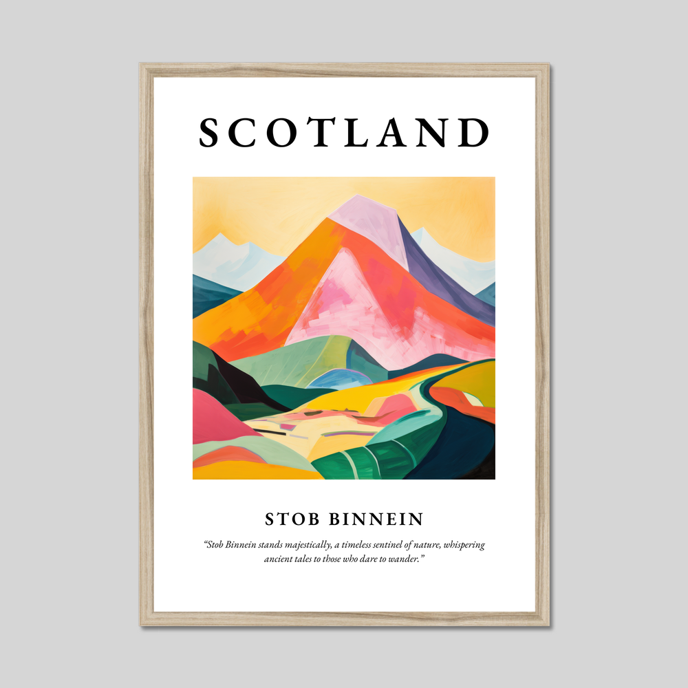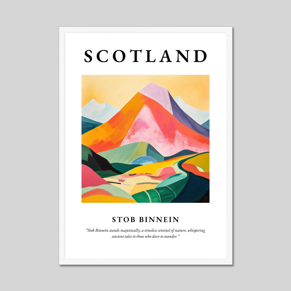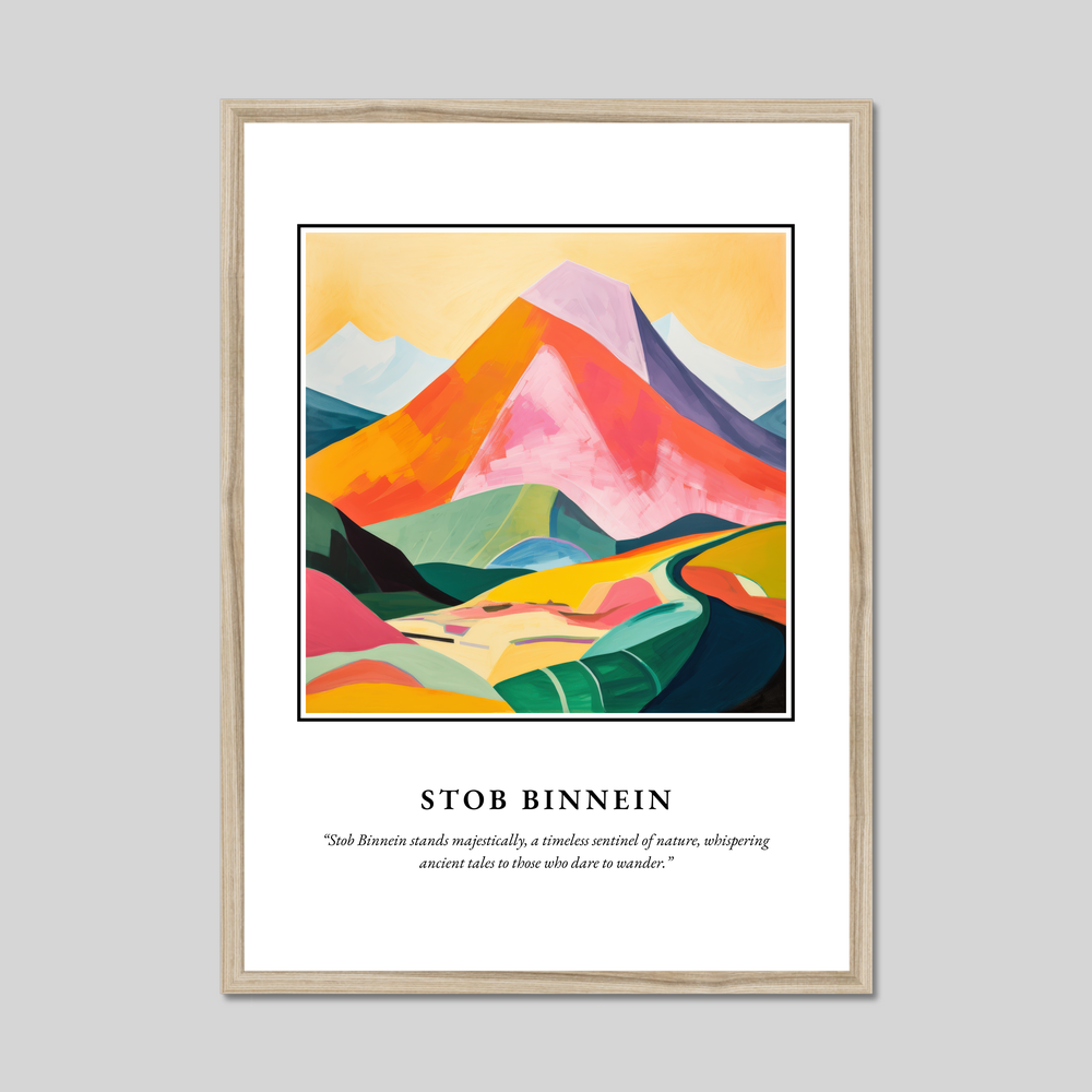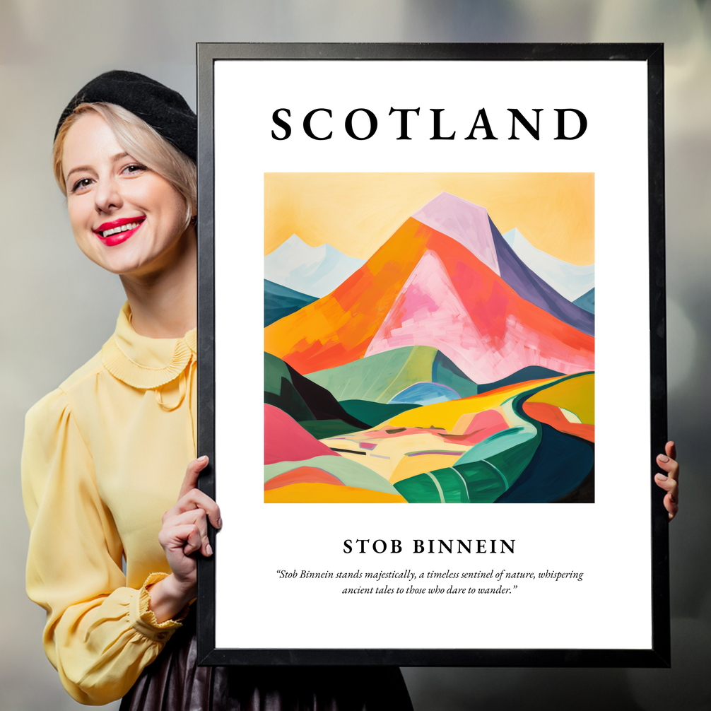 The word “SCOTLAND” crowns the artwork, boldly embracing the profound essence of the highlands. Beneath, an evocative representation of Stob Binnein unfolds in vibrant swathes of colour, where luscious greens meet a spectrum of warm hues. This abstract interpretation captures the mountain's soul, echoing its natural allure while leaving room for personal reflection. The quote, “Stob Binnein stands majestically, a timeless sentinel of nature, whispering ancient tales to those who dare to wander,” adds a poetic embrace that ties your appreciation of the art to the mystique of the landscape.