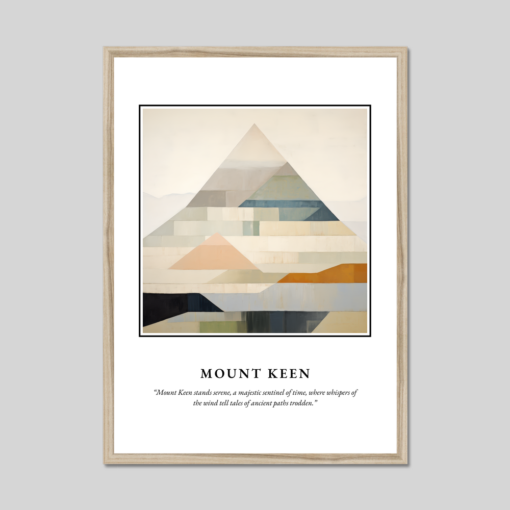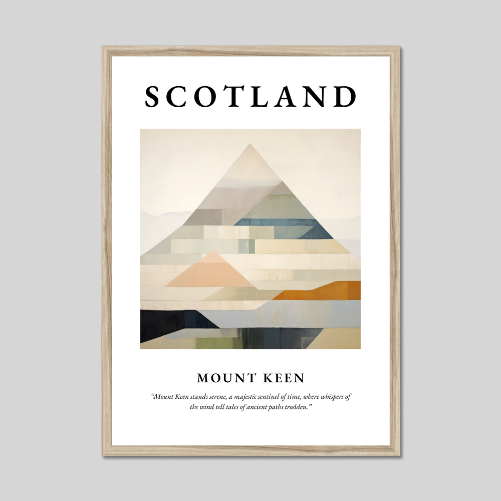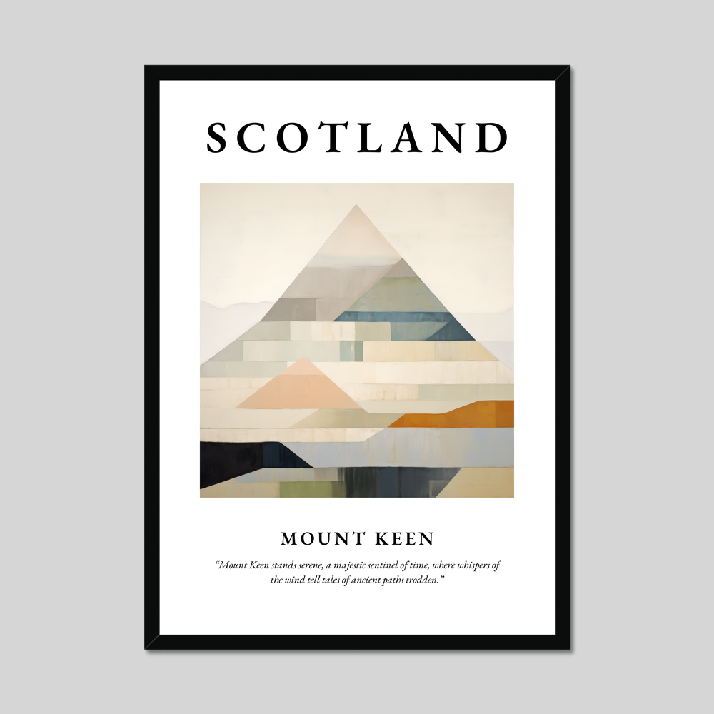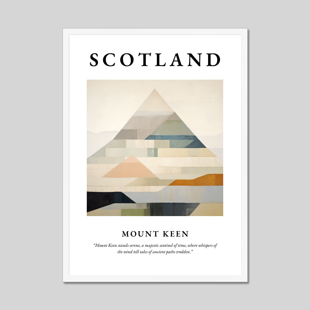 The bold lettering of "SCOTLAND" at the top sets the scene, drawing you into the heart of this captivating land. Below, an abstract painting of Mount Keen takes centre stage, where subtle geometrical patterns intertwine in earthy tones and muted pastels. These intersecting forms create a modern yet timeless interpretation, perfectly depicting the mountain's tranquil beauty.