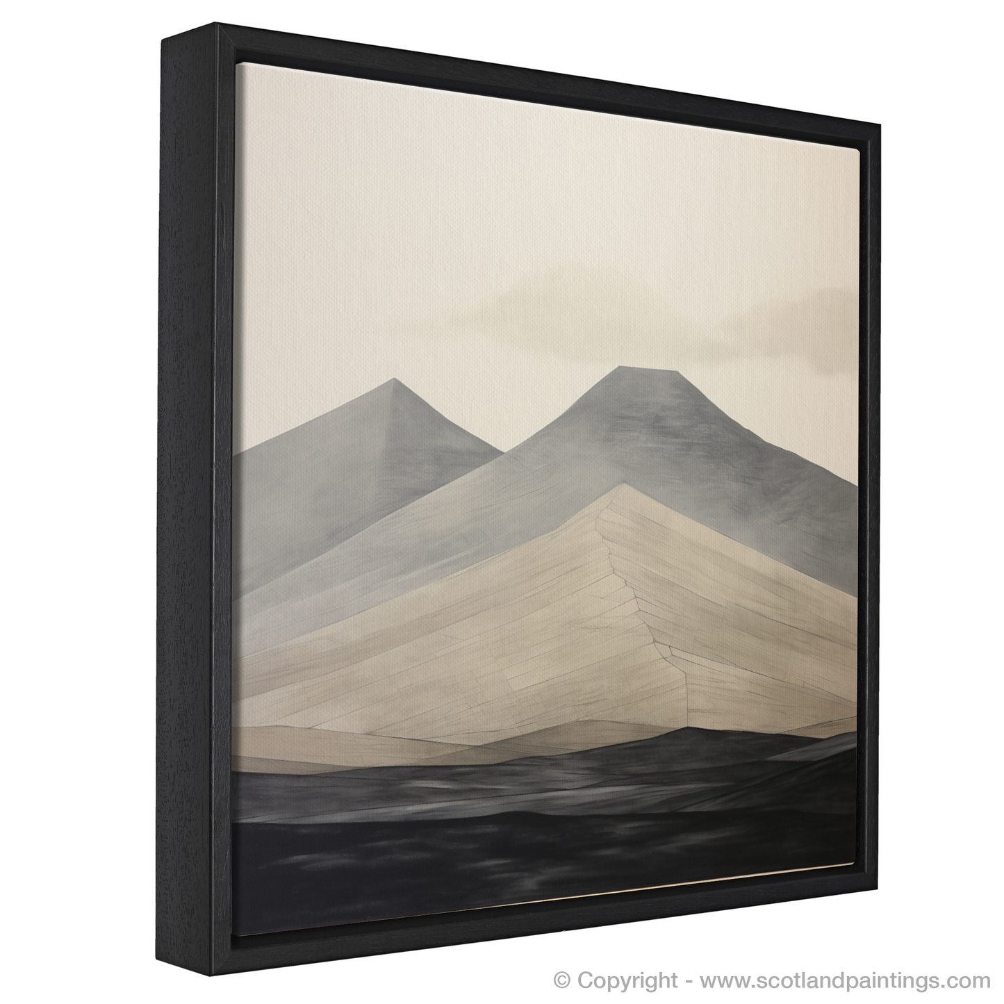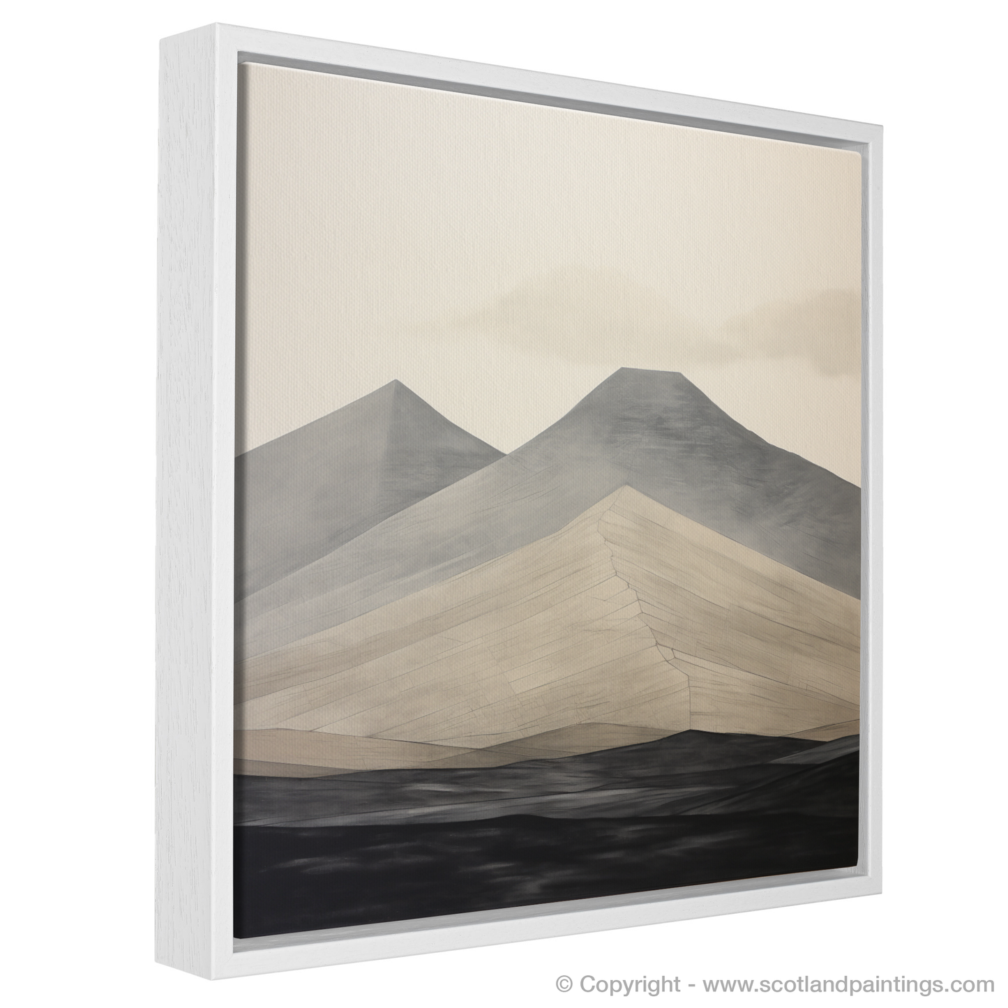 The composition is masterfully balanced, with jagged edges and smooth expanses, capturing the interplay between light, shadow, and the textures of the mountainous terrain. This minimalist approach invites the observer to ponder the mountain's solitude and enduring beauty, offering a contemporary lens through which to view Scotland's timeless landscapes. A perfect centrepiece for lovers of modern art and the wild Scottish outdoors, this abstract piece is a celebration of natural shapes distilled into their most elemental form.