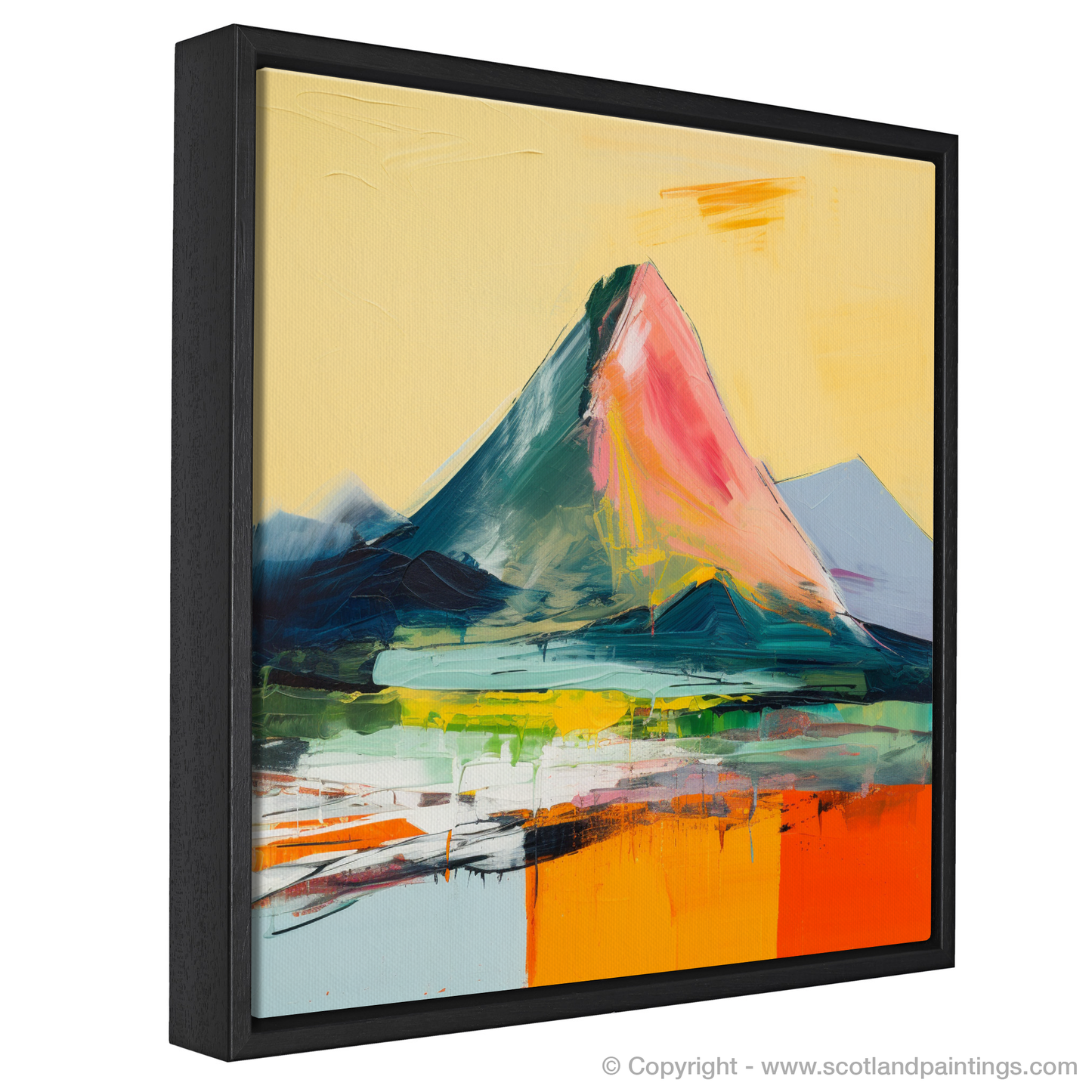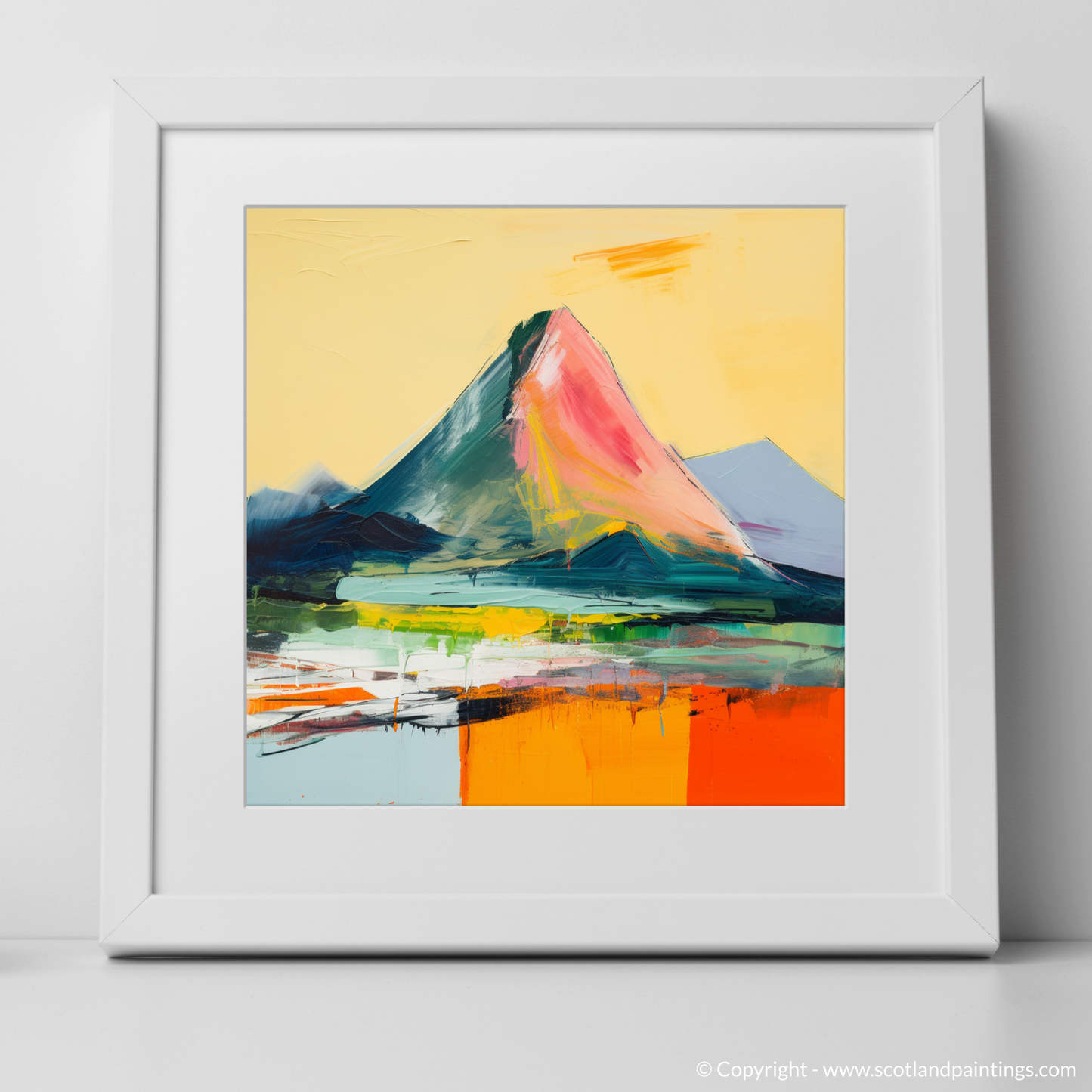 The foreground of the artwork is marked by a dramatic contrasting spectrum, where fiery oranges and deep reds lay against a tranquil white, evoking the raw elements that shape the land. An array of expressive marks and drips adds a sense of movement and energy, as if the very forces of nature were captured mid-motion. This print invites not just a glance, but a lingering gaze, encouraging the viewer to explore the depths of its textures and hues, and to lose themselves in the abstract beauty of one of Scotland's most iconic natural wonders. Each piece from our Scottish Munros collection is a tribute to the wild and rugged spirit of the Highlands, and this print entices with its bold interpretation and exhilarating chromatic play.