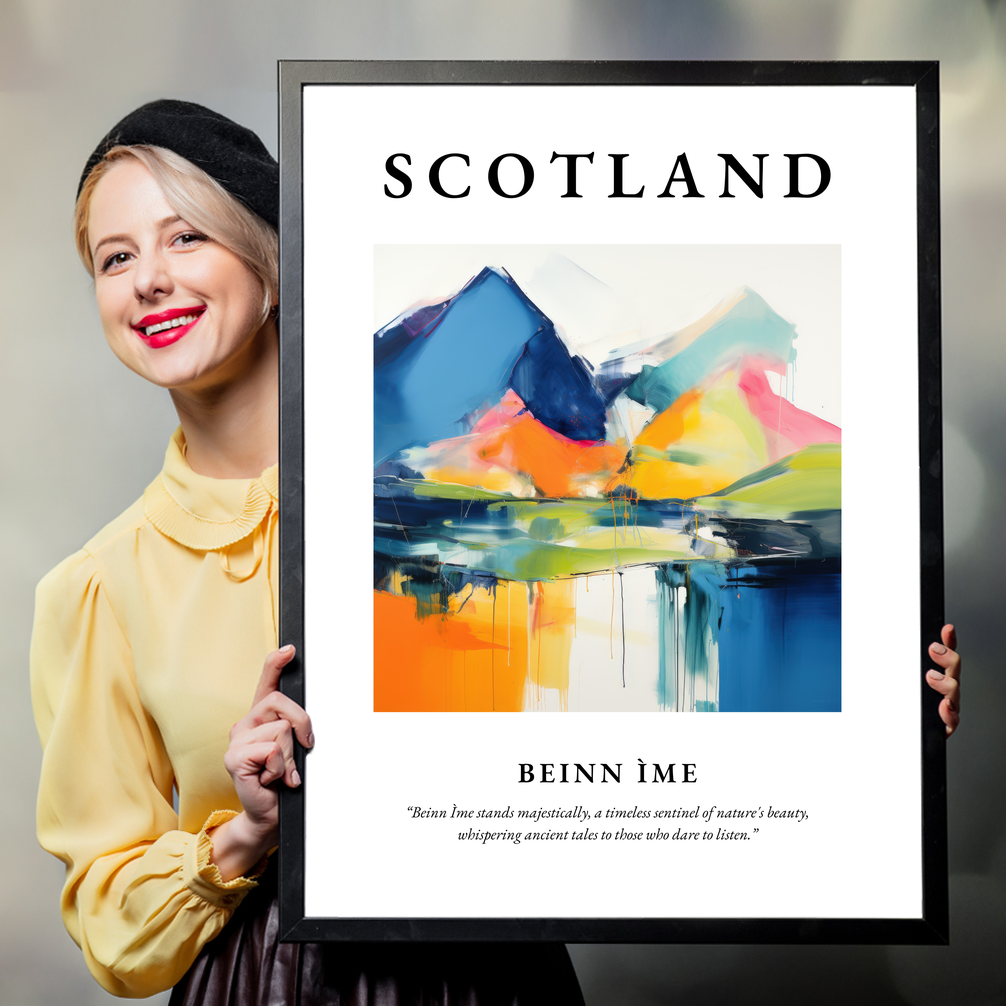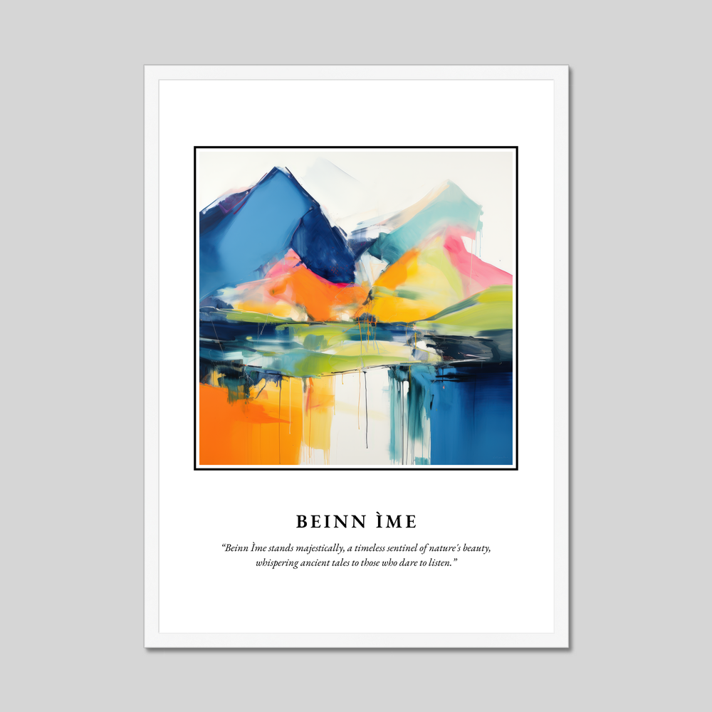 The vibrant artwork pulsates with expressive brushstrokes and a vivid palette, capturing the raw beauty and rugged essence of Beinn Ìme in an abstract style. With sweeping blues and fiery oranges merging into softer greens and yellows, this piece evokes the mountain’s dramatic landscapes and ever-changing weather. Below this dynamic imagery, you’ll find the evocative quote: “Beinn Ìme stands majestically, a timeless sentinel of nature's beauty, whispering ancient tales to those who dare to listen.”