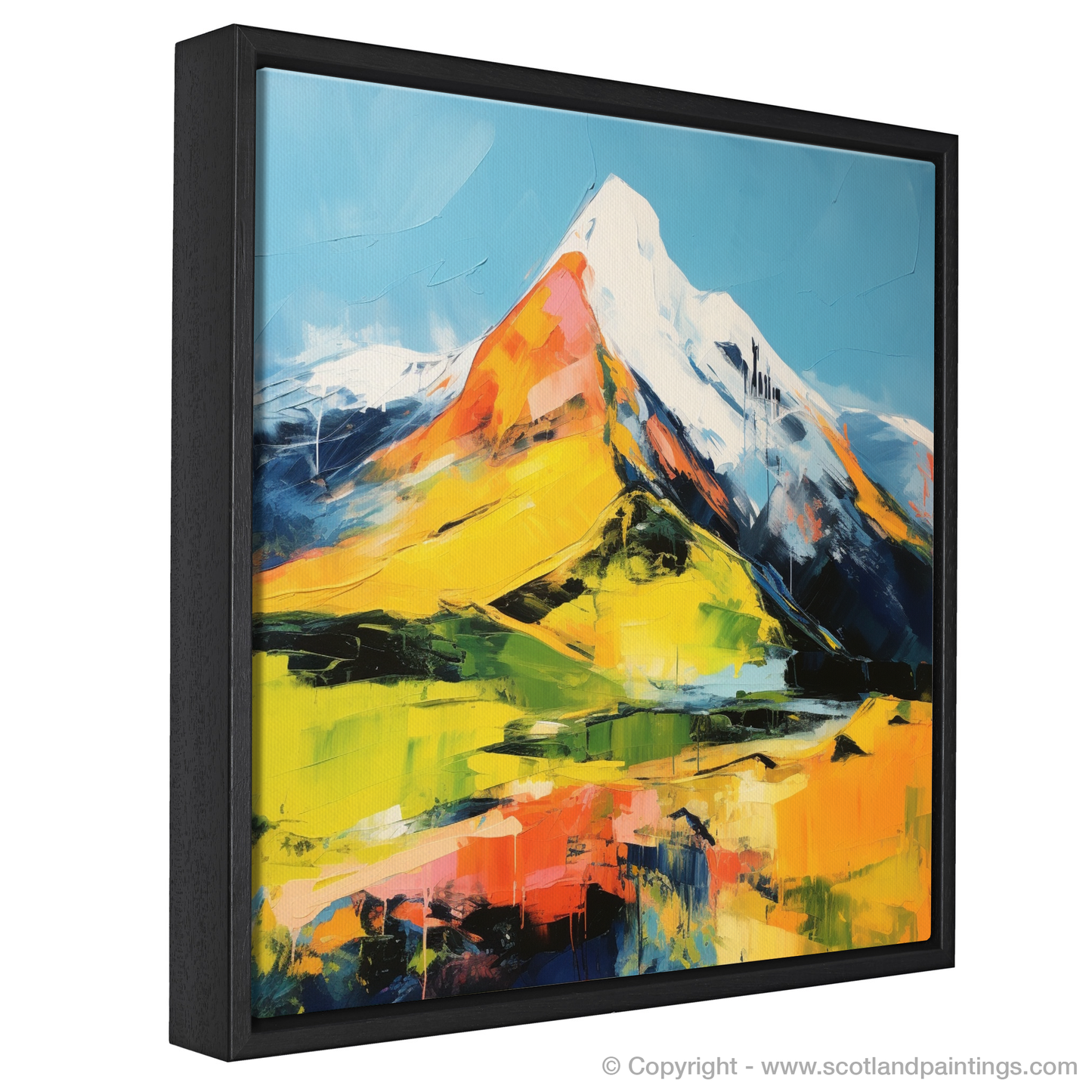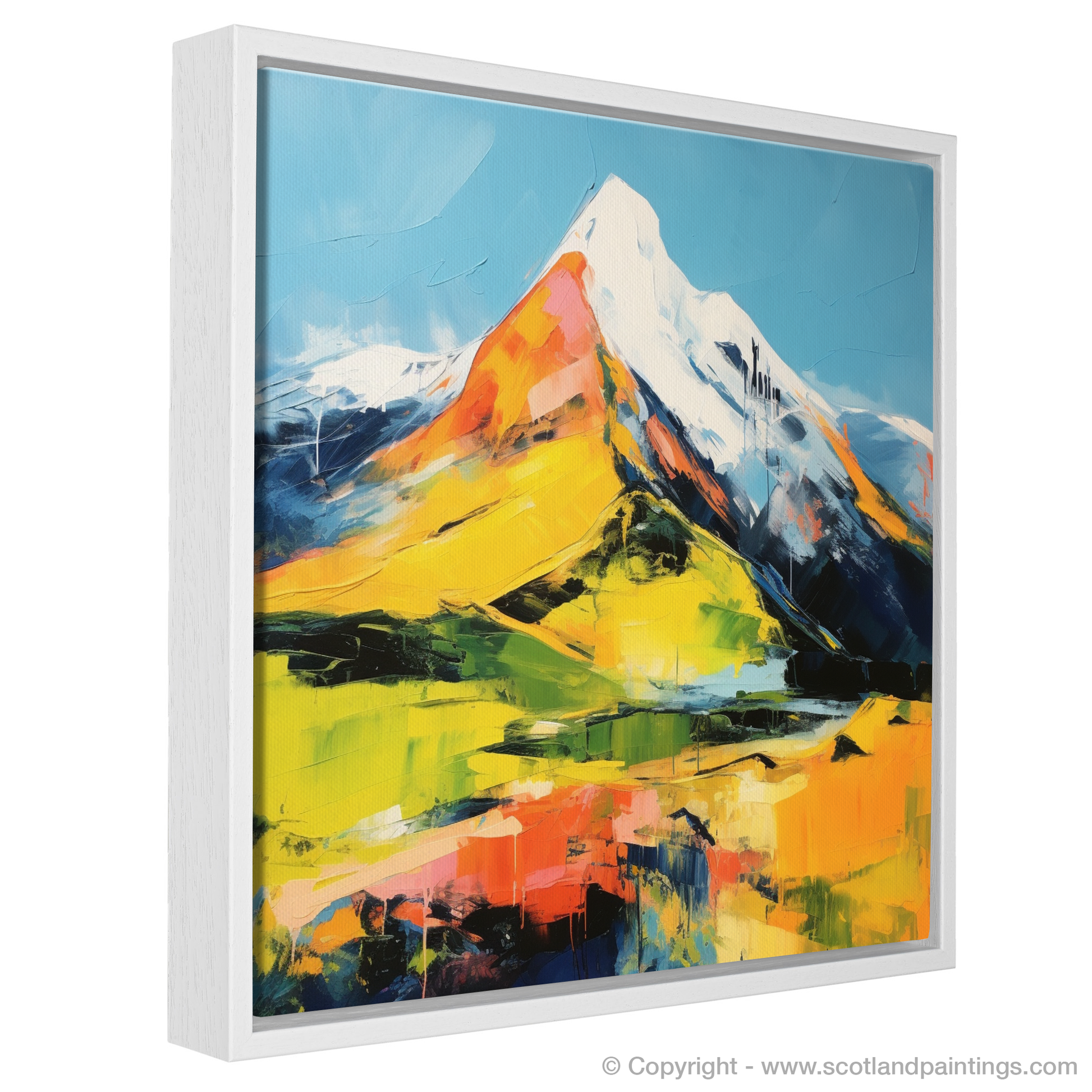 The composition harnesses the essence of abstraction, allowing the interplay of colour and form to take centre stage. With an unbound creativity, shapes coalesce into an impression of Buachaille Etive Mòr's iconic outline, while splashes and drips of paint introduce an element of spontaneity and movement. This artistic approach invites viewers to engage their imagination and their personal connection to the wild Scottish landscape.