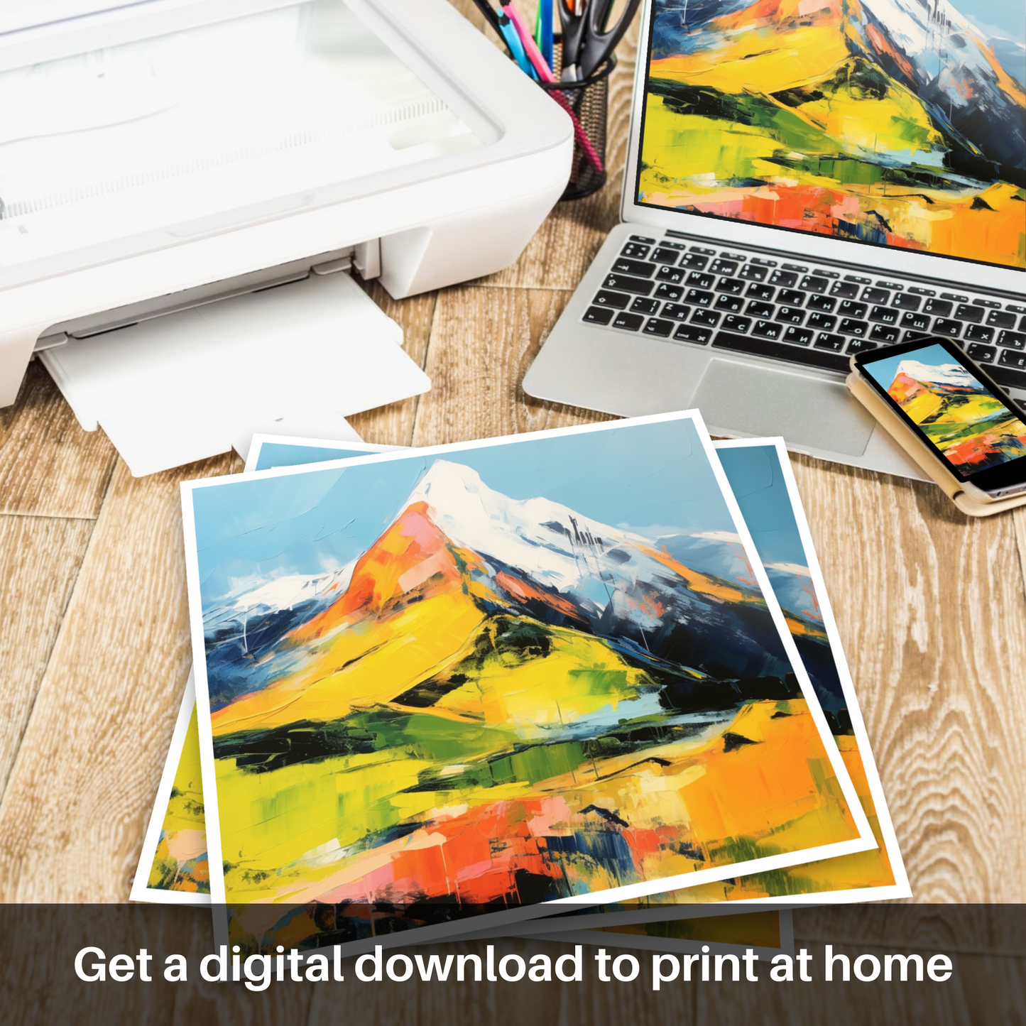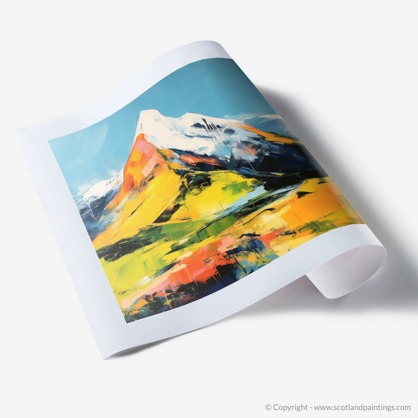 This print is an integral piece of our 'Scottish Munros' collection, offering a unique and contemporary visual experience that pays homage to Scotland's natural grandeur. It is a statement piece that will bring a burst of colour and a touch of Highland drama to any space, appealing to lovers of modern art and the untamed beauty of Scotland's mountainous regions alike.