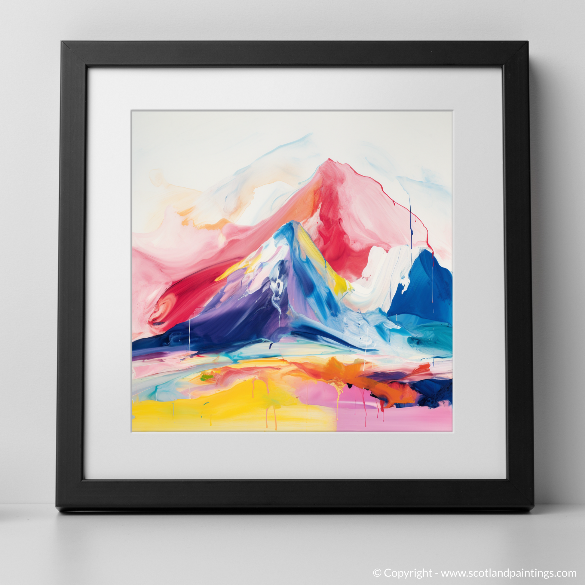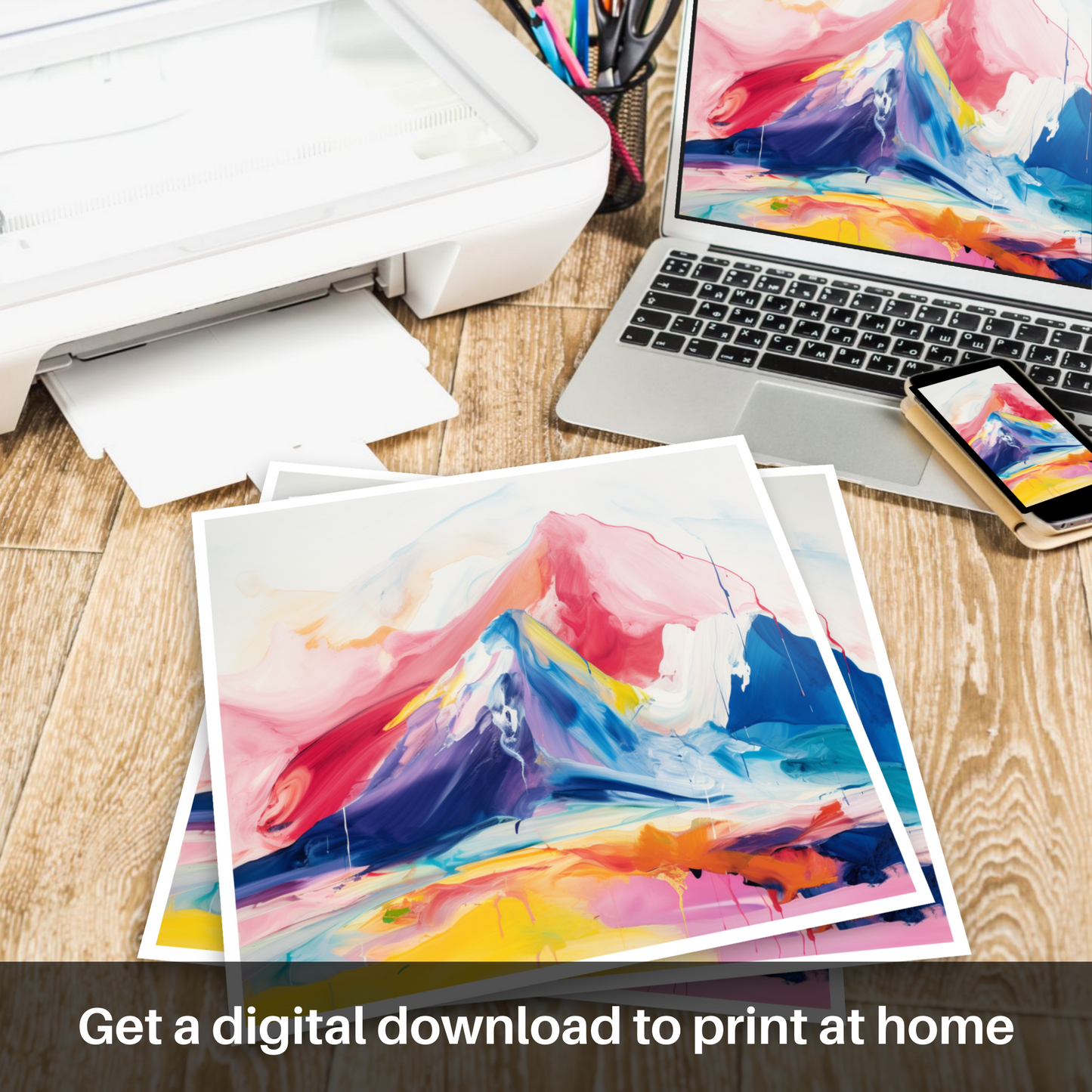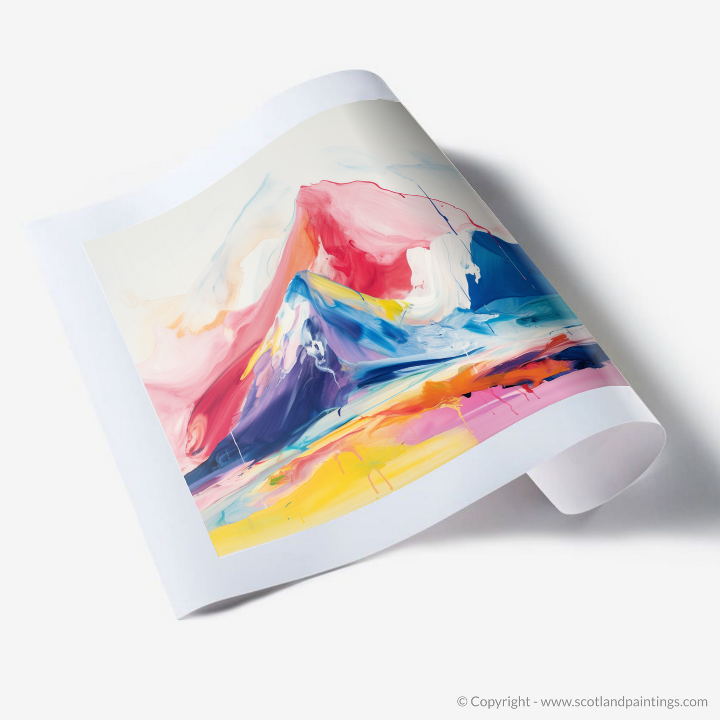Embark on a visual journey through the Scottish Highlands with our captivating abstract print, inspired by the formidable presence of Ben More. This piece masterfully captures the spirit of the majestic Munros through a vibrant palette and expressive brushstrokes that dance across the canvas. Swirls of pink and coral hues evoke the dramatic skies often witnessed at the summit, while the cool blues and purples suggest the shadows and textures of the mountain's rugged terrain.