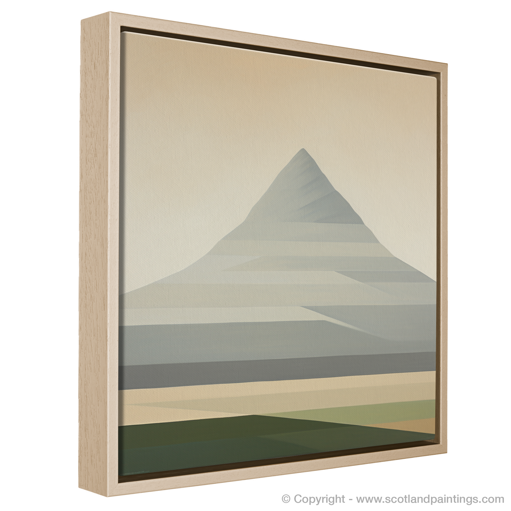 At the heart of the composition, the stylised mountain rises sharply, its form reduced to a series of geometric planes that evoke the shifting light and shadow across the mountain's facets. The summit, depicted in gentle shades of grey, gives way to striated bands of layered hues, each one a testament to the diverse palette of the highland terrain, ranging from the deep earth tones at the base to the muted heathers and soft greens that characterise the lower slopes. The foreground presents a bold contrast of dark green, suggesting the rich, verdant valleys that typically encircle these towering peaks.