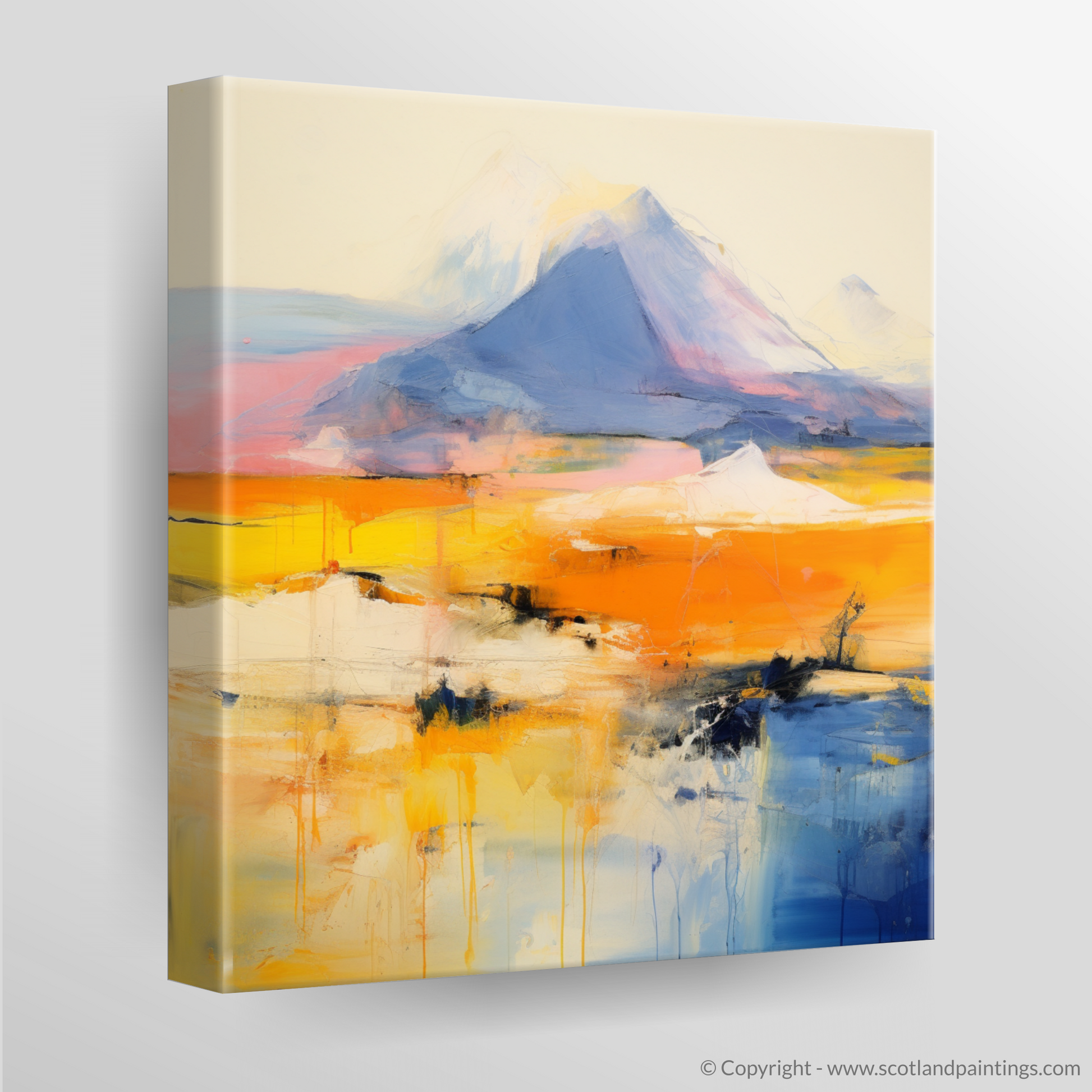 The towering silhouette of the Munro is depicted in shades of blue and white, suggesting a grandeur that is both imposing and ethereal. Below, the canvas explodes with the warmth of a sunset, a feast of oranges and yellows bleeding into one another, evoking the dramatic end of a day spent amongst the peaks. The horizon is a dance of colours, with strokes of pink and pale blues hinting at the delicate interplay of light and sky, typical of the Scottish vistas.