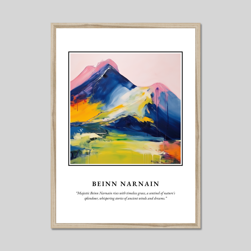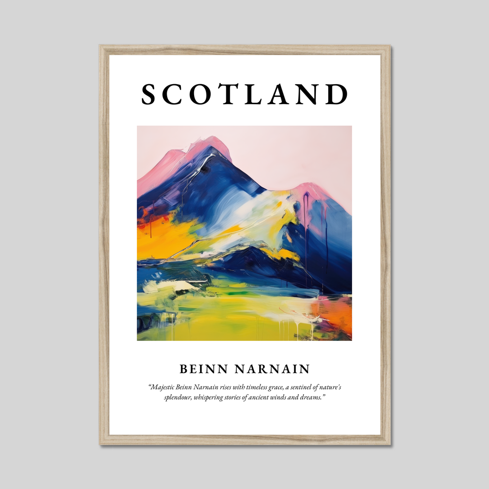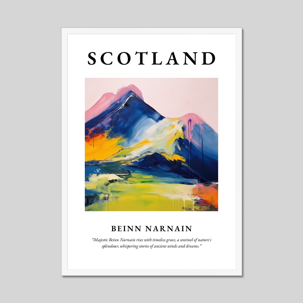 The word “SCOTLAND” crowns this elegant print in bold lettering, a proud declaration for anyone who feels a connection to this breathtaking country. Below, the abstract painting of Beinn Narnain is a vivid play of colours that invites you to lose yourself in its depths. Swirling shades of blue and pink meld into vibrant yellows and greens, capturing the essence of the mountain's rugged grandeur as it meets the sky, inviting viewers to interpret and explore its mysteries. Beneath this stunning visual is the poignant quote: “Majestic Beinn Narnain rises with timeless grace, a sentinel of nature's splendour, whispering stories of ancient winds and dreams.” This encapsulates the spirit of the piece, making it a meaningful addition to any art lover's collection or for those with a personal link to this sacred landscape.