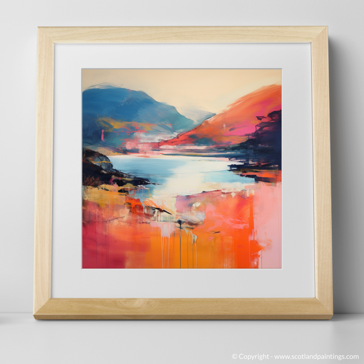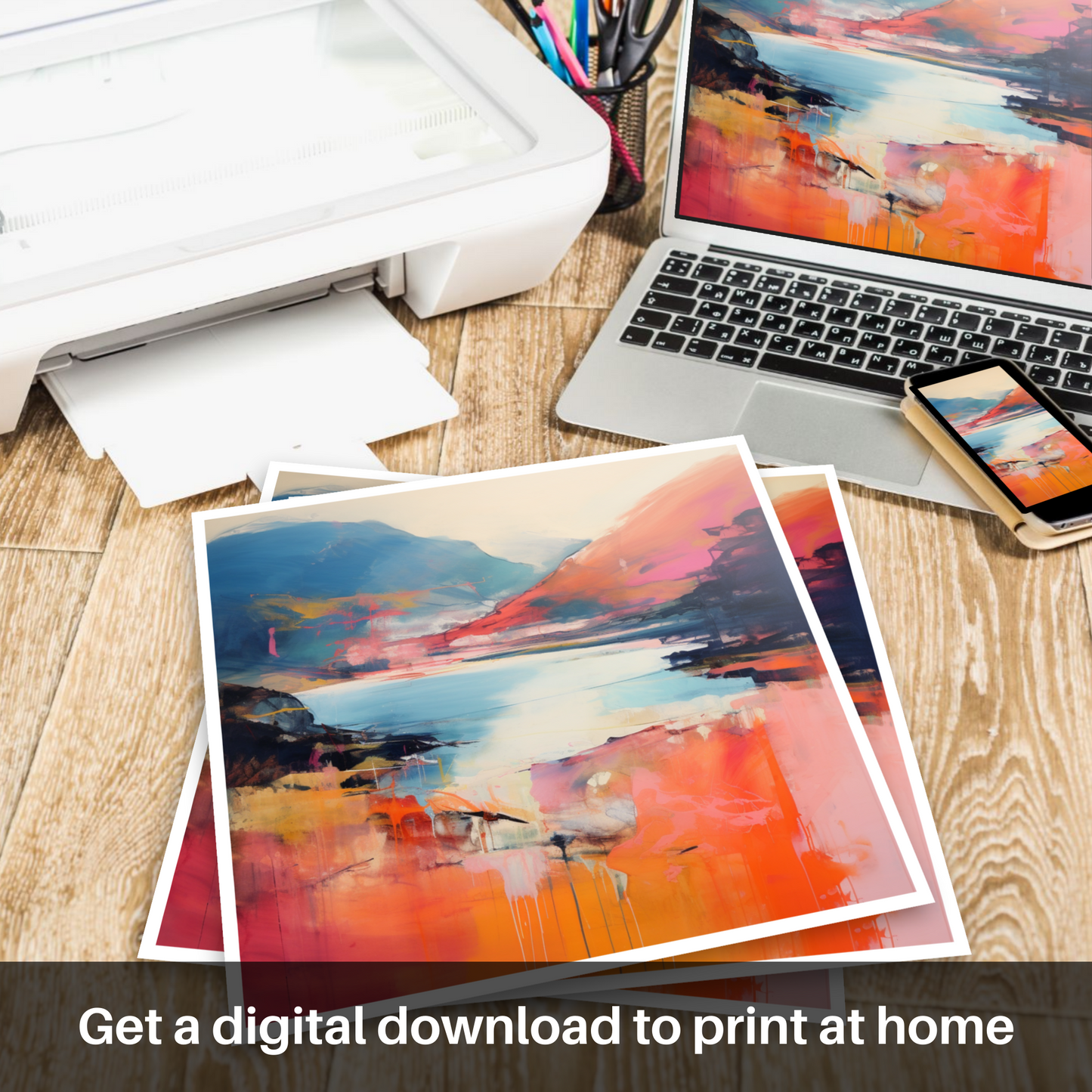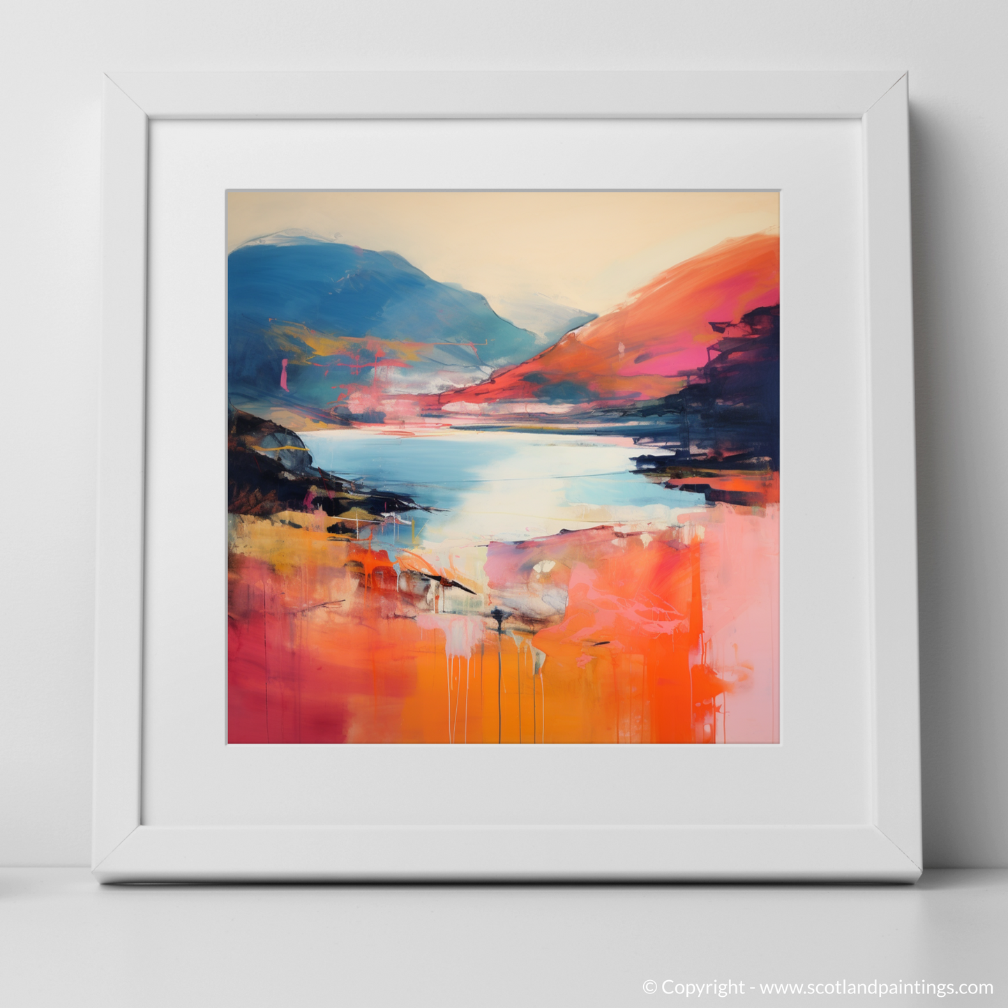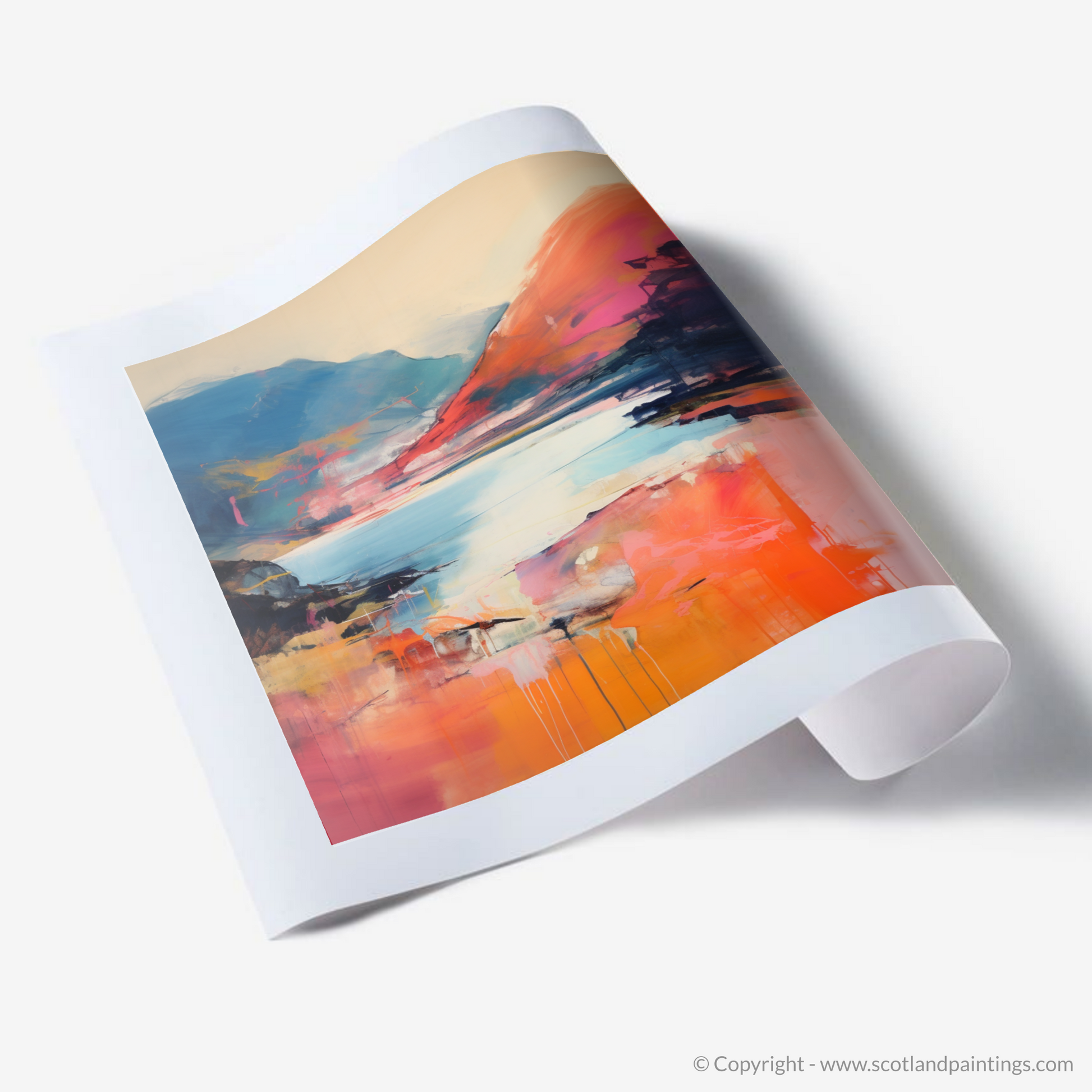 This captivating print presents a splendid abstract rendition of the Scottish landscape, inspired by the majestic Ben Vorlich overlooking Loch Earn. The foreground is awash with vivid coral and gentle peach tones, suggesting the warm glow of a sunset, ethereally combined with stark whites and soothing blues that mirror the calm surface of the loch. Dynamic splashes of paint and daring streaks cascade down, evoking the rugged nature of the Scottish highlands.