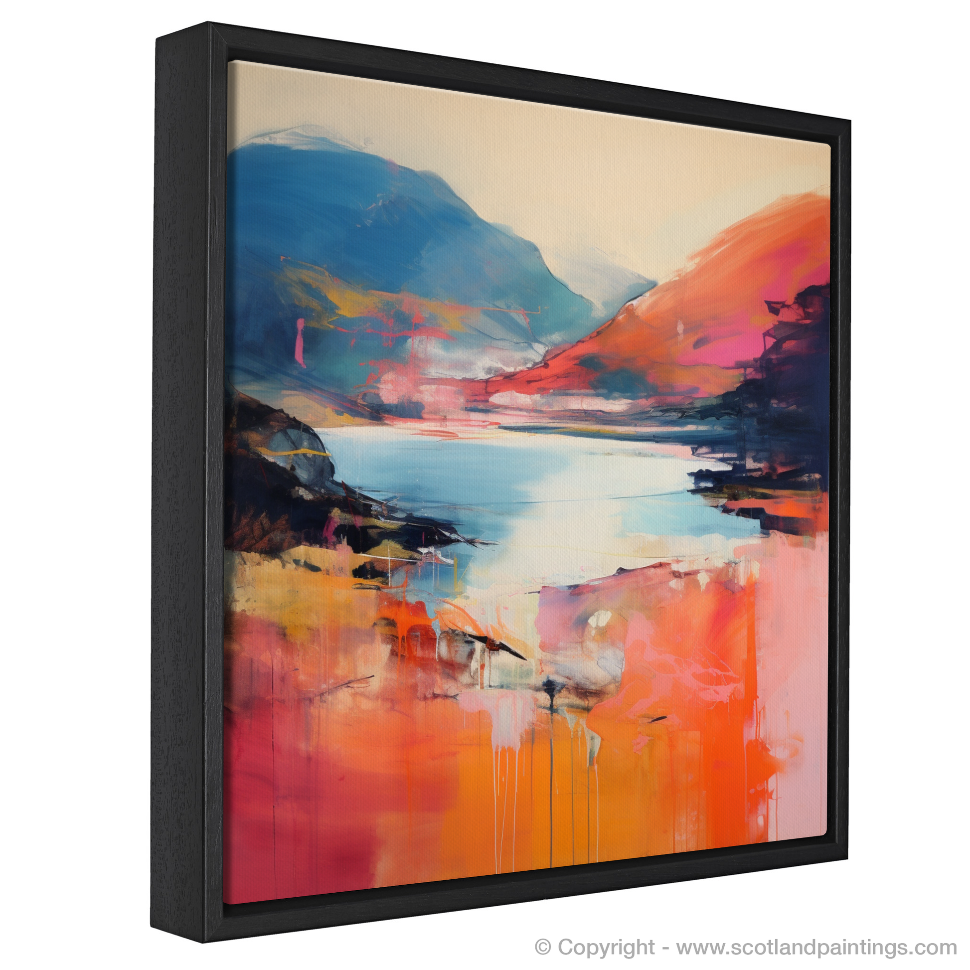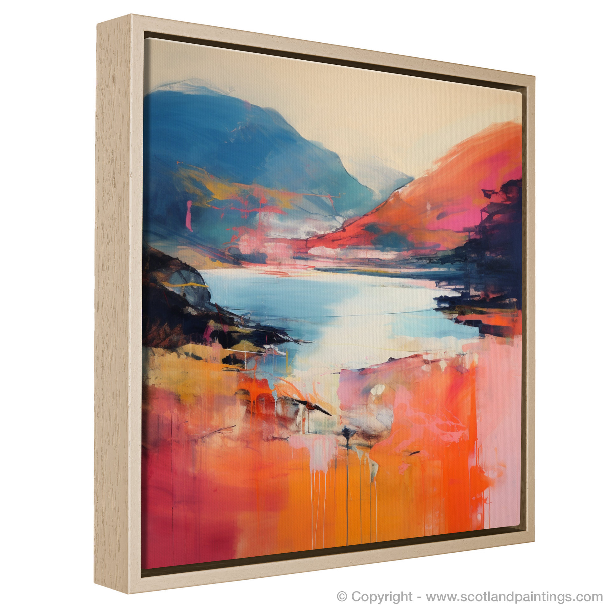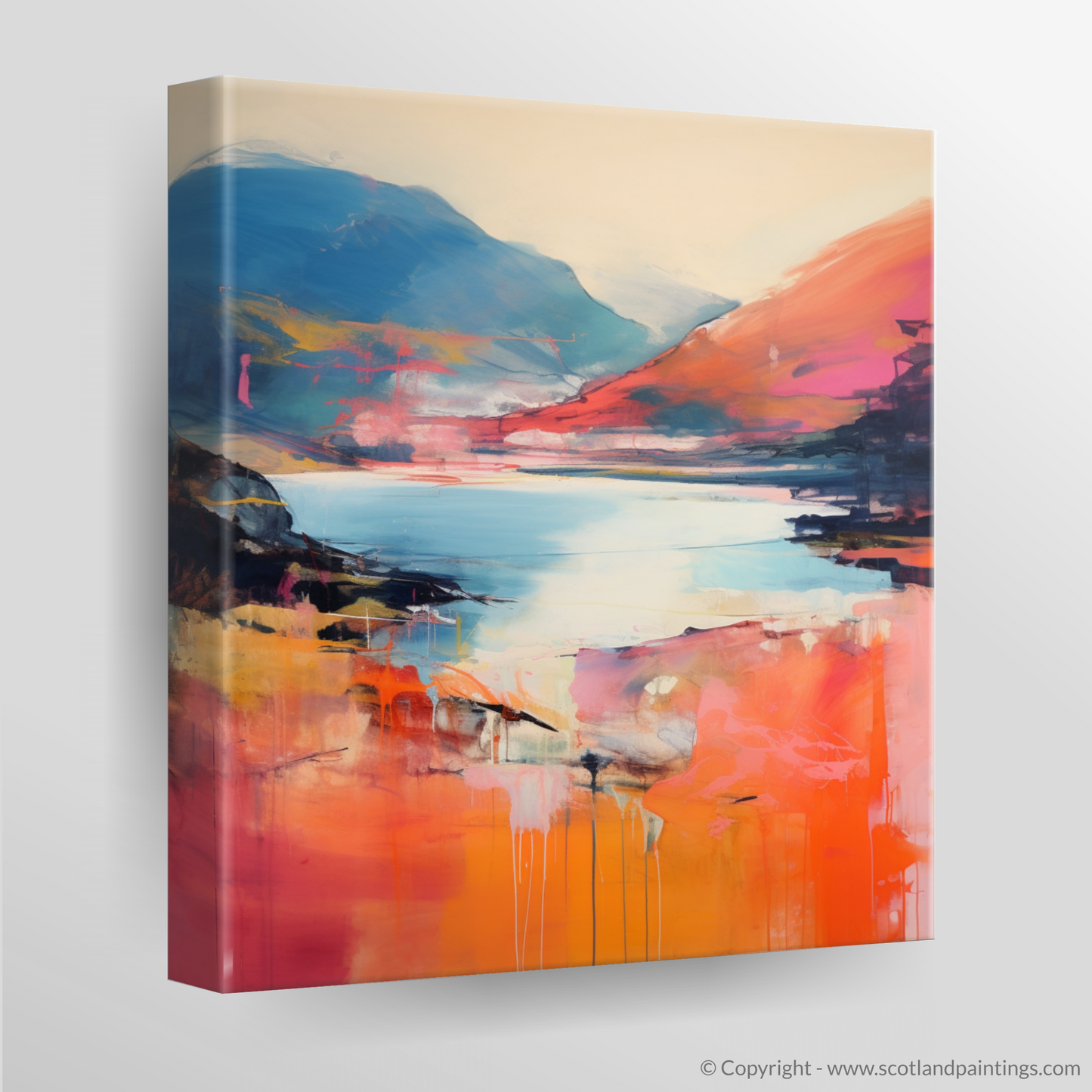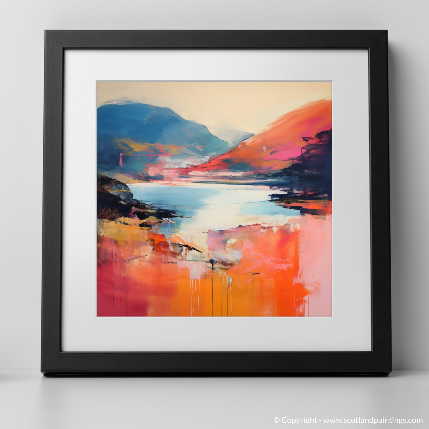 This captivating print presents a splendid abstract rendition of the Scottish landscape, inspired by the majestic Ben Vorlich overlooking Loch Earn. The foreground is awash with vivid coral and gentle peach tones, suggesting the warm glow of a sunset, ethereally combined with stark whites and soothing blues that mirror the calm surface of the loch. Dynamic splashes of paint and daring streaks cascade down, evoking the rugged nature of the Scottish highlands.