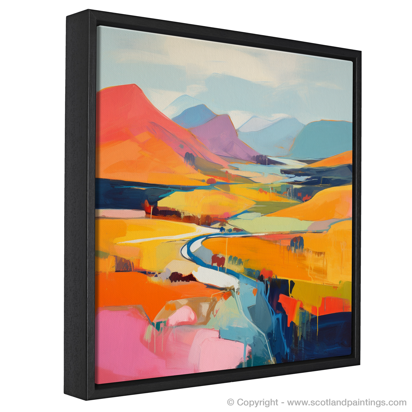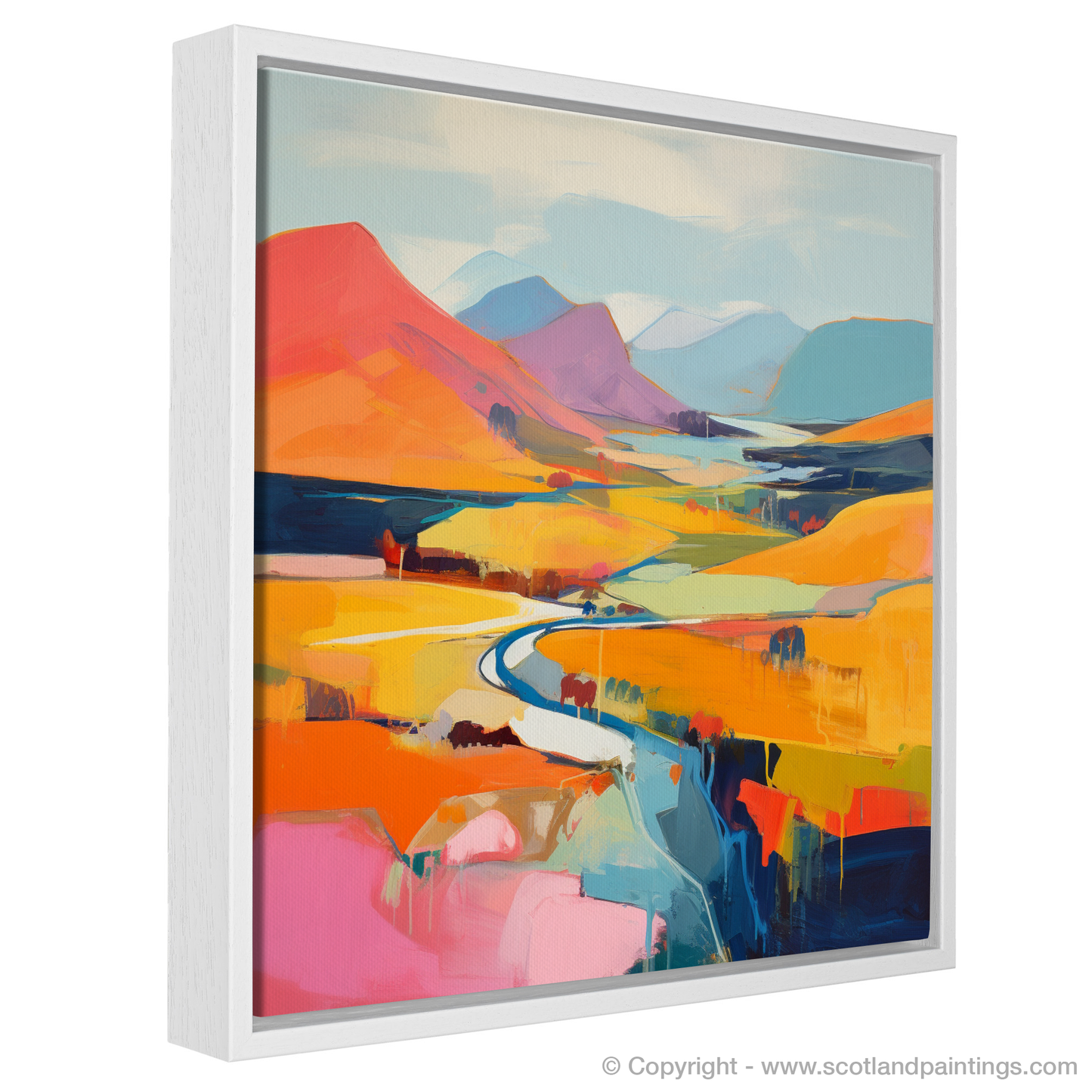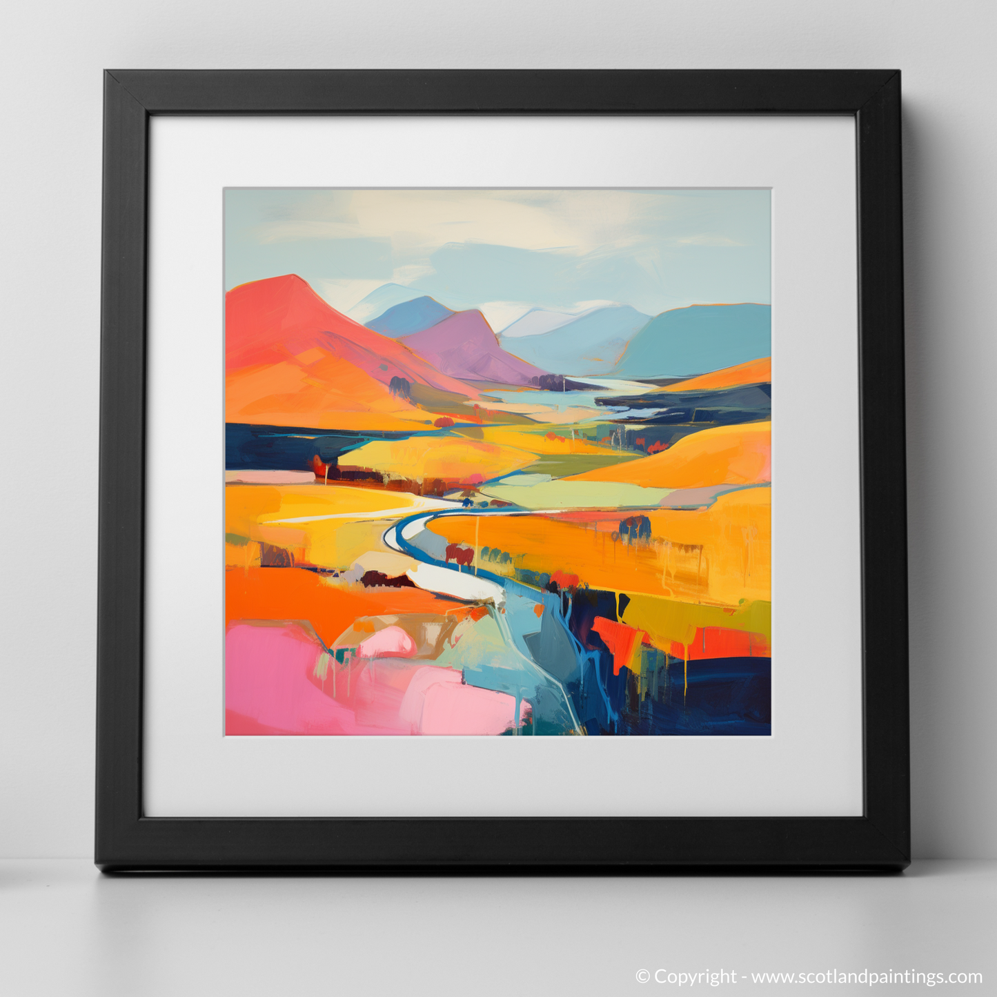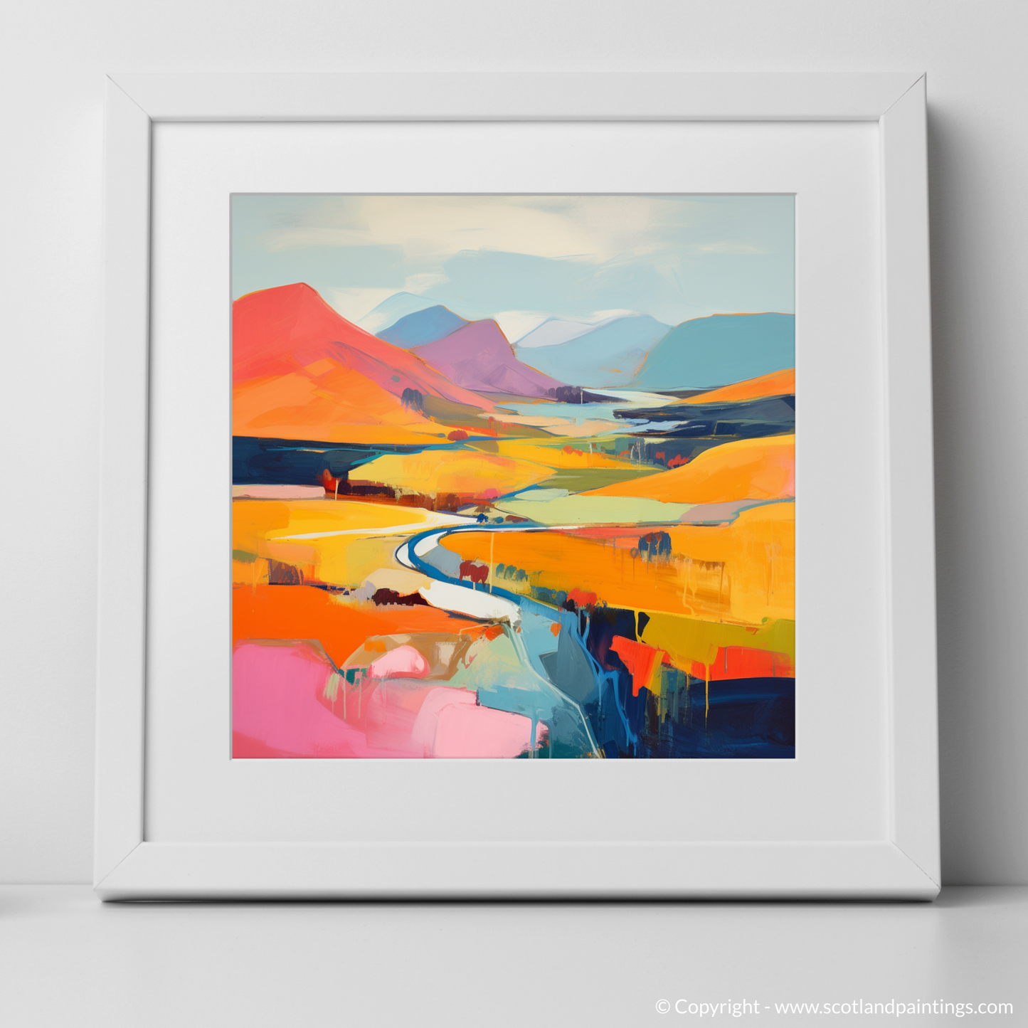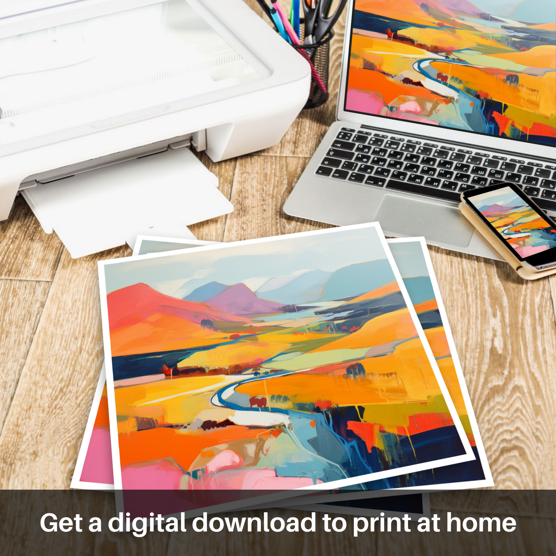 Capture the essence of the Scottish Highlands with this enchanting print inspired by Cruach Àrdrain. Vivid swaths of tangerine, cerulean and mustard paint a landscape where reality blends with imagination. The composition draws the eye across rolling hills and mountains, rendered in sweeping, gestural brushstrokes that evoke the wild, untamed beauty of the Munros. A winding river courses through the valley, reflecting a sky awash in delicate shades of blues and greys, hinting at the unpredictable weather of this majestic region.