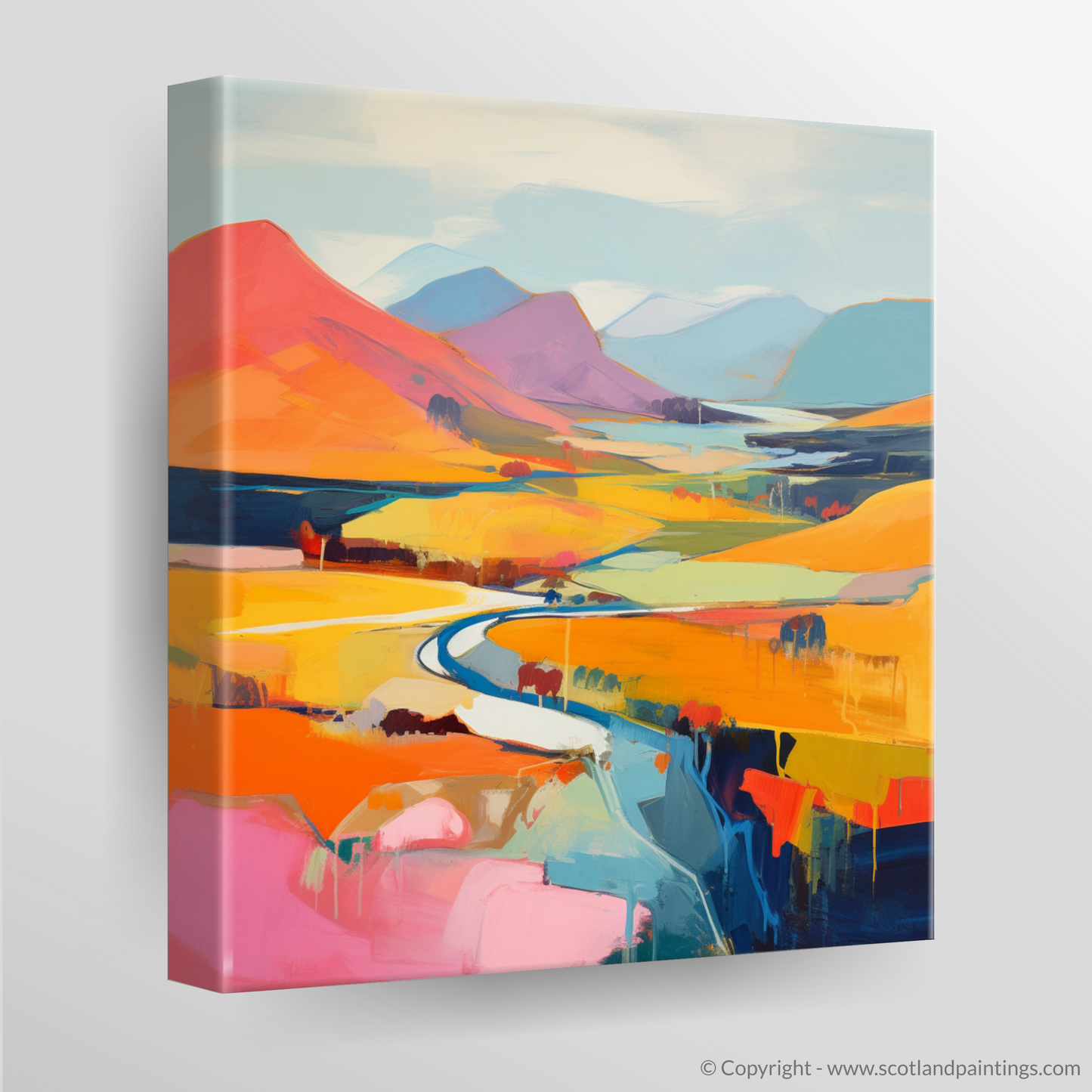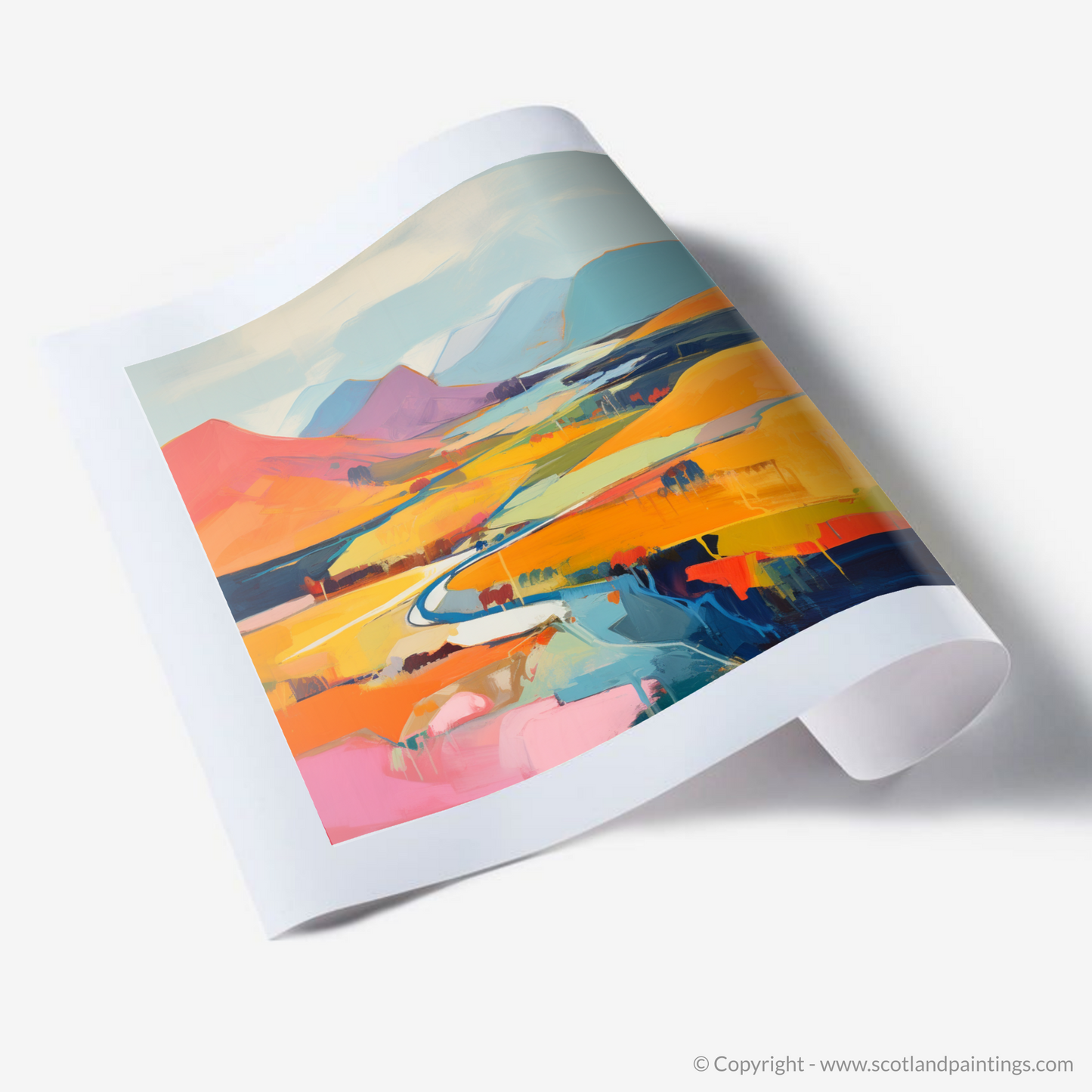 In a dance of colour and form, each element is abstracted, inviting viewers to interpret the Scottish countryside through a lens of emotion and colour. The print is a celebration of nature's palette, with fields that pop with bright yellows, contrasting against the serene purples and pinks of distant hills. Strokes of bold, primary colour suggest the presence of elements in the foreground, while softer, receding hues convey depth and distance.