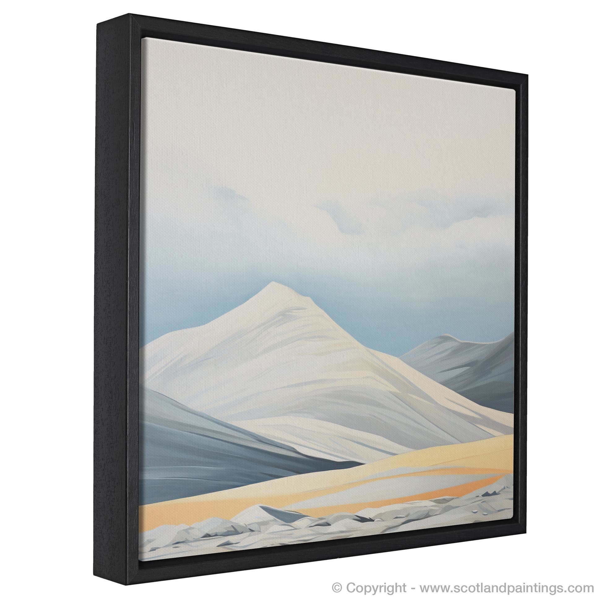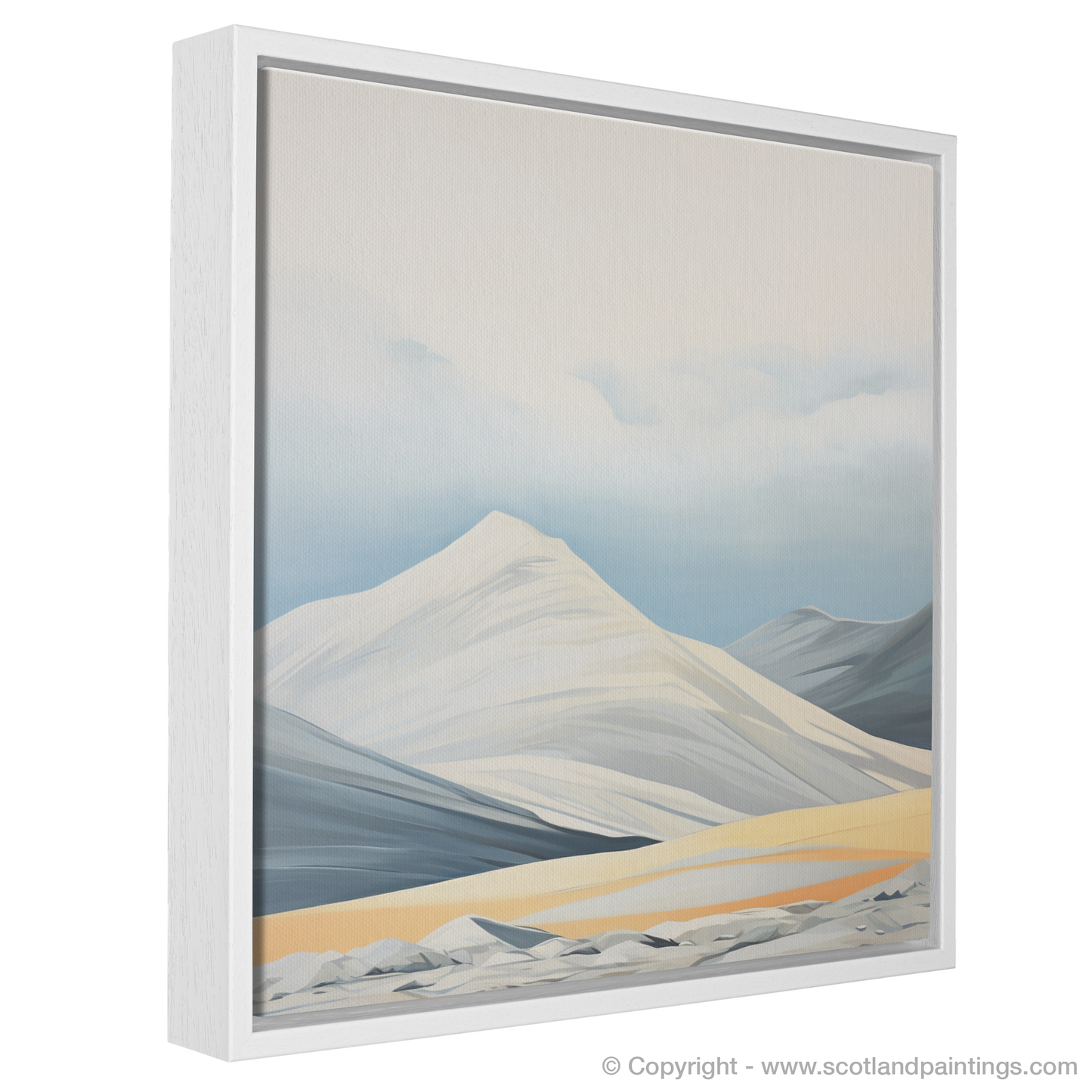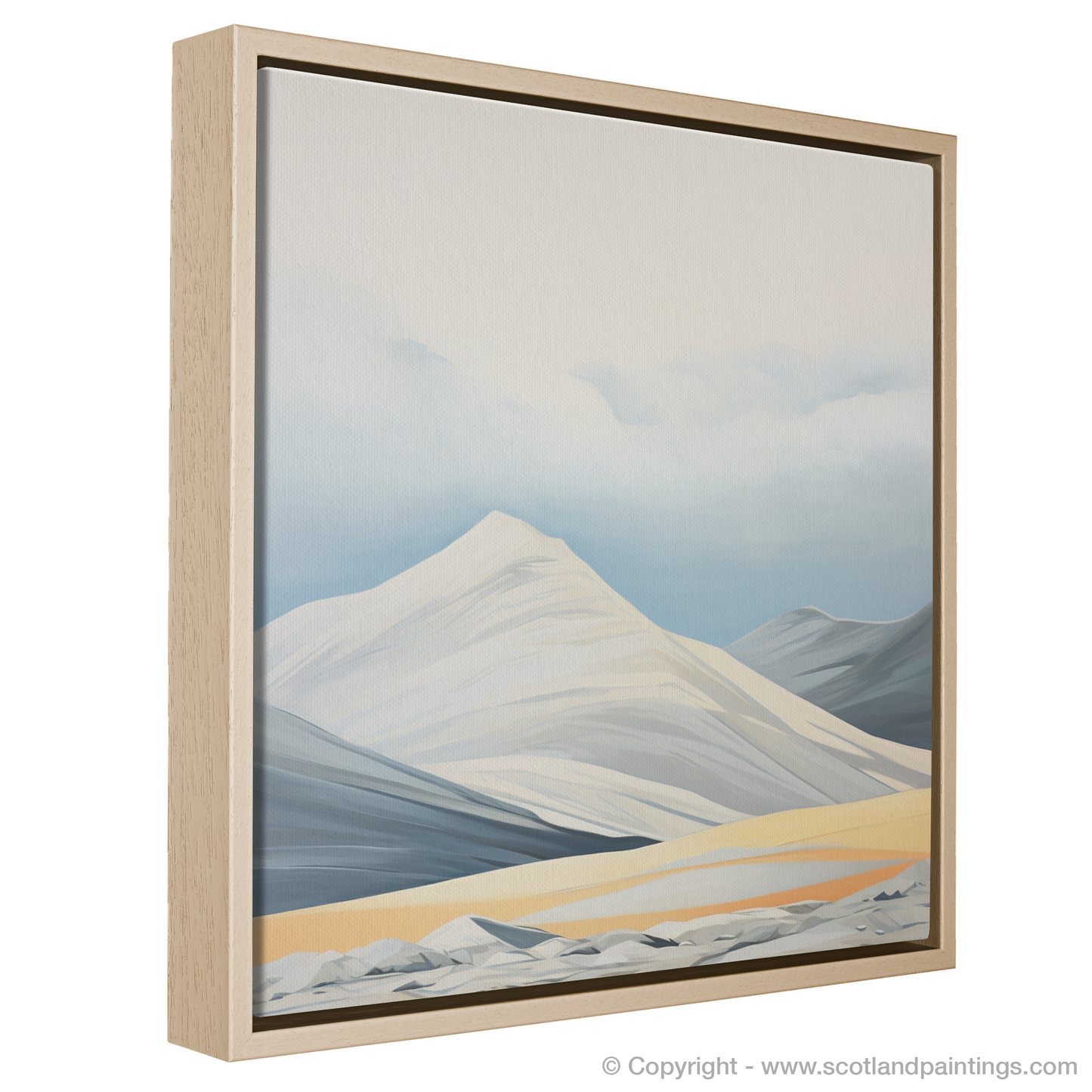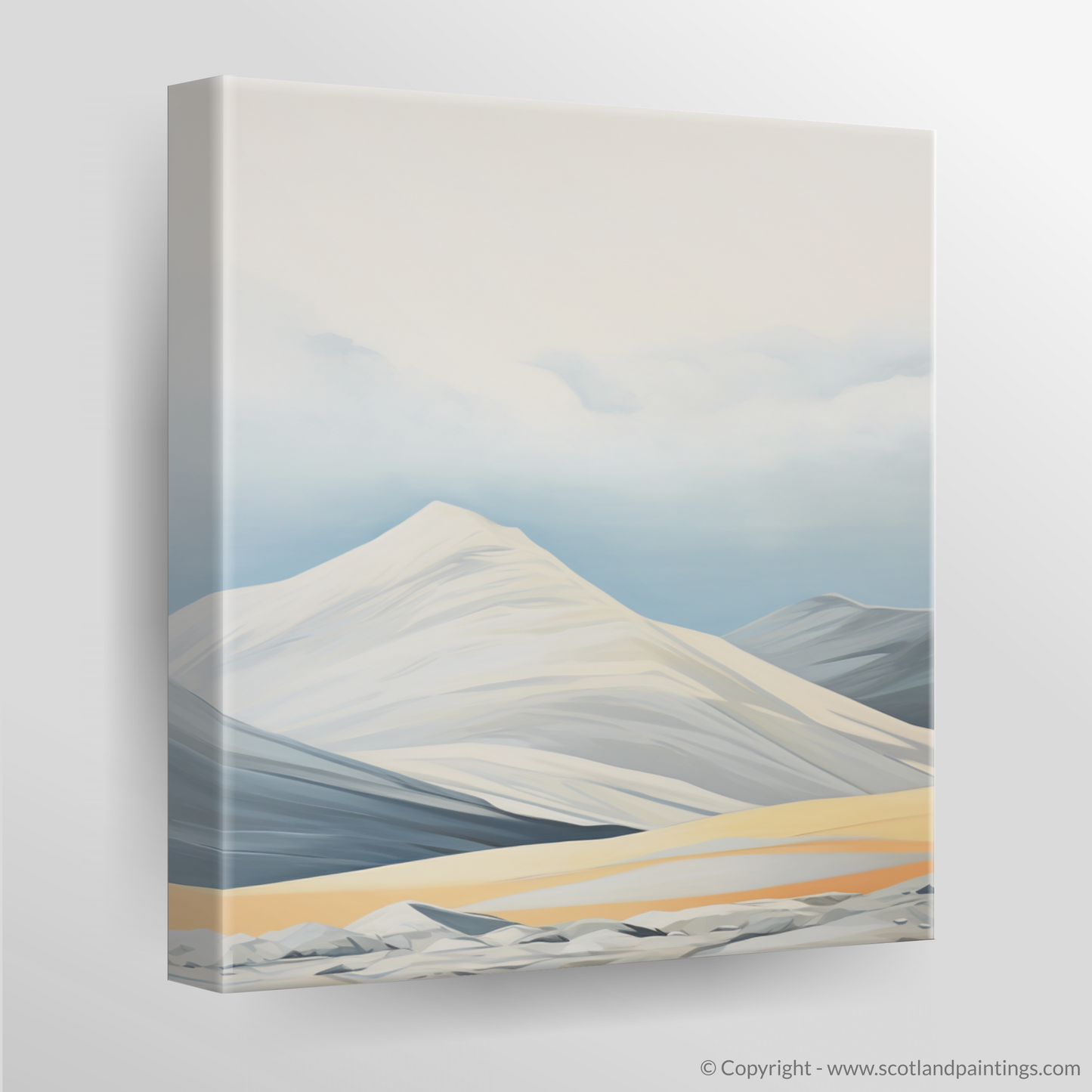 The sky is painted with serene lightness, minimal cloud formations gently caressing the upper frame, lending a sense of tranquillity and boundless space. In the foreground, the sense of abstraction is heightened with geometric interpretations of the raw, textured landscape. This layered approach offers depth and invites contemplation, reflecting the complexity and grandeur of Ben Lawers' natural environment.
