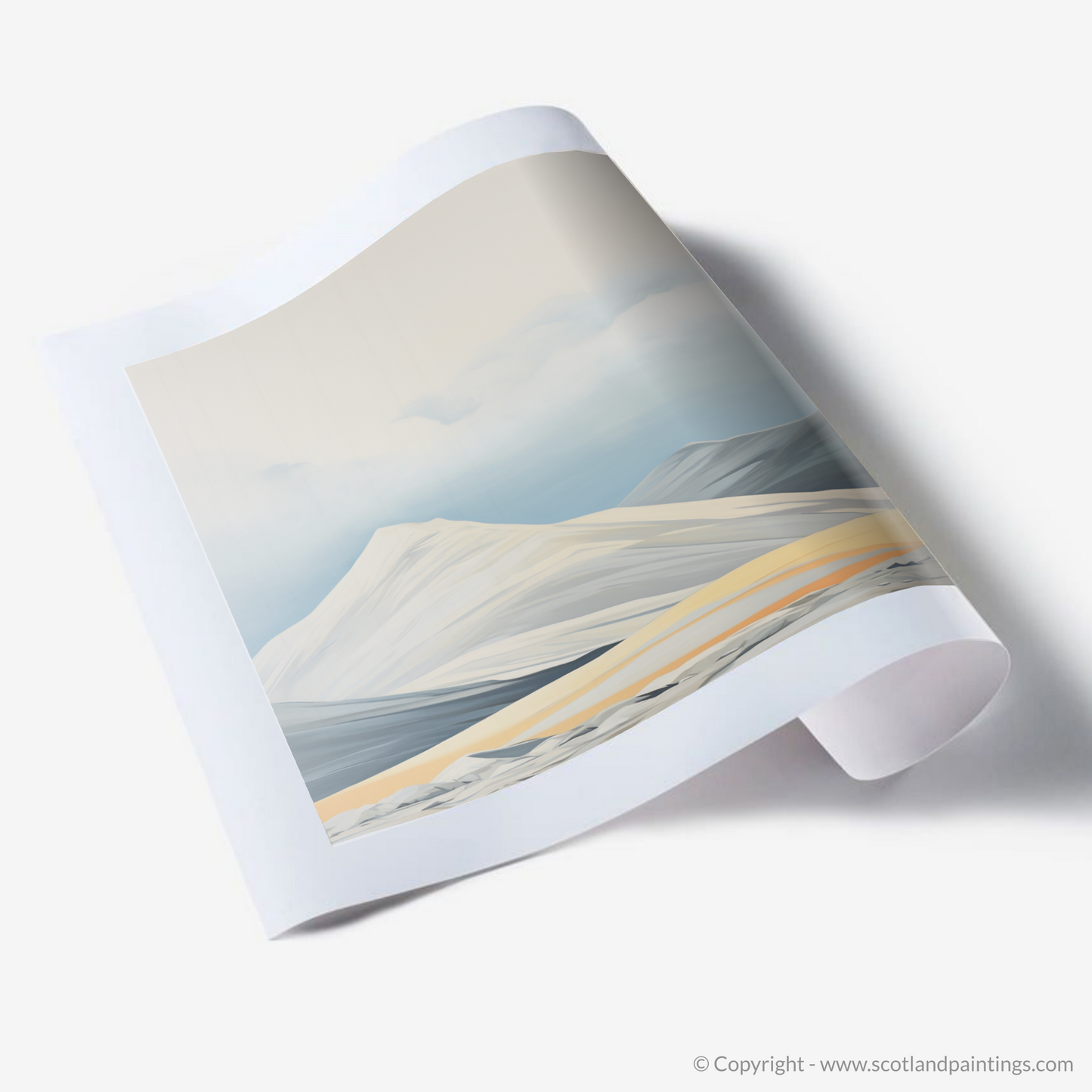 At the heart of the composition is the iconic peak itself, depicted with angular precision that gives way to undulating contours. The use of a restrained colour palette – dominated by shades of white, grey, and blue – conjures the mountain's snowy cap and the vast sky above, while the contrast with a bold strip of amber at the base introduces an unexpected warmth, reminiscent of the fleeting Highland sun on the rugged earth.