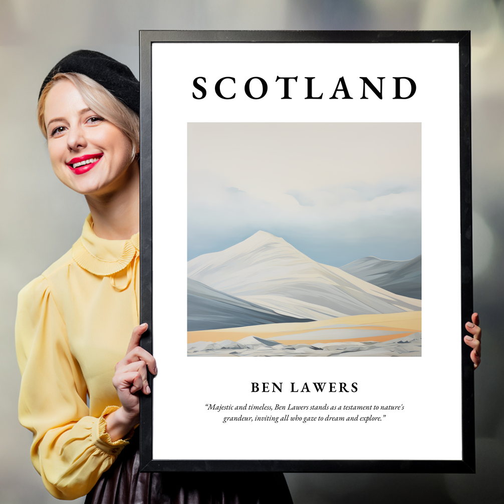 The design commands attention, with “SCOTLAND” boldly announcing the theme above a mesmerising abstract depiction of Ben Lawers. This painting transforms the iconic mountain into an ethereal dreamscape, with soft hues and sweeping brushstrokes capturing the essence of its majestic peaks and serene atmosphere. Beneath this, the evocative quote “Majestic and timeless, Ben Lawers stands as a testament to nature's grandeur, inviting all who gaze to dream and explore” invites viewers into a world of reflection and adventure.