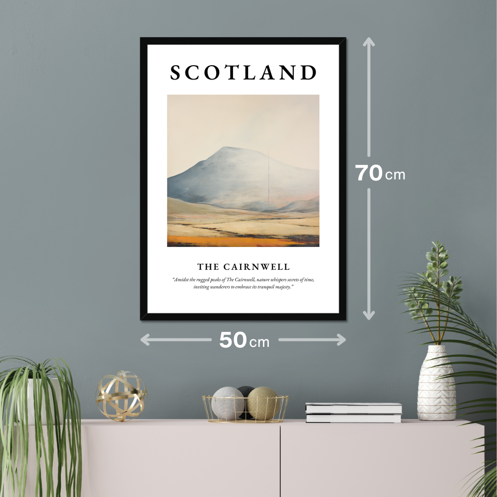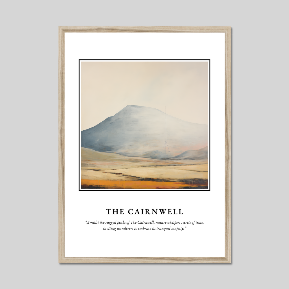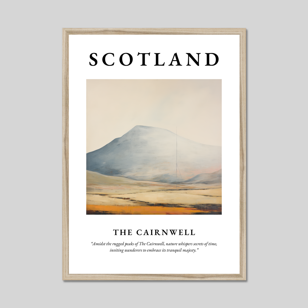 At the top, bold letters spell out “SCOTLAND,” instantly evoking the allure and spirit of the Scottish Highlands. Below, the abstract painting of The Cairnwell captures the imagination with sweeping strokes and nuanced hues. The artwork masterfully conveys the undulating landscape and the mysterious charm of this iconic peak. Underneath, a poignant quote—“Amidst the rugged peaks of The Cairnwell, nature whispers secrets of time, inviting wanderers to embrace its tranquil majesty”—invites you into a world of serene contemplation.