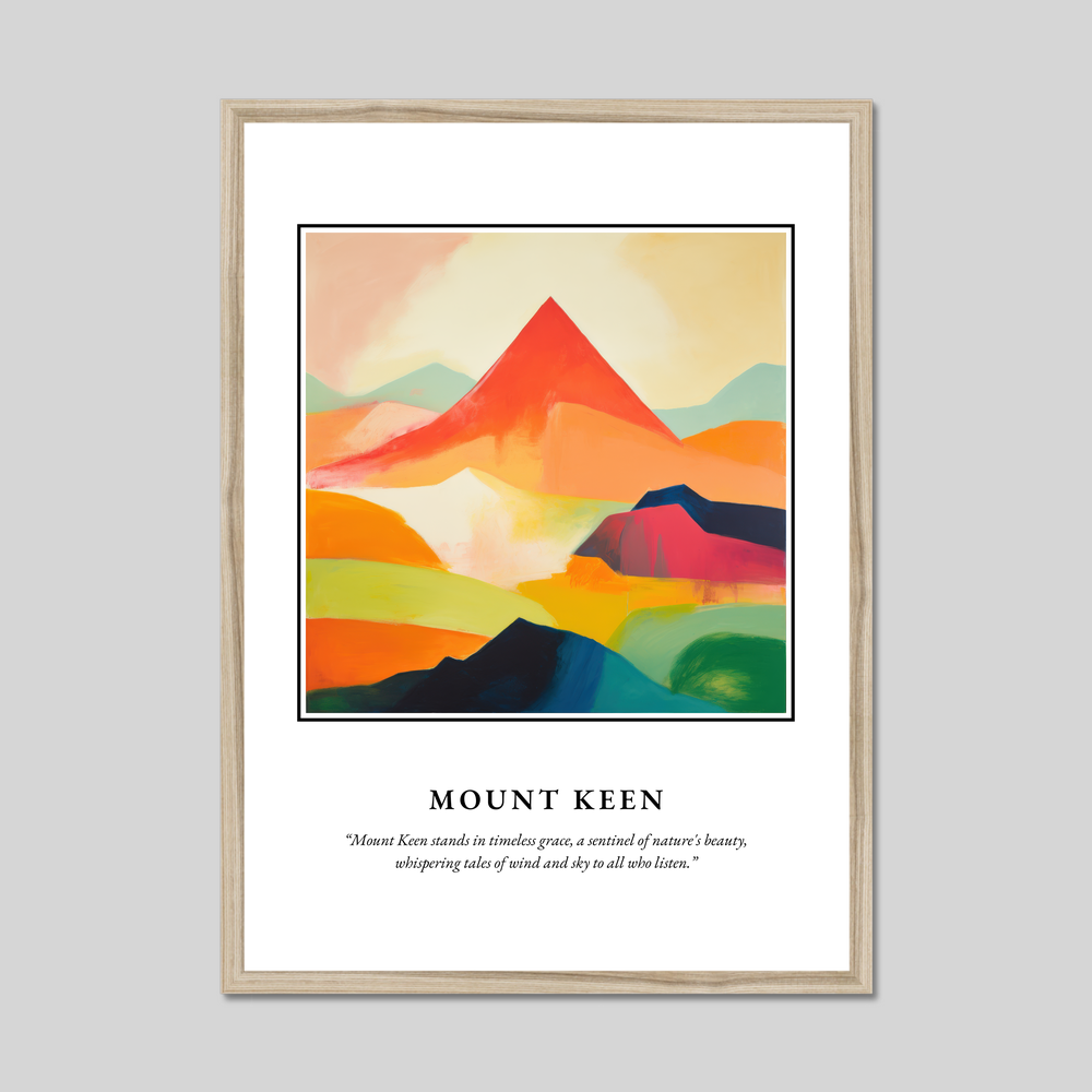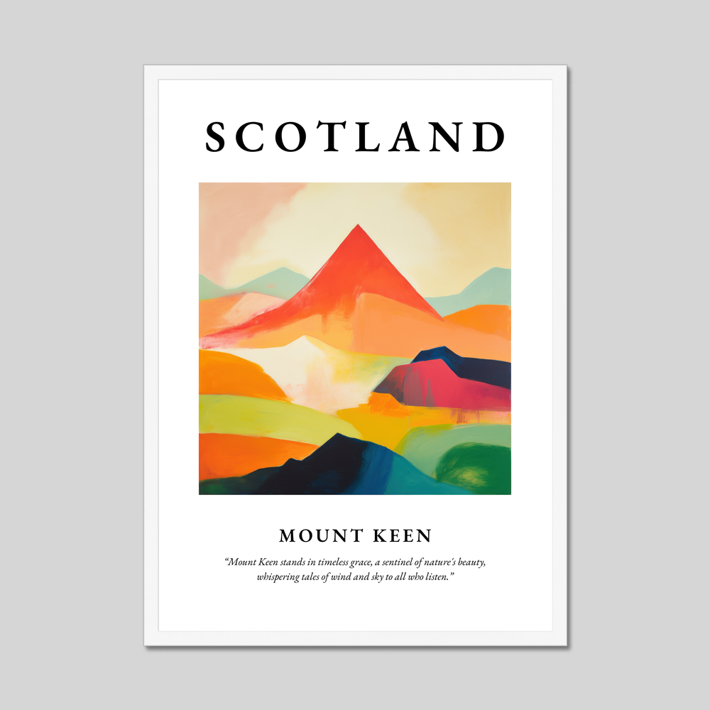 The word “SCOTLAND” crowns the poster in bold lettering, immediately setting the scene for the vibrant journey below. An abstract depiction of Mount Keen draws the viewer into a world of swirling colours and dynamic shapes, capturing the essence and spirit of this iconic mountain. Beneath the painting, a poetic quote whispers of the mountain's timeless grace and the stories carried by the wind and sky.