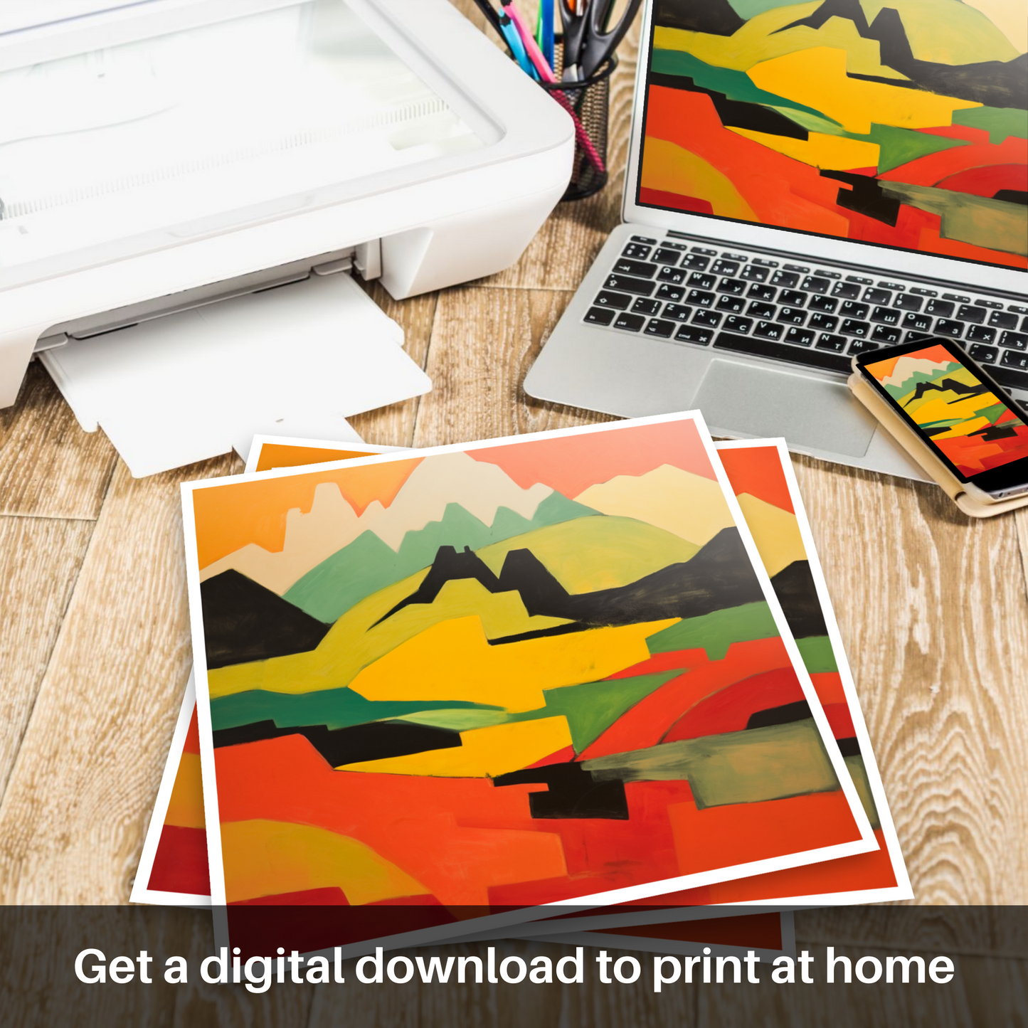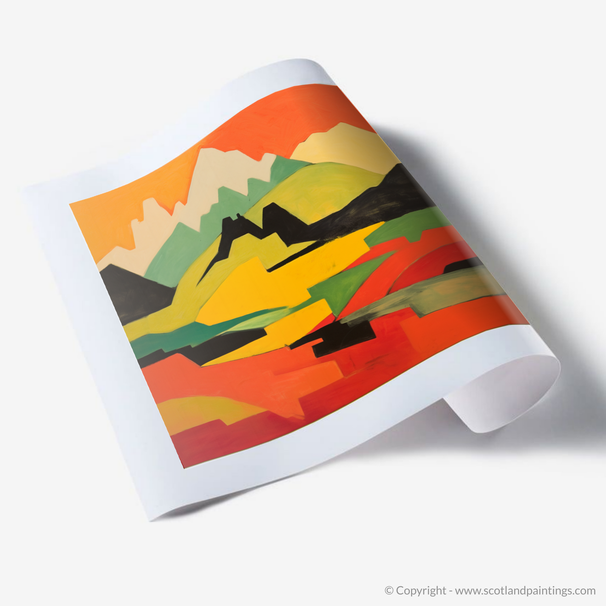 Capturing the essence of Scotland's rugged landscape, this abstract interpretation of Càrn Aosda is a vibrant amalgamation of form and colour. Bold, interlocking shapes converge to form a dynamic composition, evoking the untamed beauty of one of the Scottish Munros.