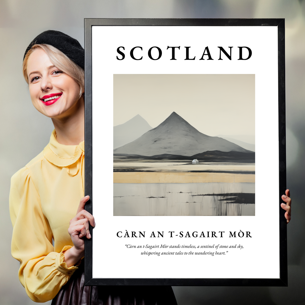 At the top of the poster, Scotland is announced in big, bold lettering, drawing you in to explore the scene below. The abstract painting of Càrn an t-Sagairt Mòr perfectly captures the mystique of this iconic peak. With sweeping strokes and a subdued palette, the artwork evokes the allure of Scotland's rugged landscapes. Underneath, a poignant quote reads: “Càrn an t-Sagairt Mòr stands timeless, a sentinel of stone and sky, whispering ancient tales to the wandering heart.” Whether you're an admirer of abstract art or someone with a deep connection to the Scottish hills, this piece speaks volumes.