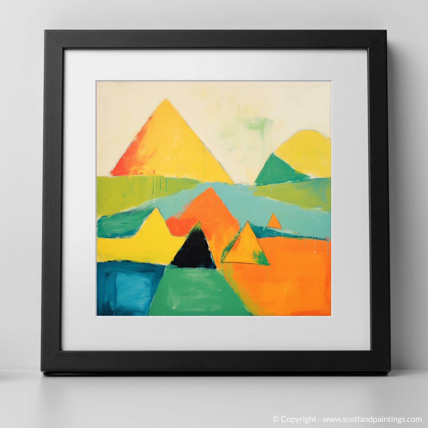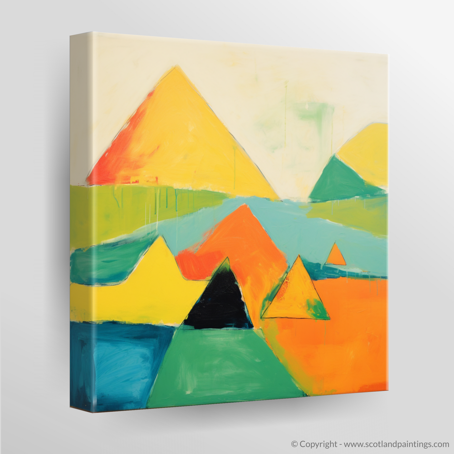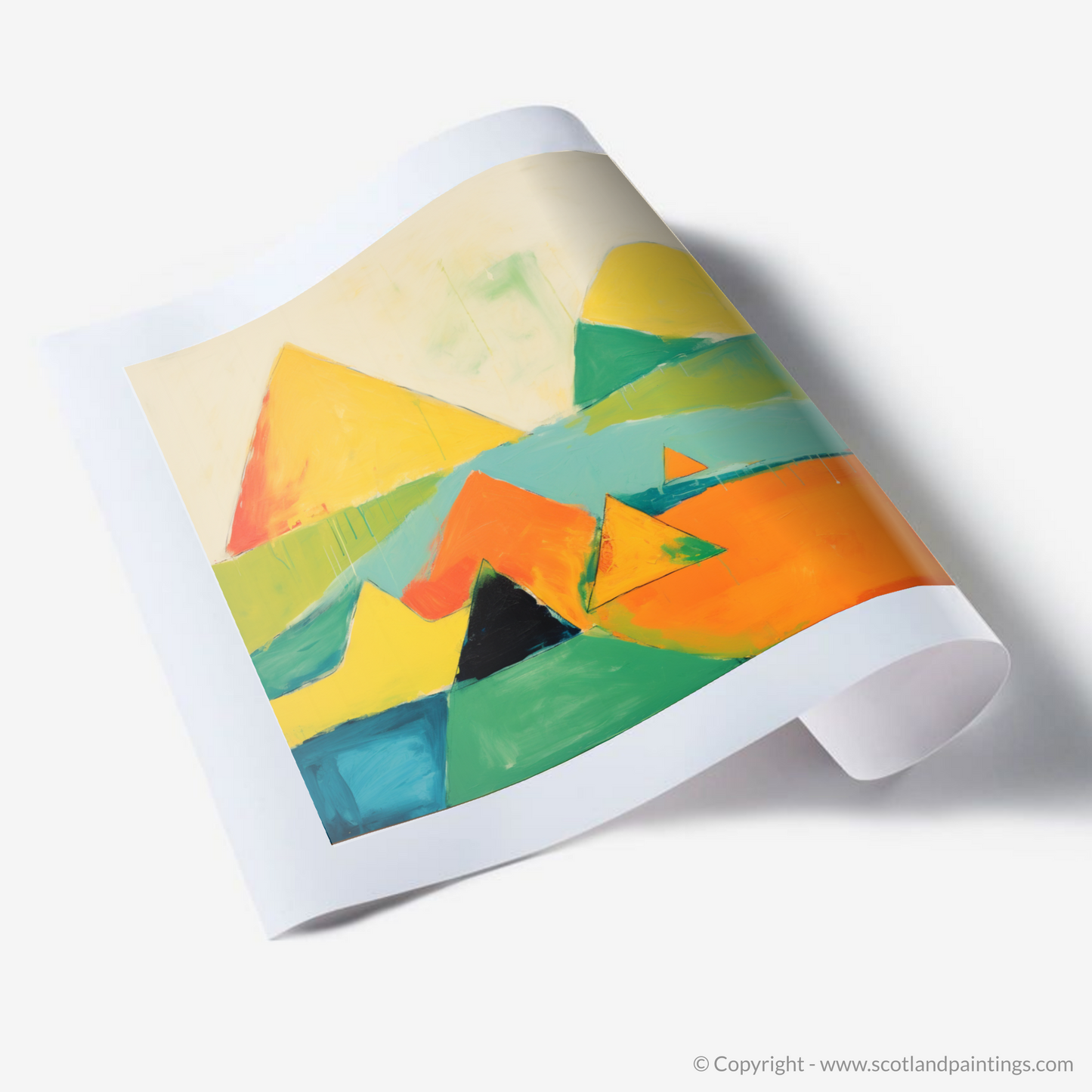 Capturing the wild beauty of the Scottish Munros, this vibrant abstract print presents an interpretative representation of the majestic Mayar. Bold geometric shapes and a bright, contrasting palette command attention, as the essence of the landscape's natural grandeur is distilled into an array of sharp peaks and valleys. The interplay of orange, yellow, and green hues infuses the piece with a sense of warmth and energy, while the presence of deep blues and greens anchors the composition, suggesting the depth and mystery of the mountain terrain.