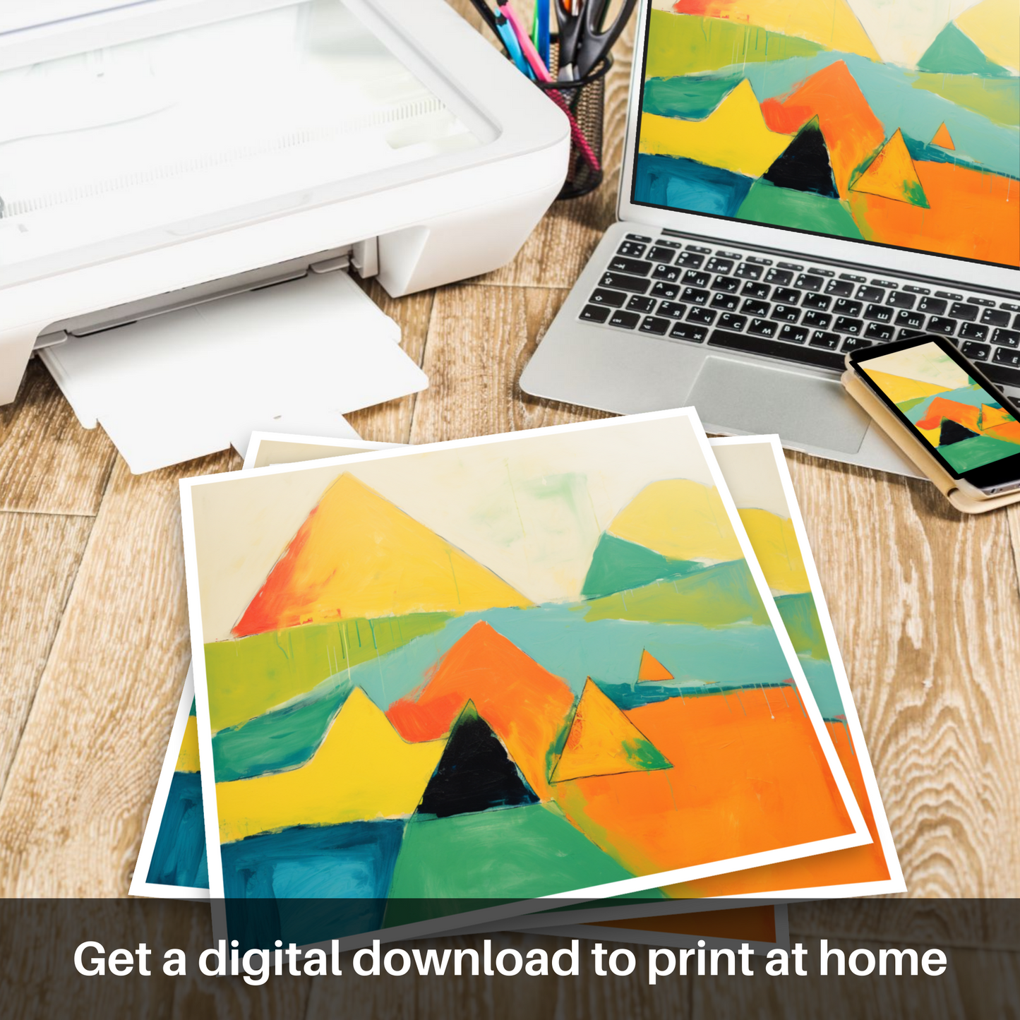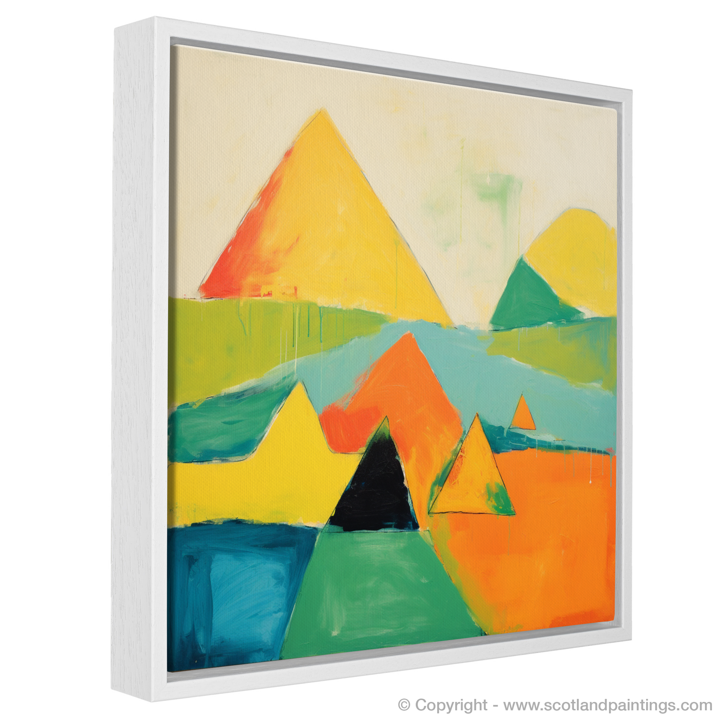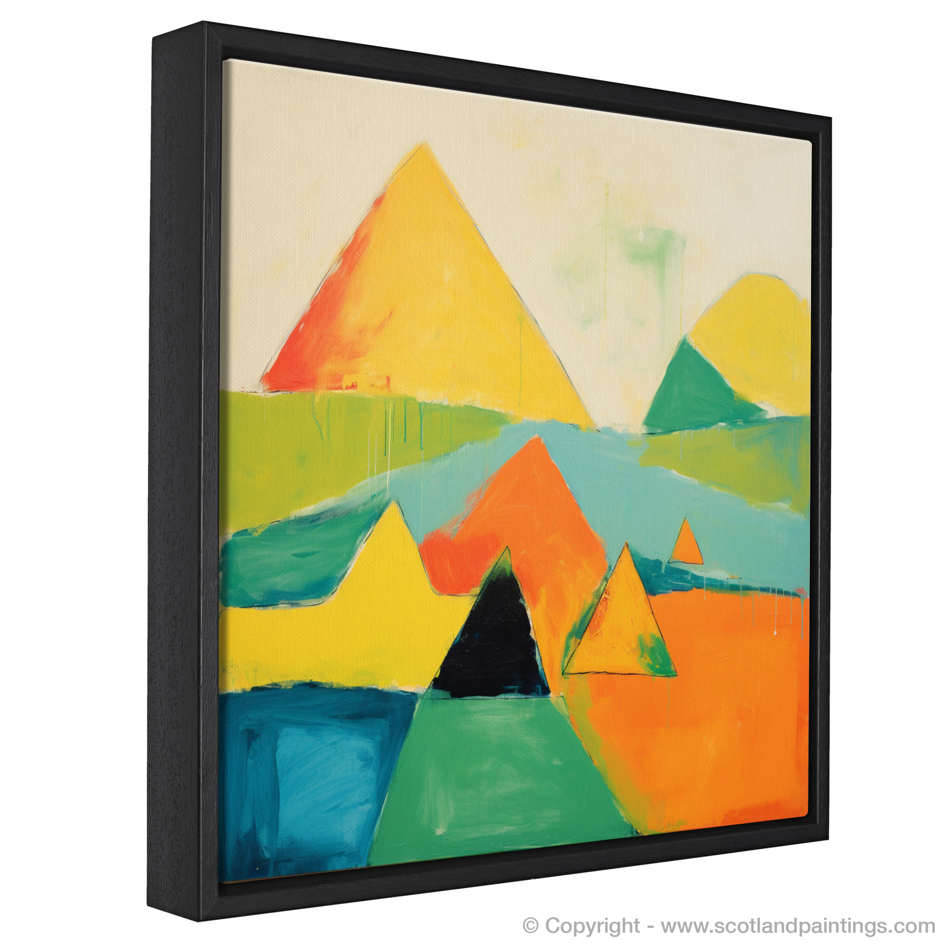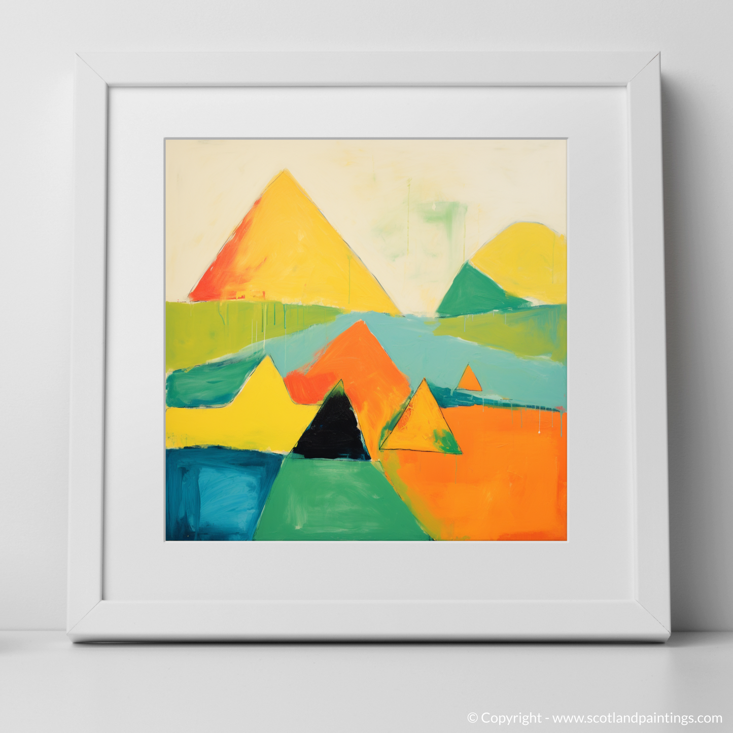 Capturing the wild beauty of the Scottish Munros, this vibrant abstract print presents an interpretative representation of the majestic Mayar. Bold geometric shapes and a bright, contrasting palette command attention, as the essence of the landscape's natural grandeur is distilled into an array of sharp peaks and valleys. The interplay of orange, yellow, and green hues infuses the piece with a sense of warmth and energy, while the presence of deep blues and greens anchors the composition, suggesting the depth and mystery of the mountain terrain.