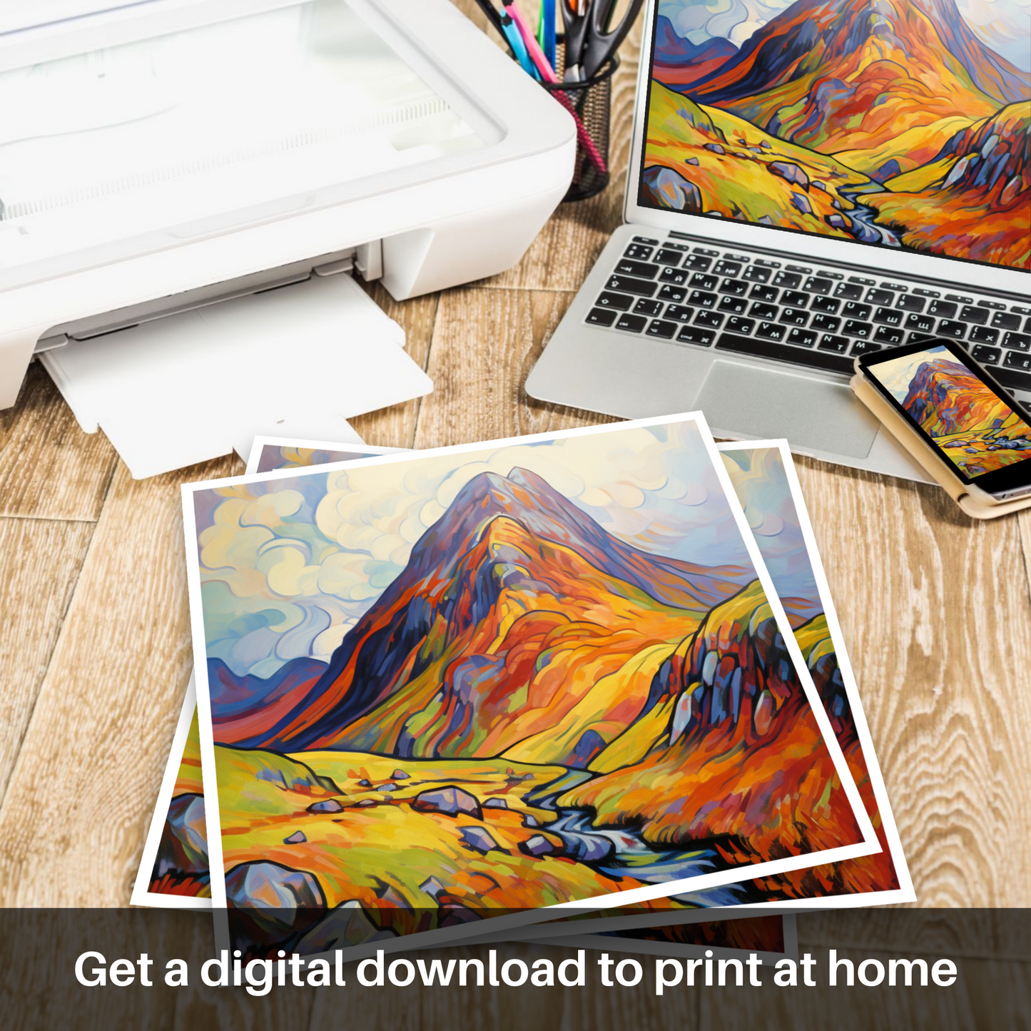 Immerse yourself in the vibrant, untamed essence of the Scottish Highlands with this captivating print inspired by Stob Dubh of Buachaille Etive Beag, now residing in our 'Scottish Munros' collection. The piece brims with animated colour; a wild symphony of vivid orange, fiery reds, and intense blues dance across the canvas, a reflection of the primal beauty found in the mountain's natural grandeur.