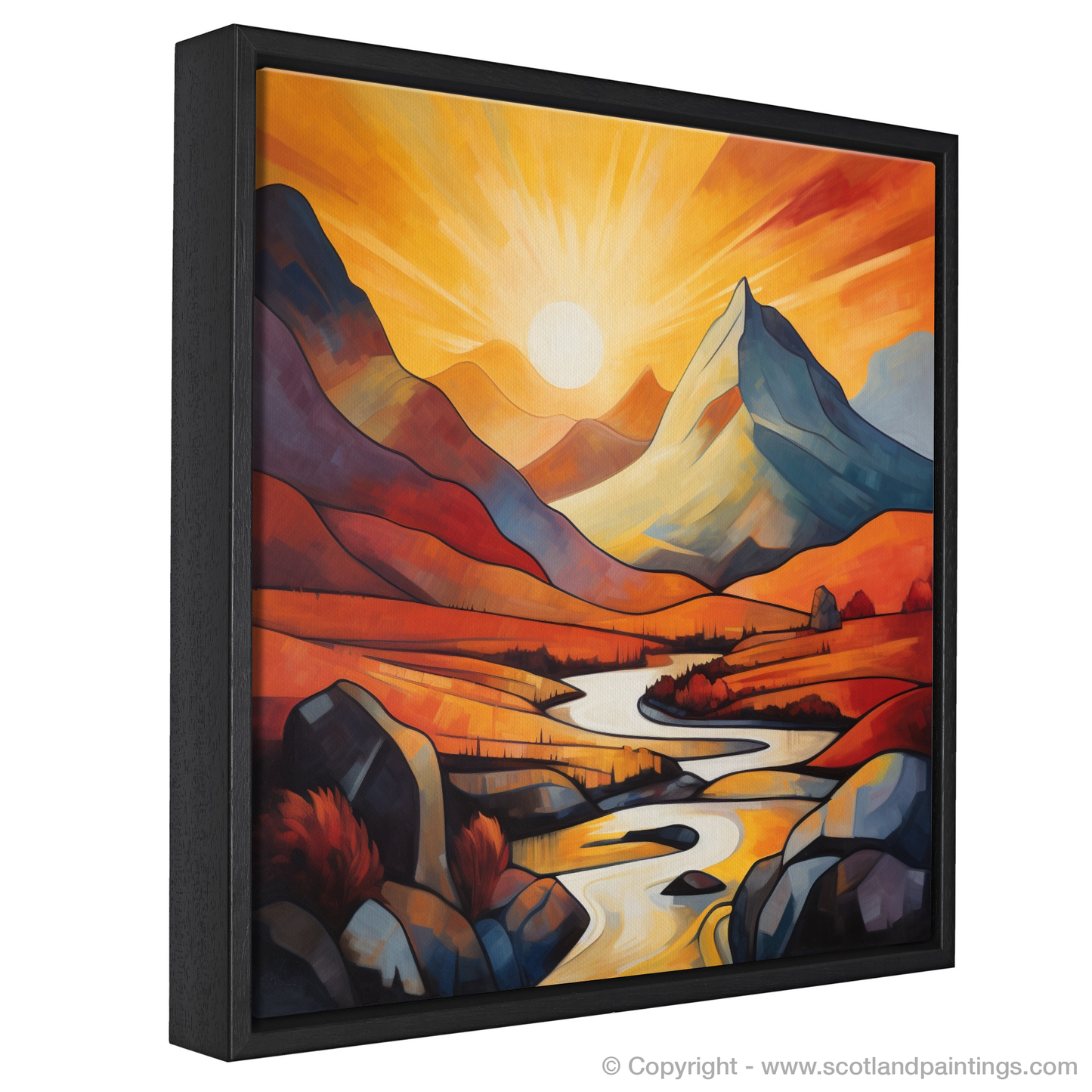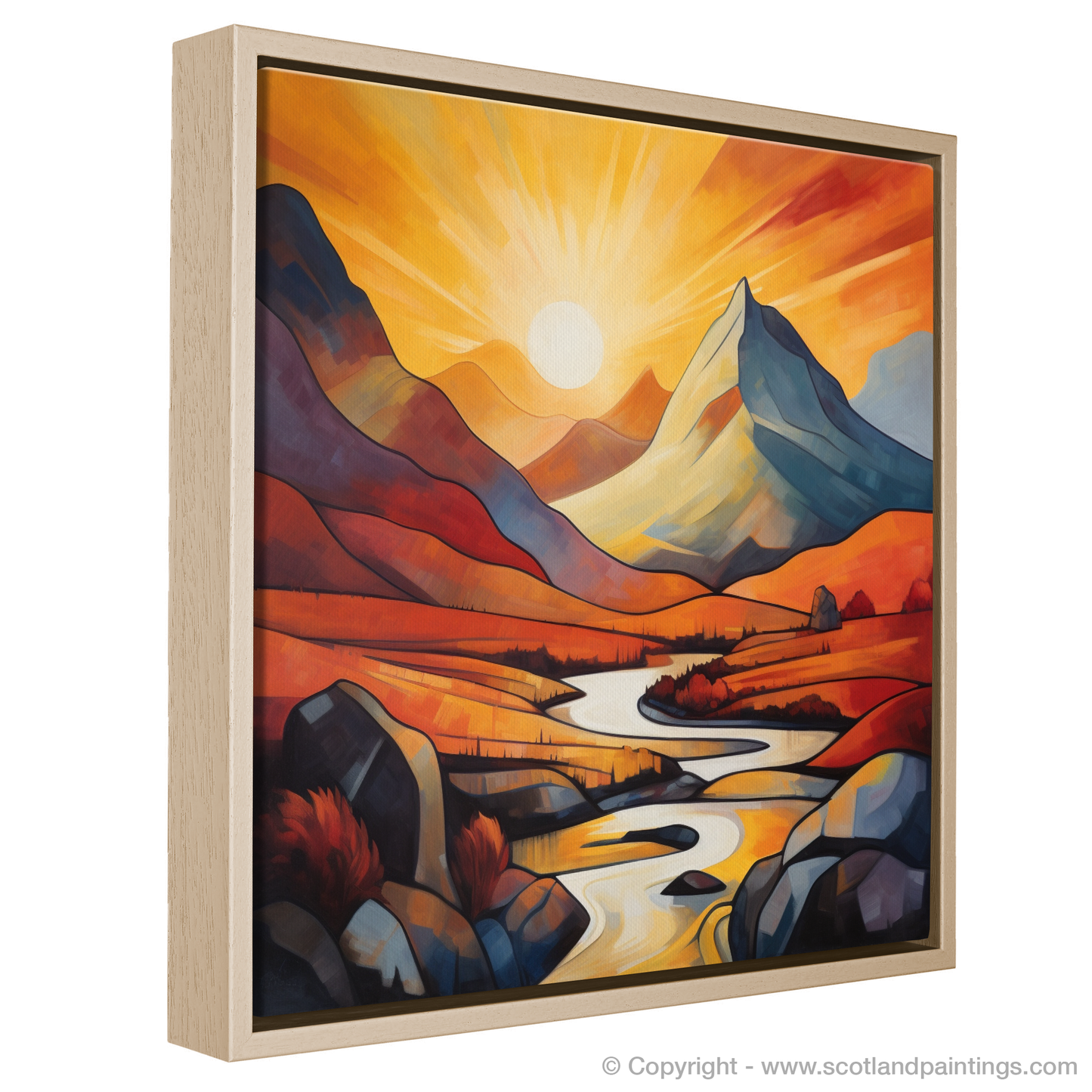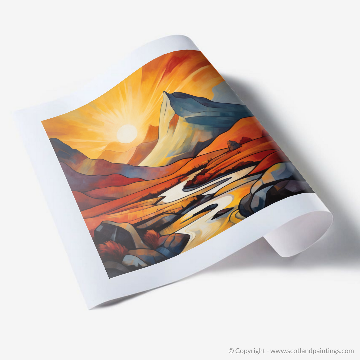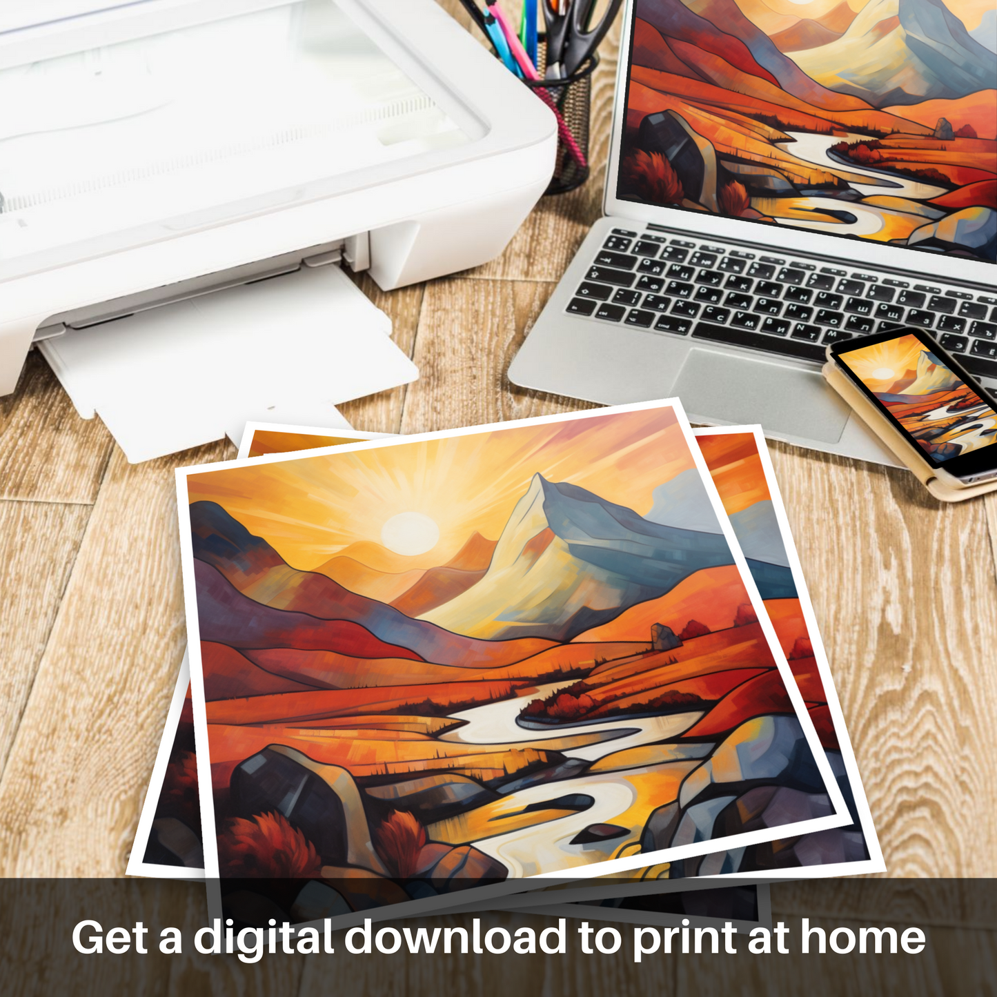 This print, a homage to the natural spectacle of Glencoe, is an invitation to let the walls of your space resonate with the timeless allure of Scotland's wild heart, distilled into an embodiment of serene abstraction that will captivate and inspire contemplation. Whether as a focal point in a living area or an accent in a quiet nook, this piece promises to infuse any interior with the vibrancy and tranquility of a highland sunset.