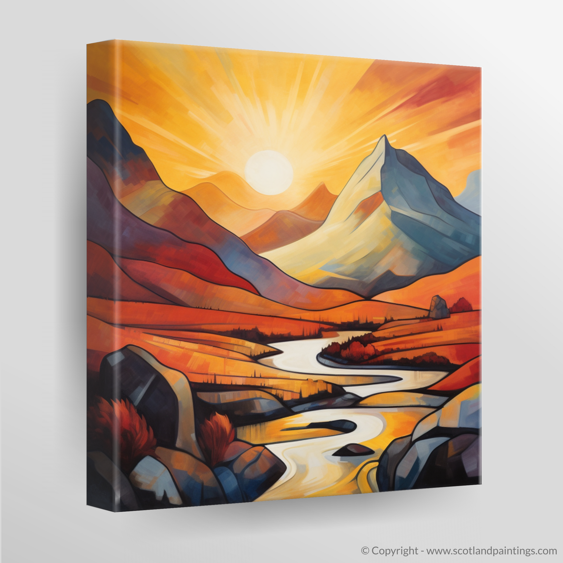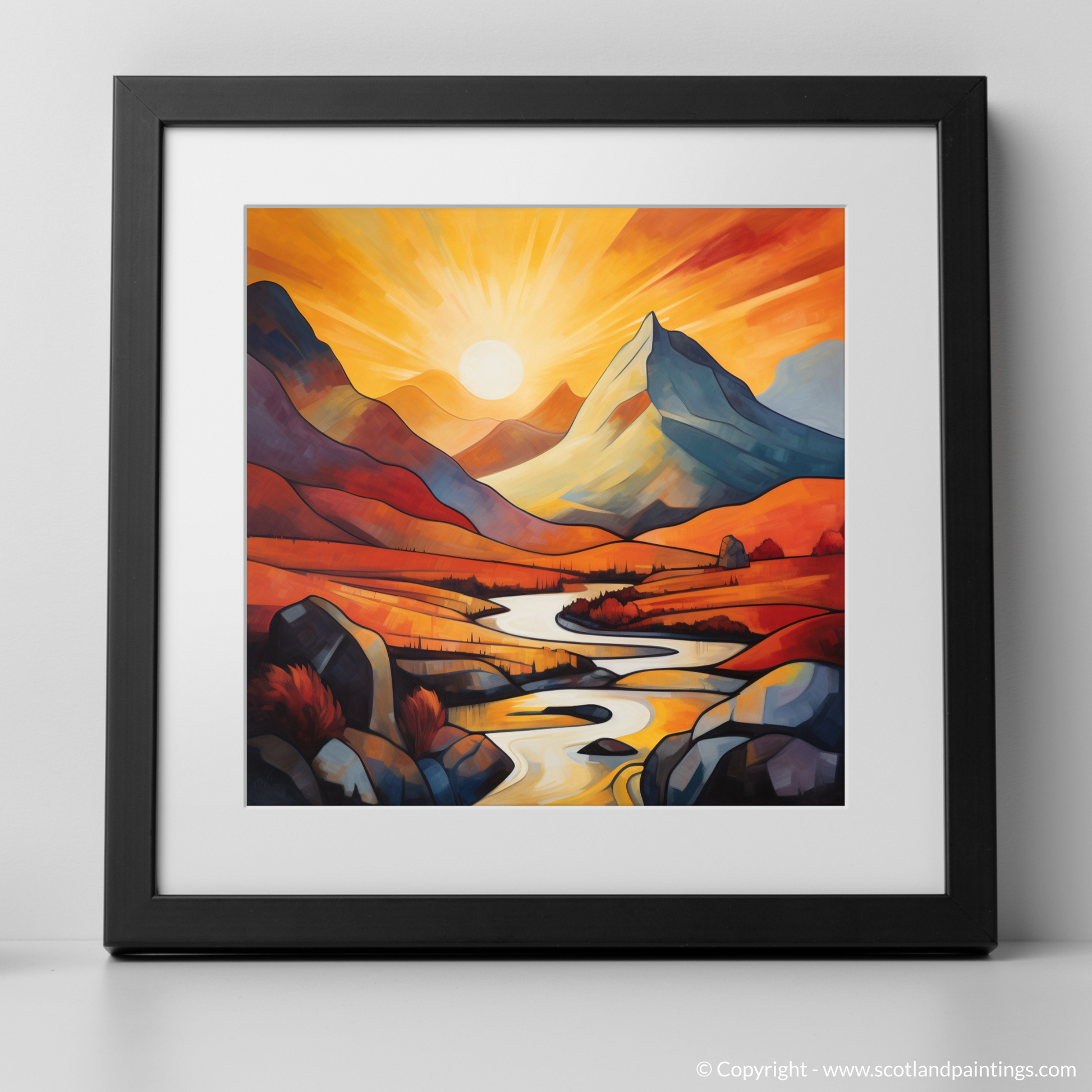 Immerse yourself in the warm embrace of the golden hour as it cloaks Buachaille Etive Mòr and the surrounding Glencoe landscape in a radiant glow, elegantly captured in this abstract print. The majesty of the Highlands is reimagined through a kaleidoscope of fiery hues, with the sun's descent casting a theatrical display of orange, red, and yellow across the sky. Contrastingly, the mountain's iconic, sharp silhouette cuts a cool, composed figure against the tapestry of warmth, its gradients of blue and white providing a serene counterpoint to the landscape's fervent passion.