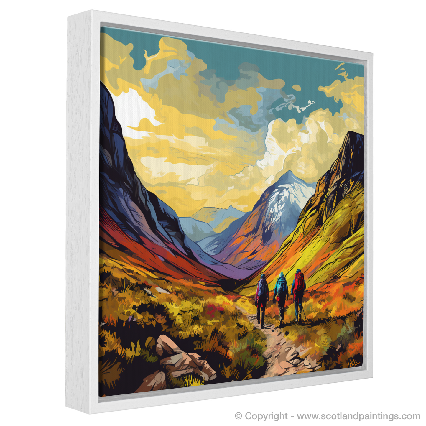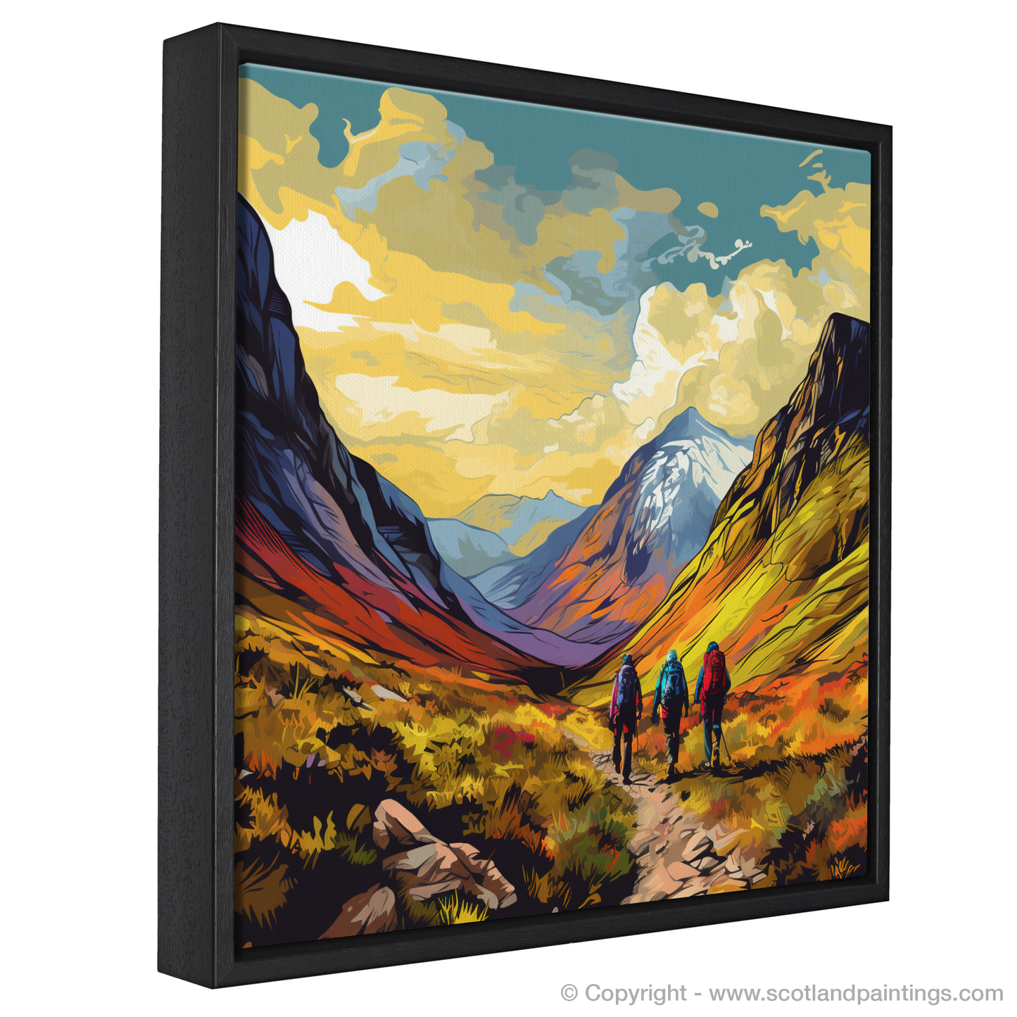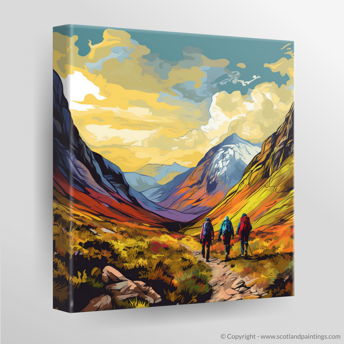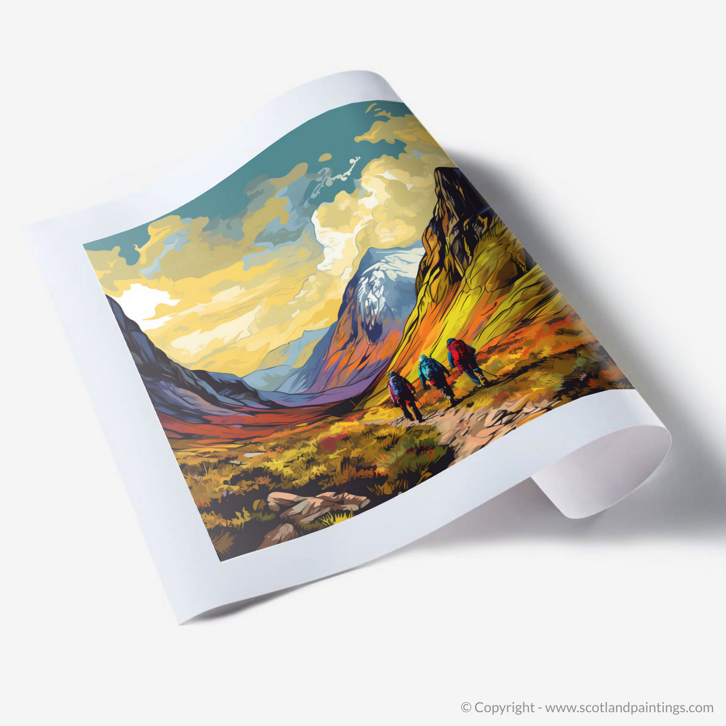 Capturing the invigorating essence of adventure, this vibrant print beckons viewers to the wilds of Glencoe, immortalising the moment where a trek begins and the majestic landscape unfolds. At the heart of this piece, a trio of hikers stands poised at the trail start, their backs to the observer, creating an inviting path for the eyes to follow into the scene.