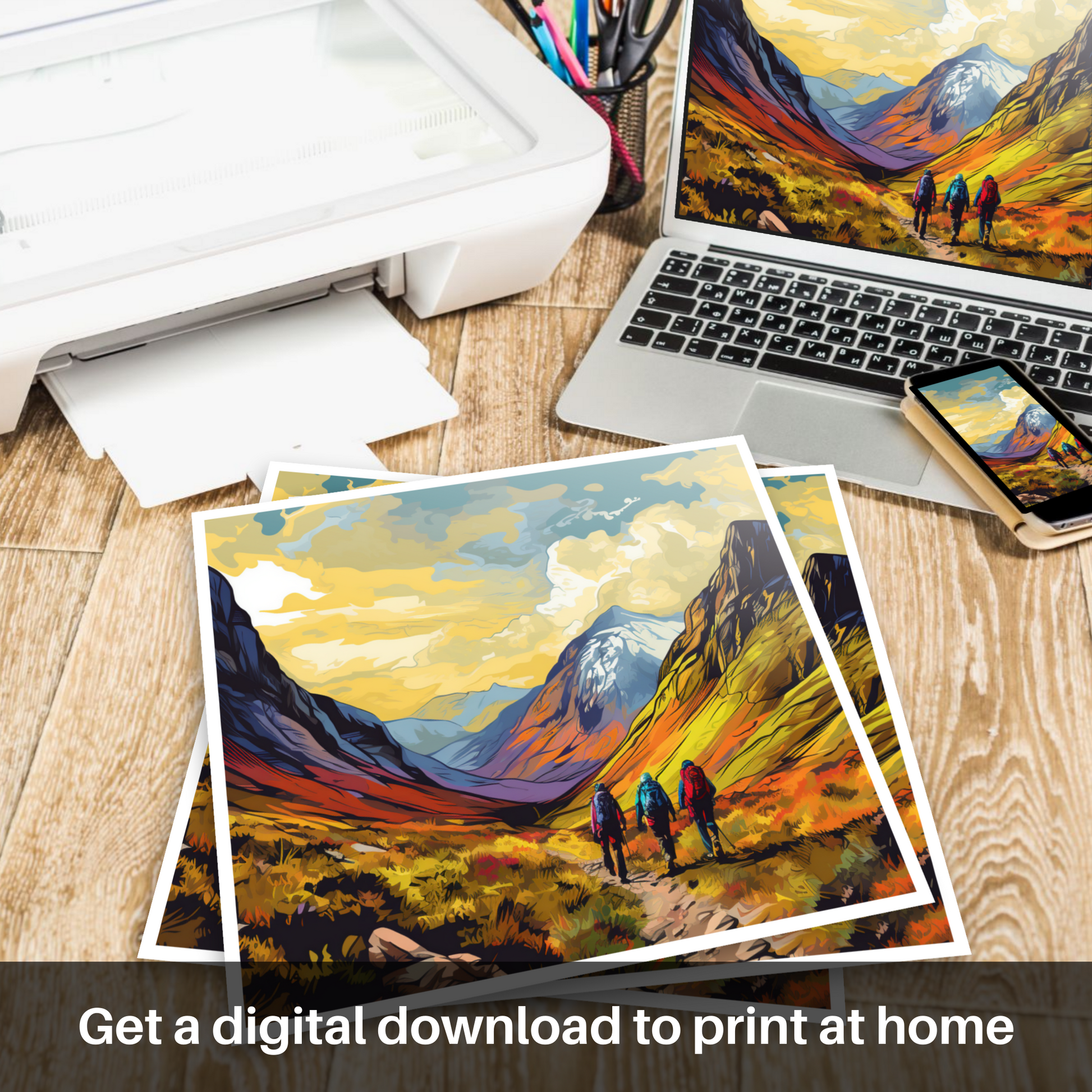 This print is not just a nod to an idyllic setting; it is a vivid testament to the spirit of exploration and the beauty of the Scottish Highlands. The strategic use of shadow and light brings depth to the valley, inviting onlookers to ponder what lies beyond the visible trails. It is a piece that is both a visual escape and an inspiration, perfect for any lover of art, nature, or the thrill of the hike.