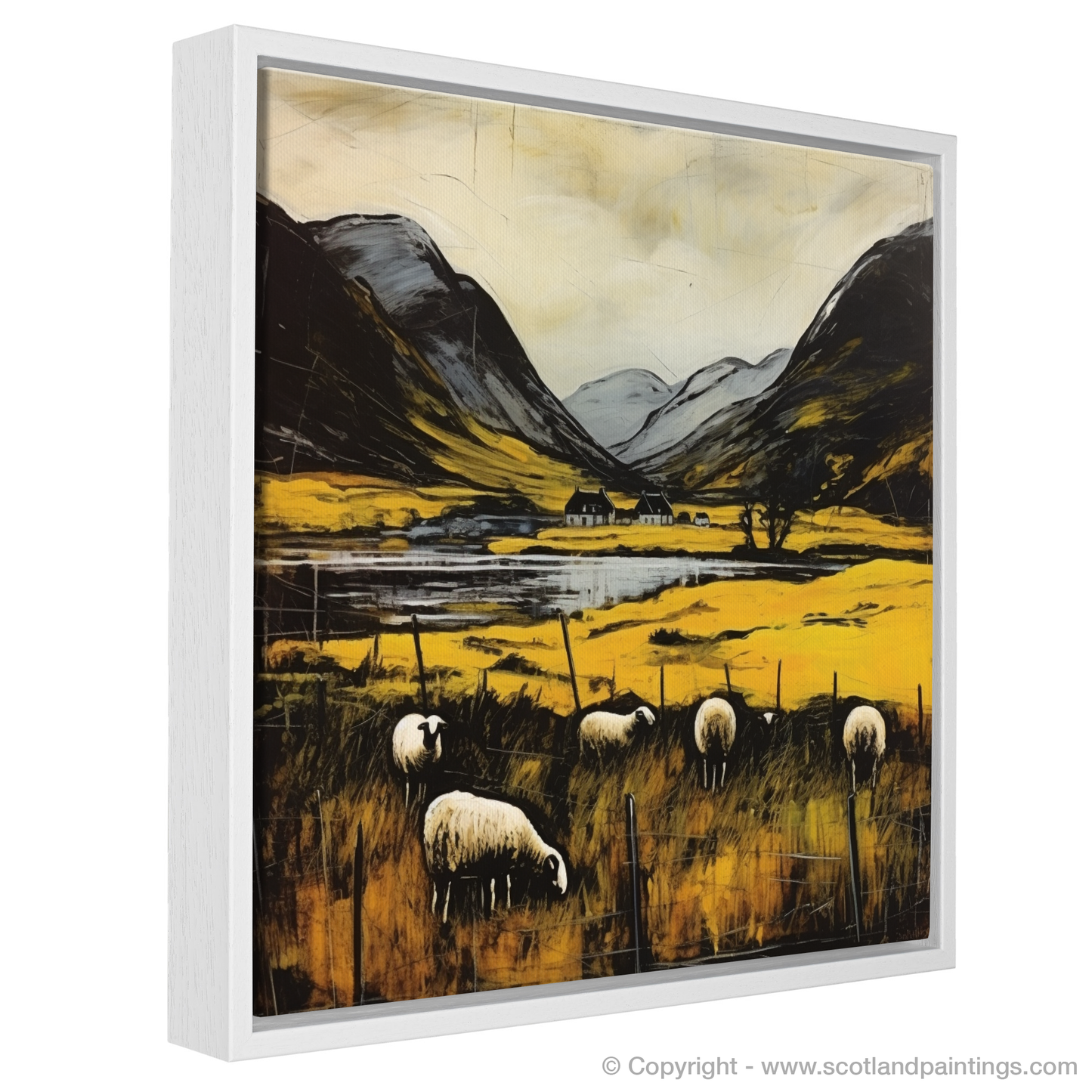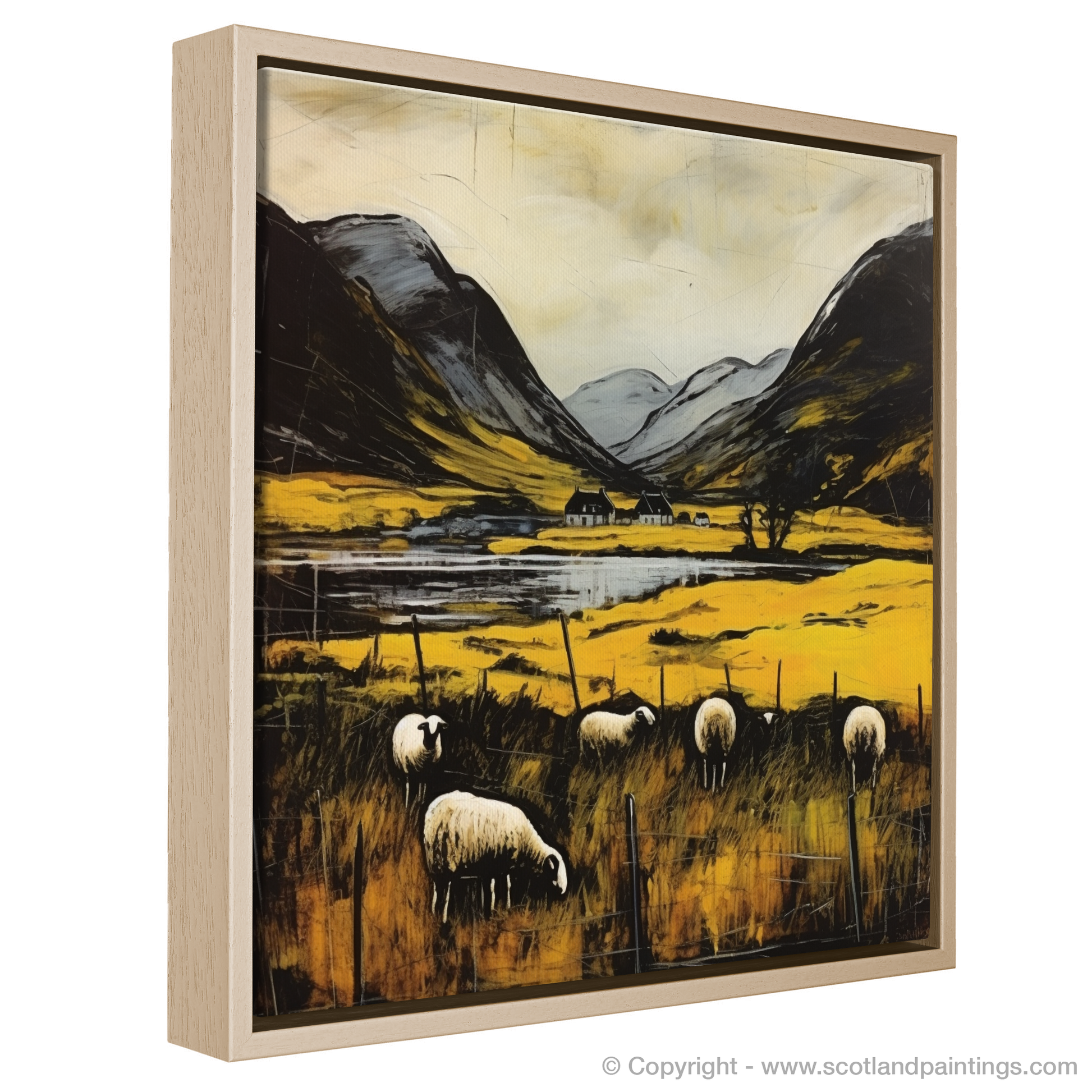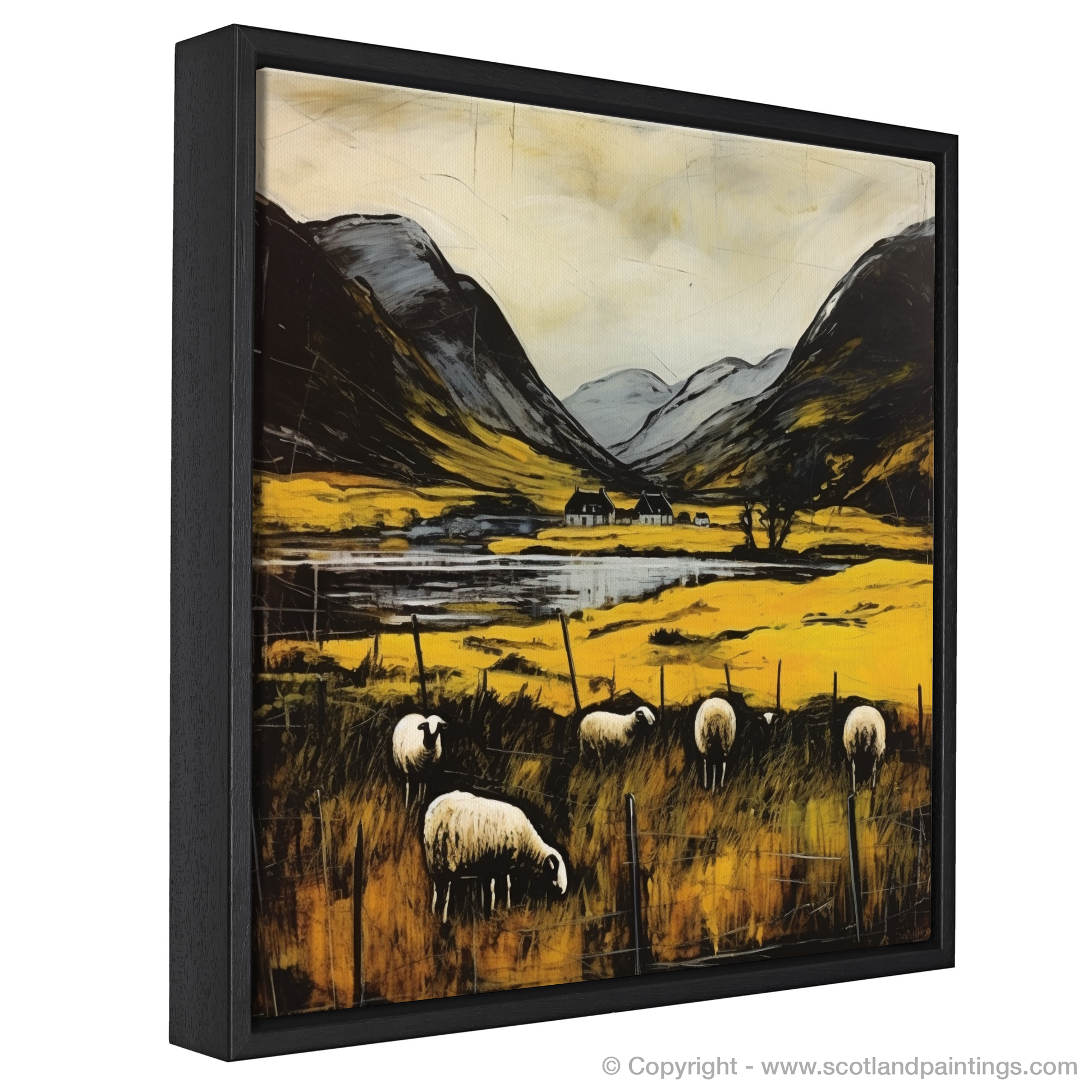 Immerse yourself in the bucolic serenity of the Scottish Highlands with this evocative piece, which captures the pastoral charm of Glencoe. Gentle sheep, symbols of tranquil life, graze in the foreground amidst a rich tapestry of golden and umber grasses that sway to an unseen breeze. The viewer's gaze is led through rough-hewn wooden fencing towards an idyllic waterside abode framed by the imposing grandeur of sloping mountainous silhouettes.