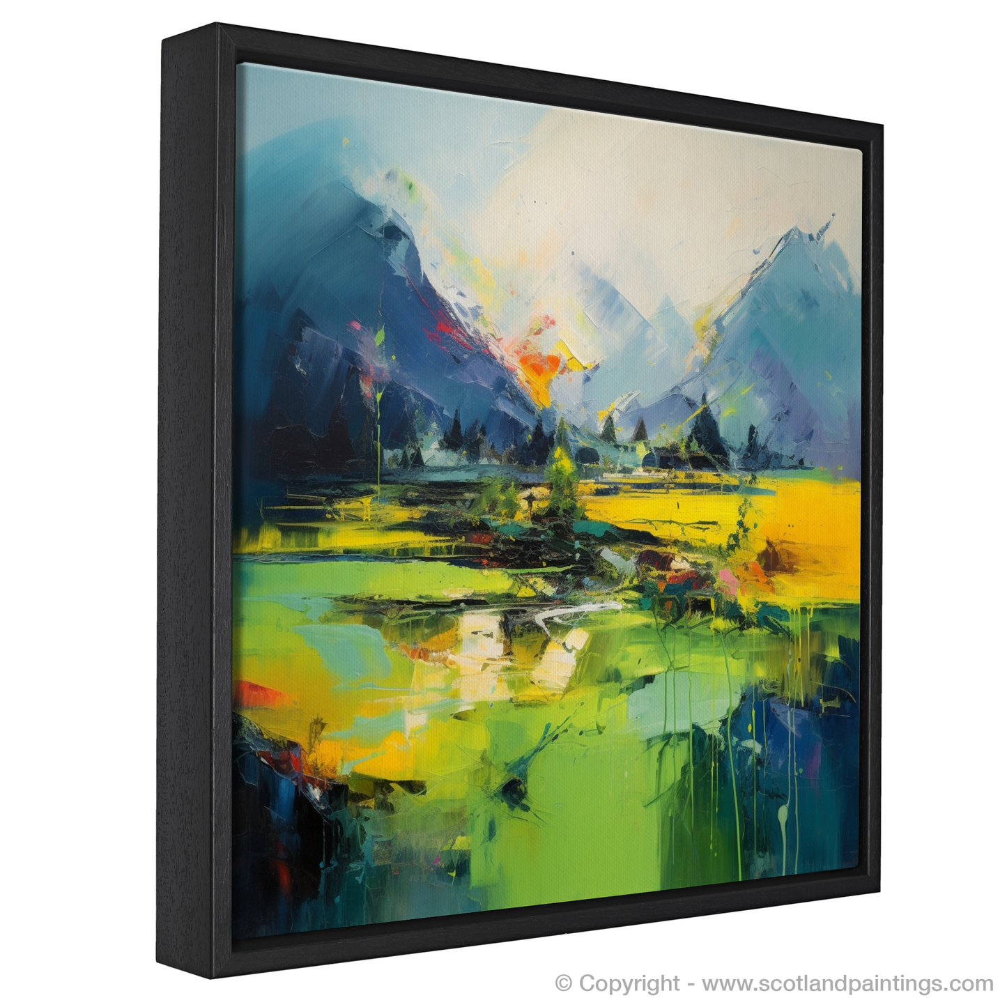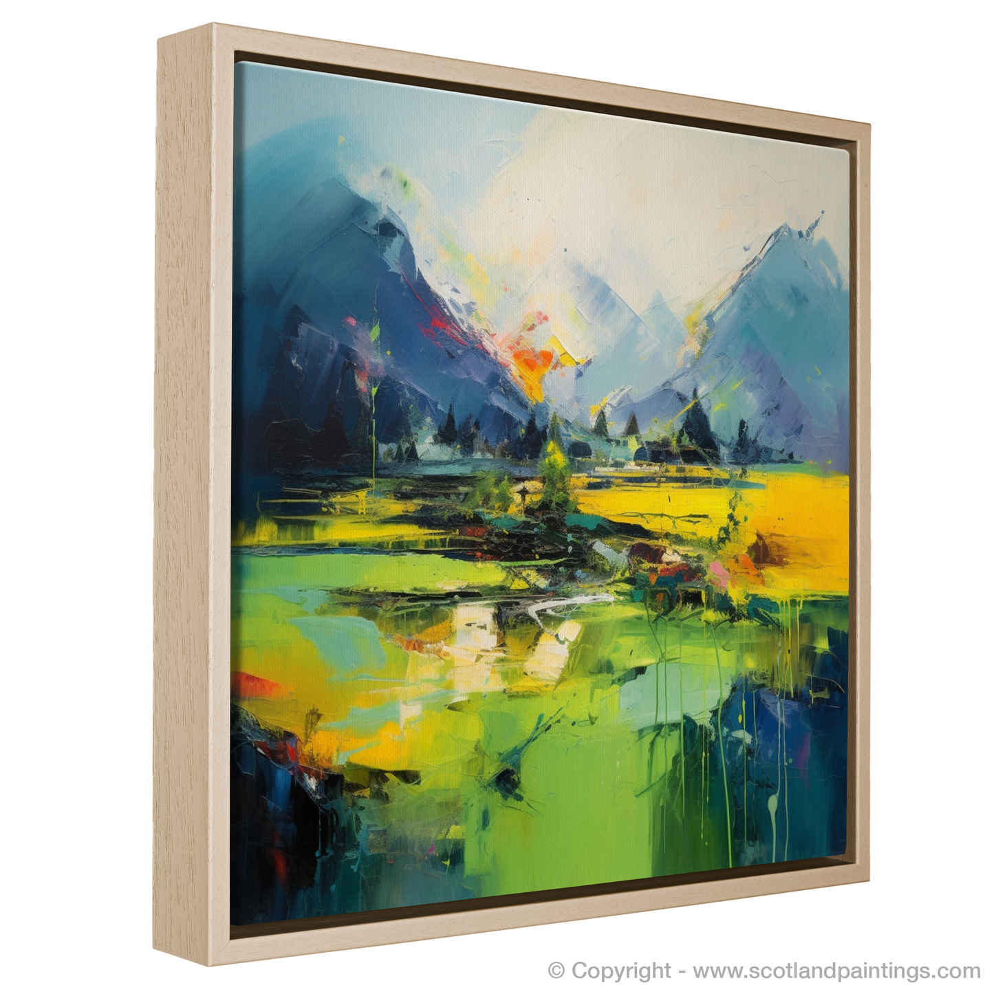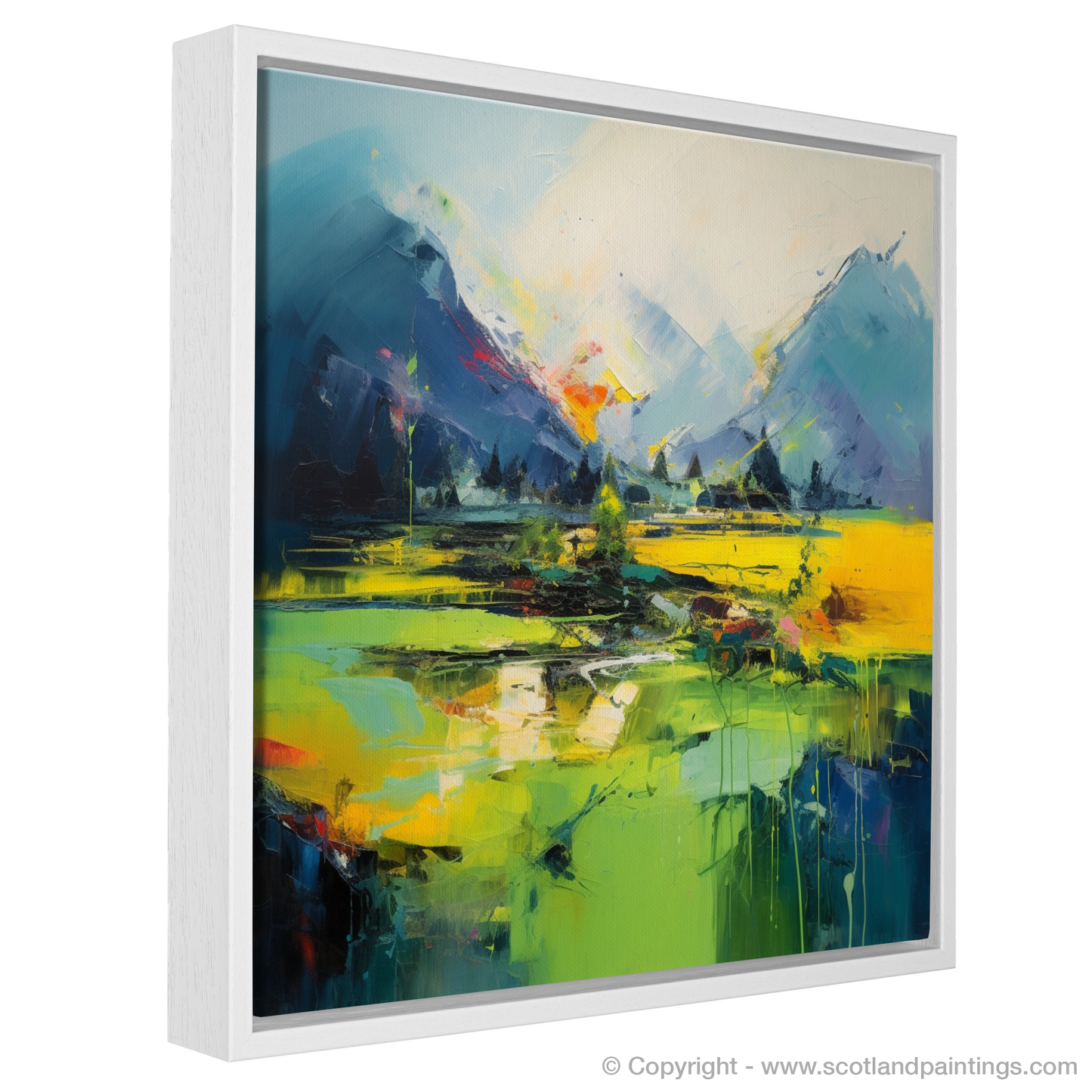Capturing the essence of early morning mist as it softly lifts from the serene landscape of Glencoe, this stunning print offers a liaison between nature and emotion, rendered with an abstract expressionist touch. Vivid splashes of colour evoke the shimmering dew, where hues of sun-streaked gold and lime efflorescence blend with the verdant greens of a waking countryside.