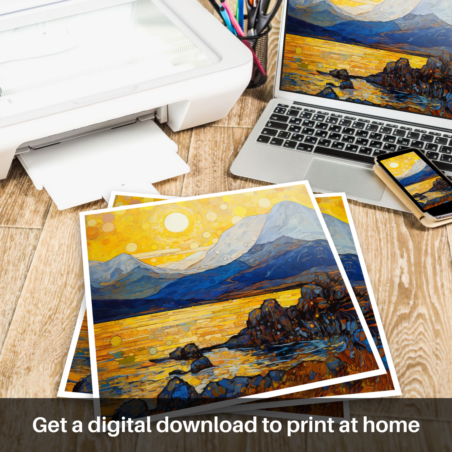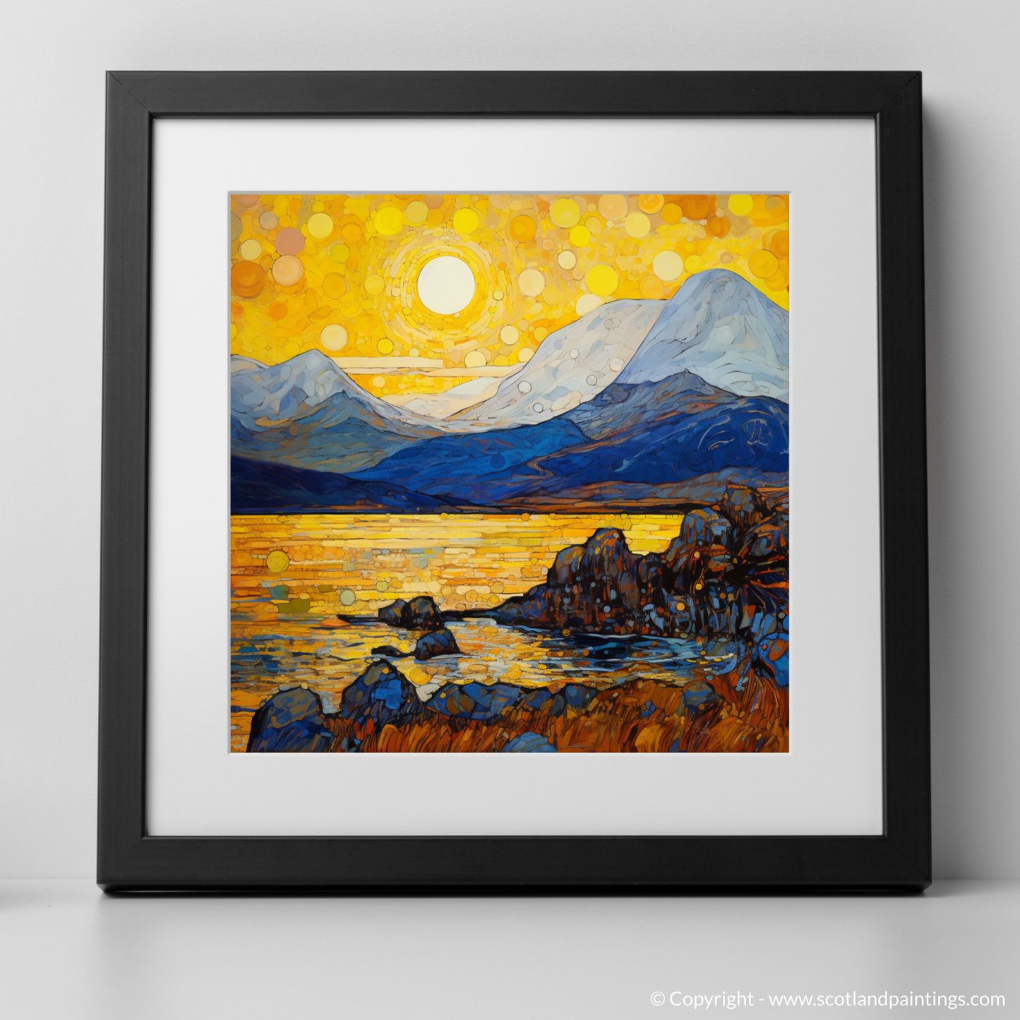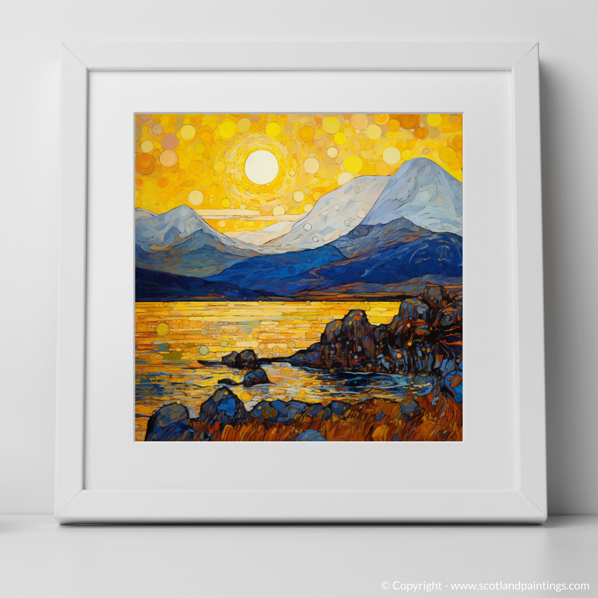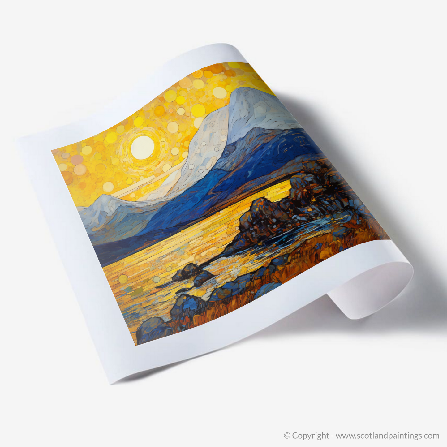 Dominating the middle ground, the eponymous Ben More unfolds its sloping contours in a dance with colour and form. The mountain is depicted in a series of elegant, flowing lines and shades of cool blues and whites. These cooler tones contrast magnificently with the warmth of the setting sun, creating an exquisite balance that beckons the viewer to immerse themselves in this otherworldly panorama.