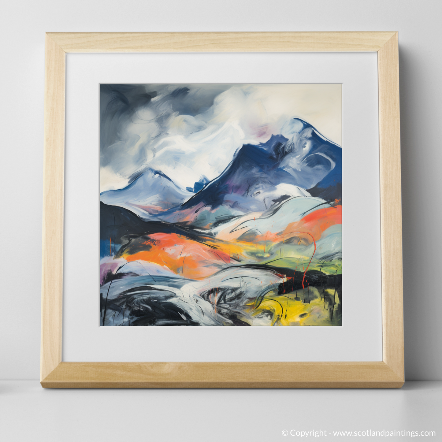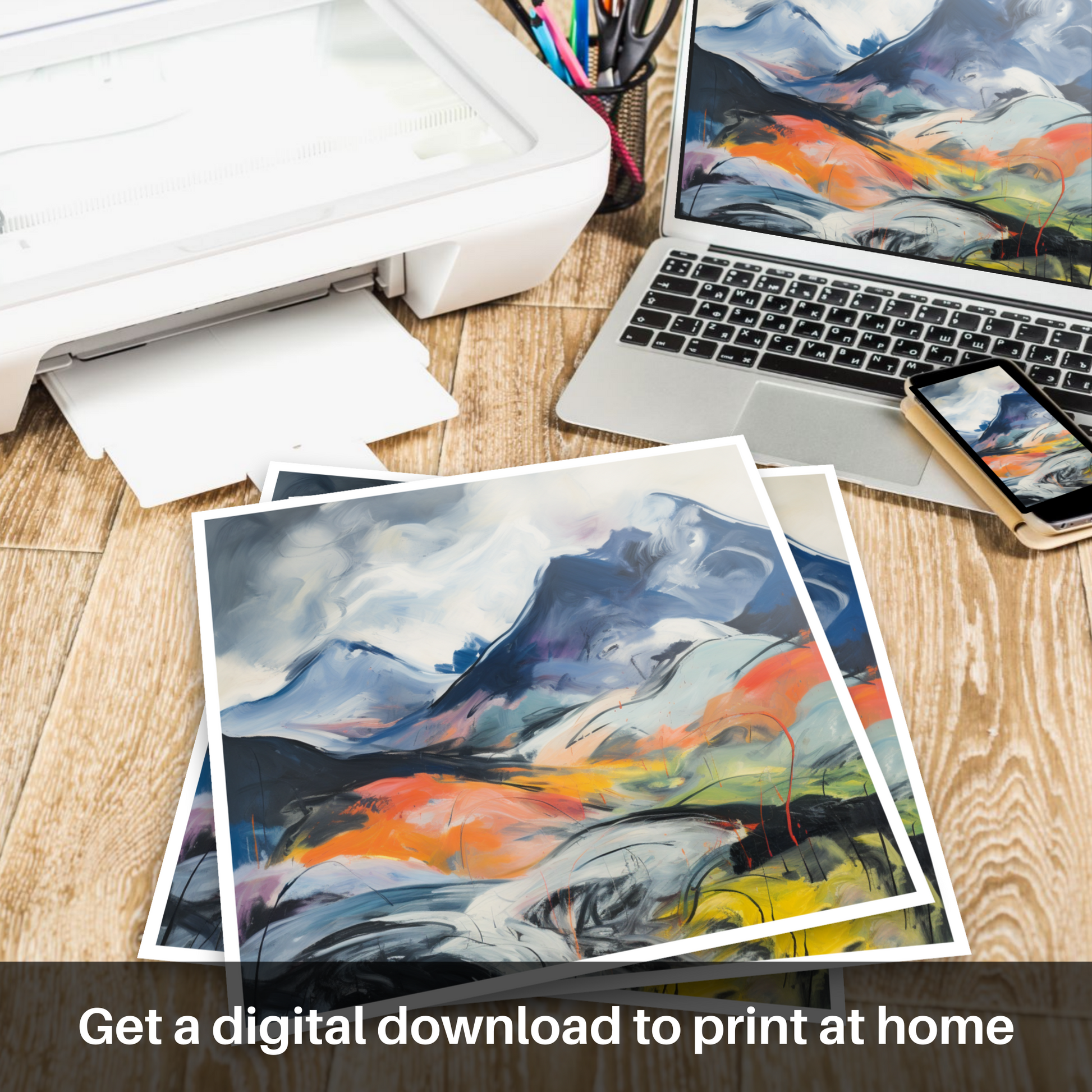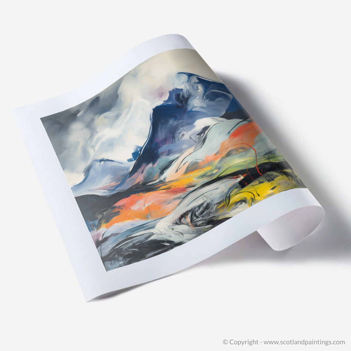 This abstract expressionist portrayal is part of the revered 'Scottish Munros' collection, capturing the essence of these majestic peaks with an emotional depth that transcends visual representation. This print promises not only a piece of the grand Scottish landscape for your home or office but also an immersive experience that stirs the soul with its passionate depiction of nature's grandeur.