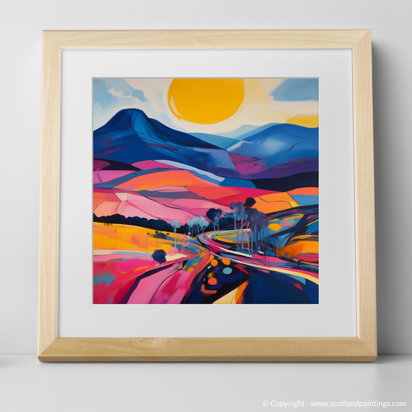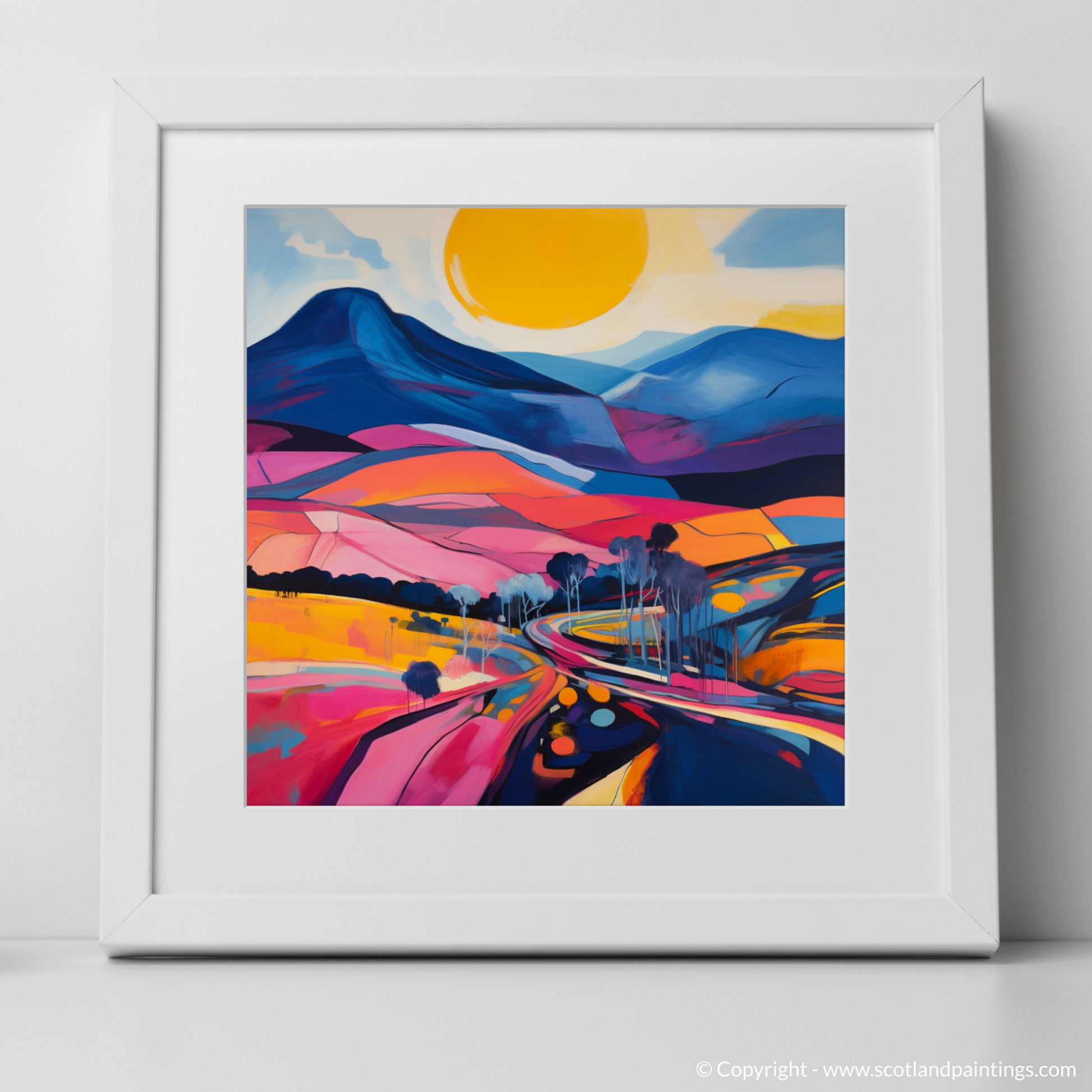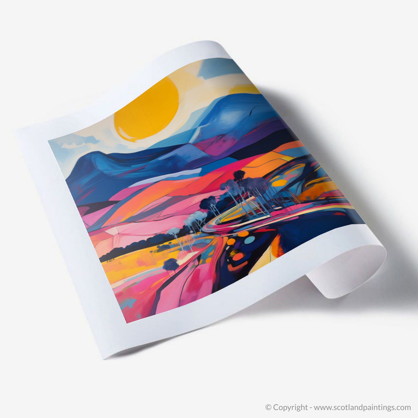 Immerse yourself in the vivid splendour of the Scottish highlands with this captivating print inspired by the scenic Ben Lawers. A glorious amalgamation of bold hues and sweeping forms transforms the rugged terrain into an abstract expanse of colour and emotion. This piece captures a reimagined view where azure and indigo swathes suggest the mountain's stately presence, while rolling landscapes in shades of vibrant pink, red, and orange infuse the composition with a warmth that belies the region's typically cooler climes.
