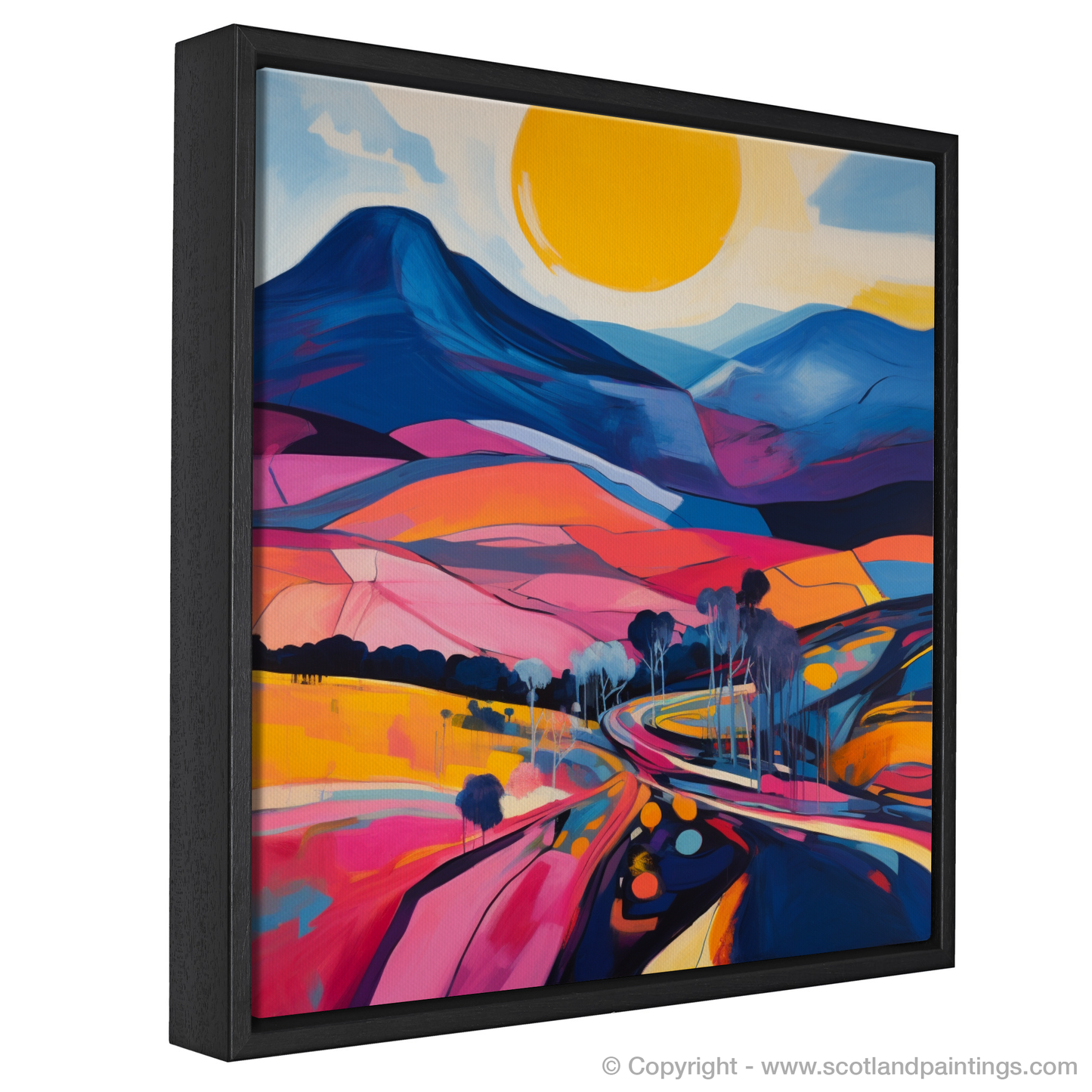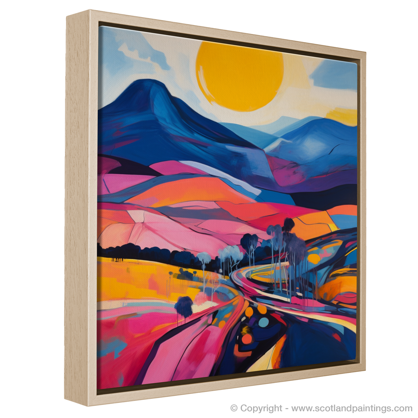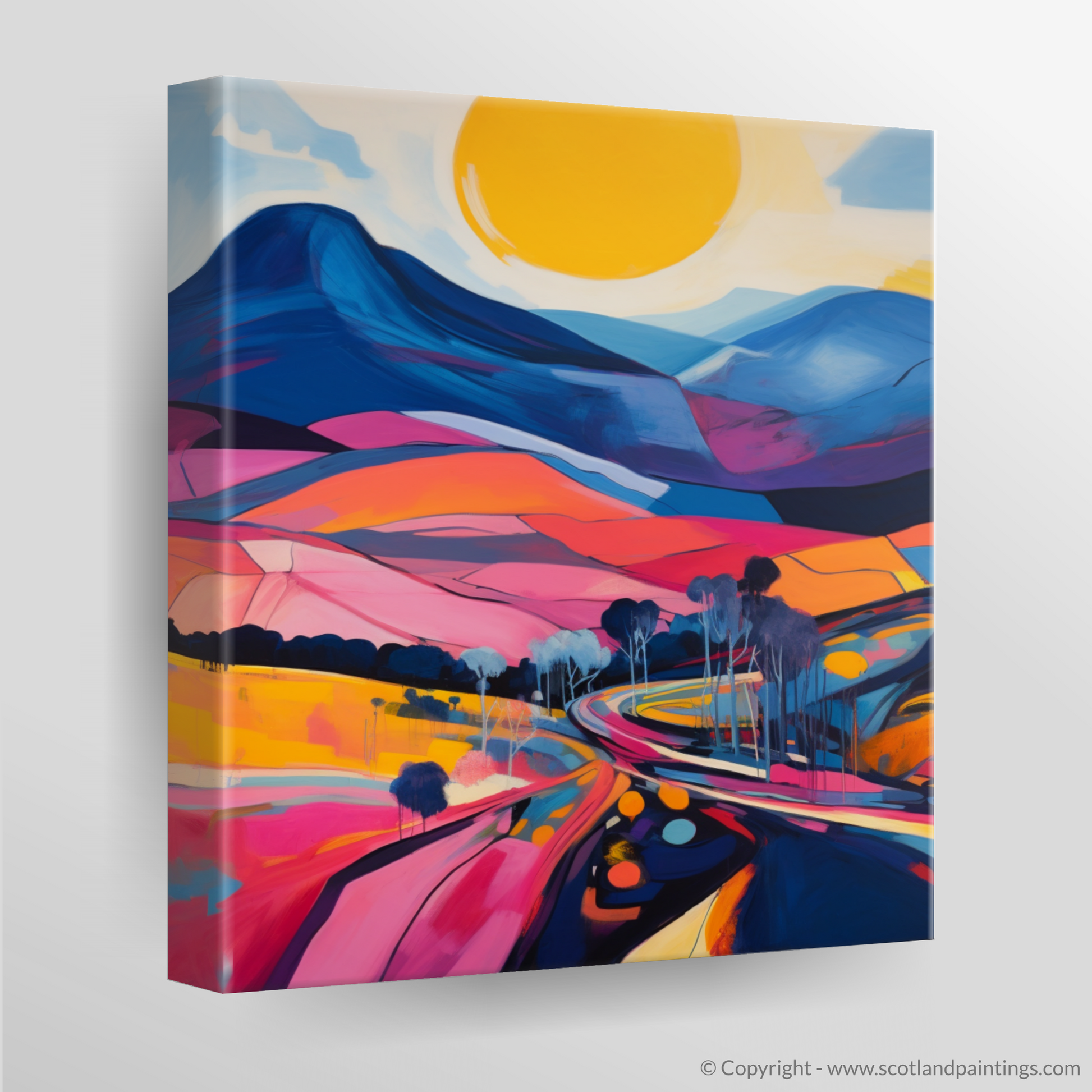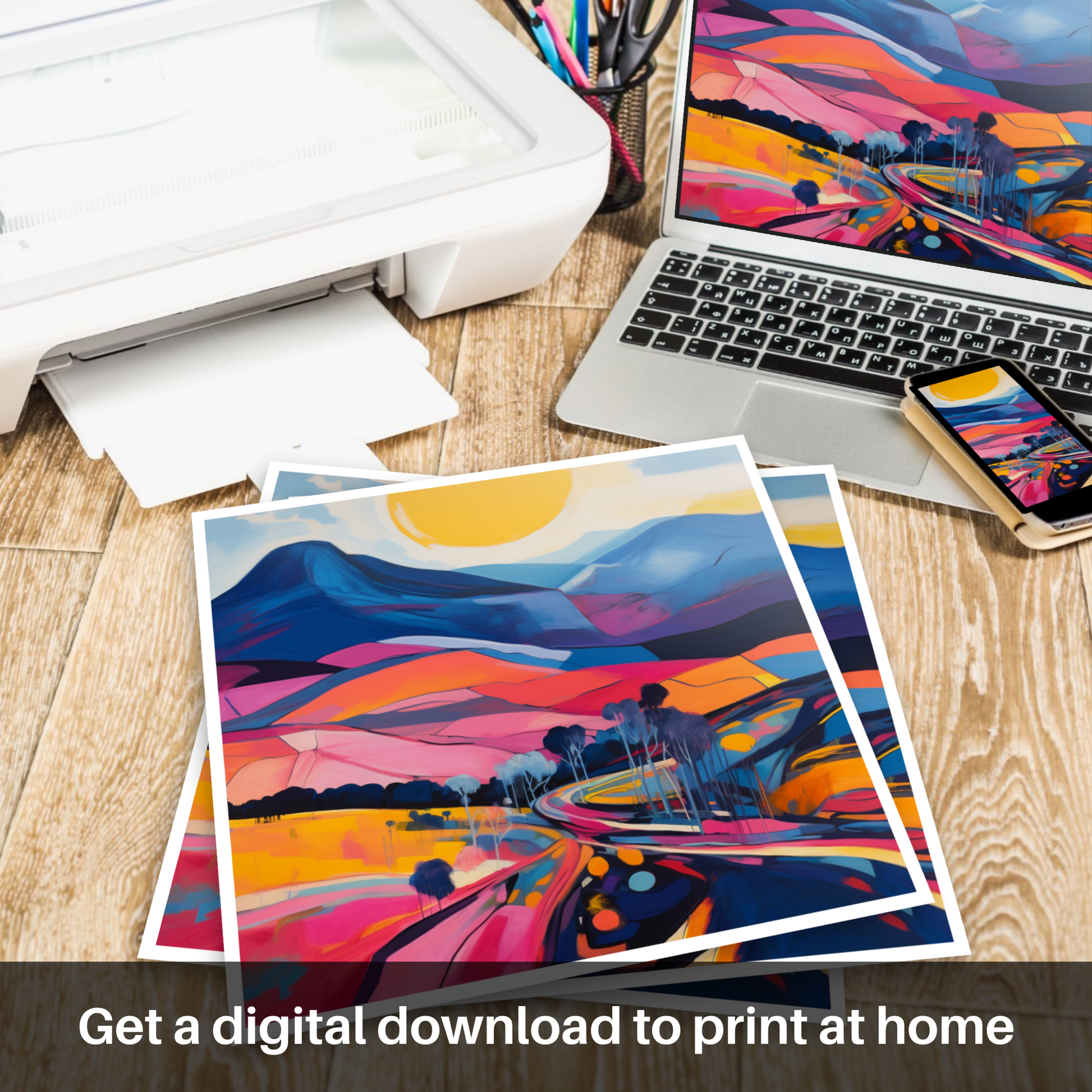 Immerse yourself in the vivid splendour of the Scottish highlands with this captivating print inspired by the scenic Ben Lawers. A glorious amalgamation of bold hues and sweeping forms transforms the rugged terrain into an abstract expanse of colour and emotion. This piece captures a reimagined view where azure and indigo swathes suggest the mountain's stately presence, while rolling landscapes in shades of vibrant pink, red, and orange infuse the composition with a warmth that belies the region's typically cooler climes.