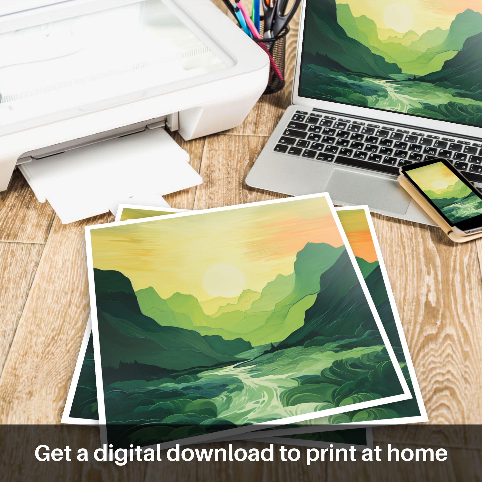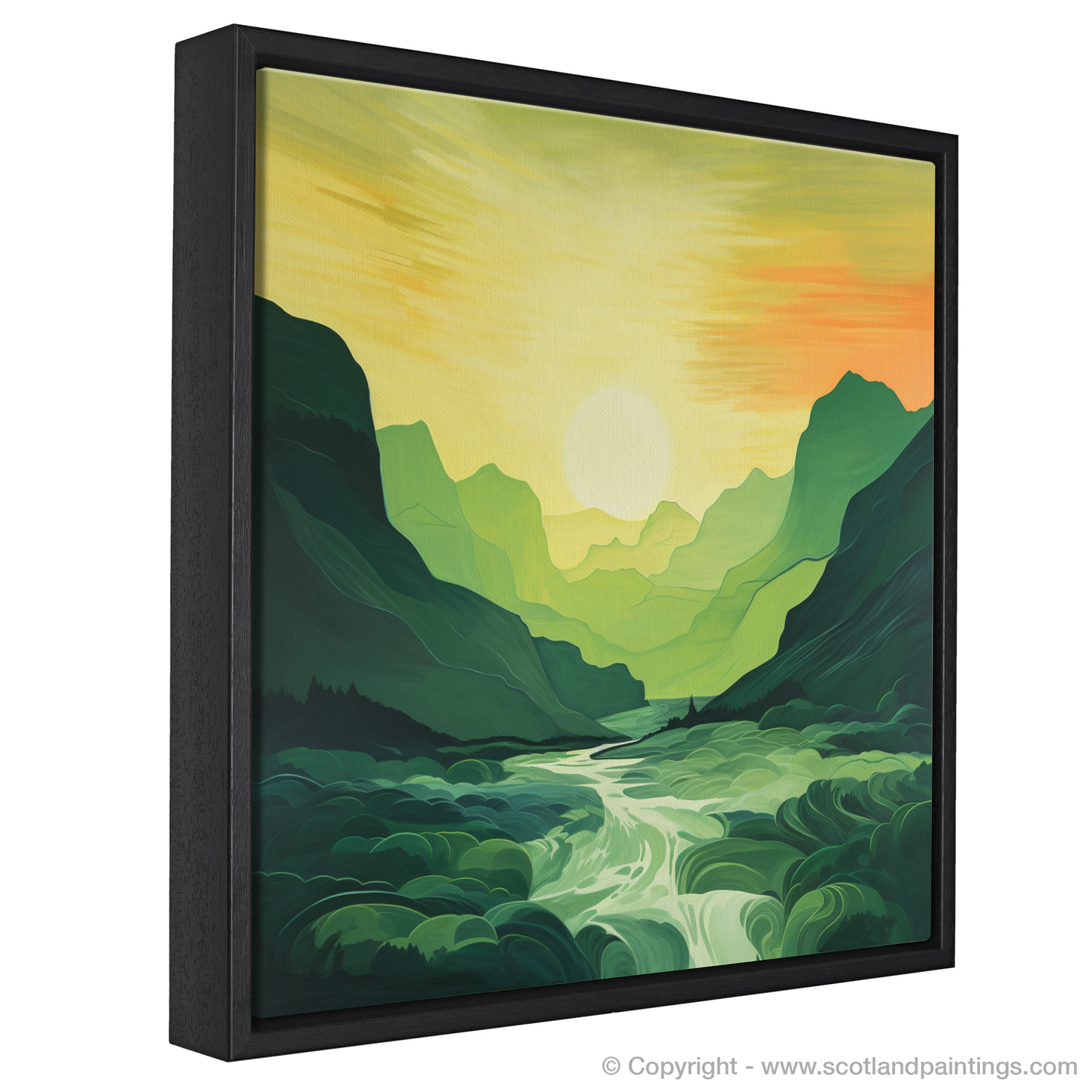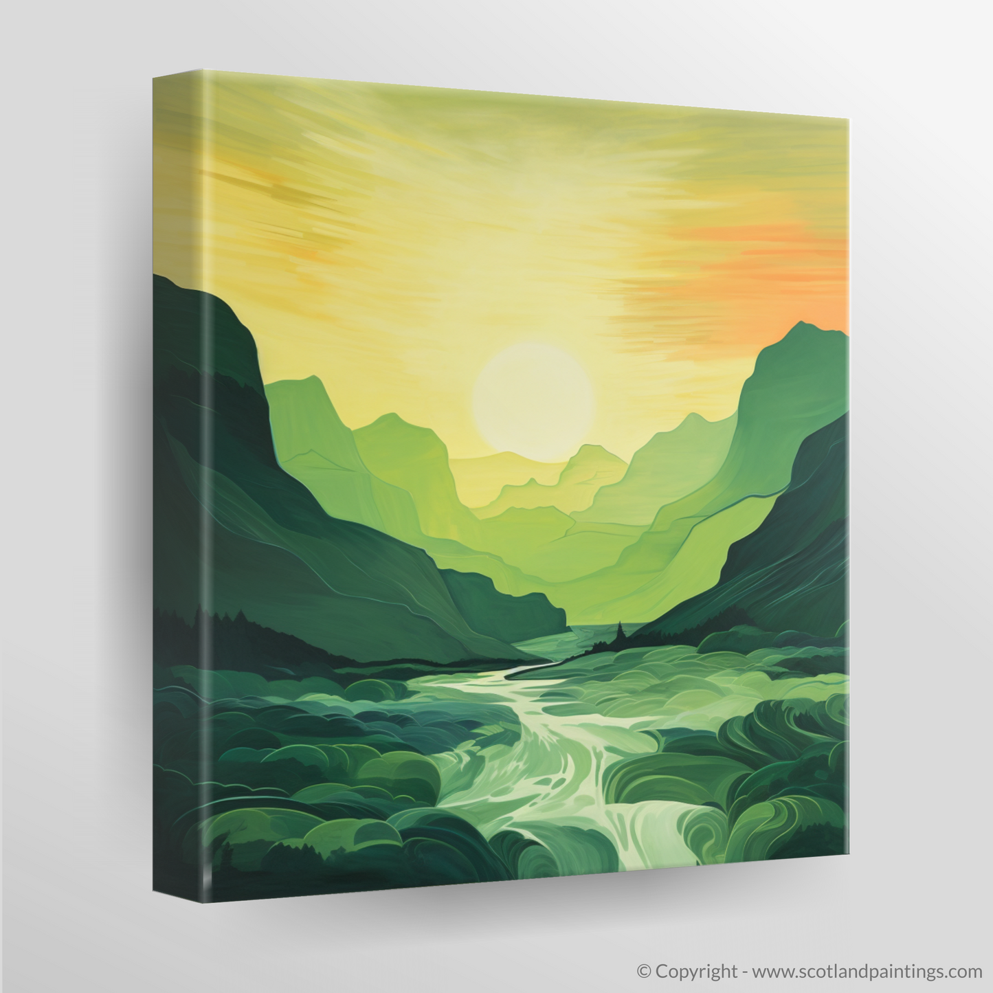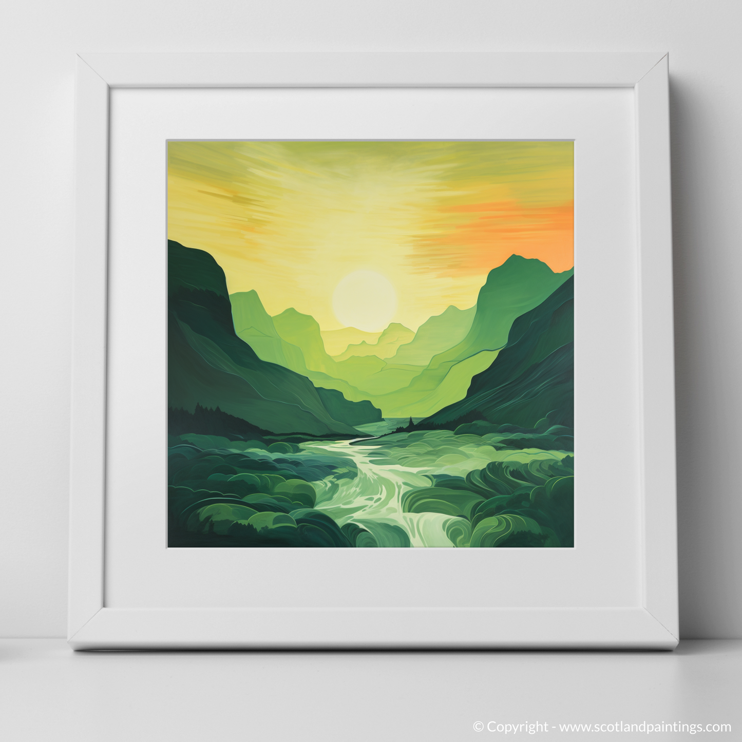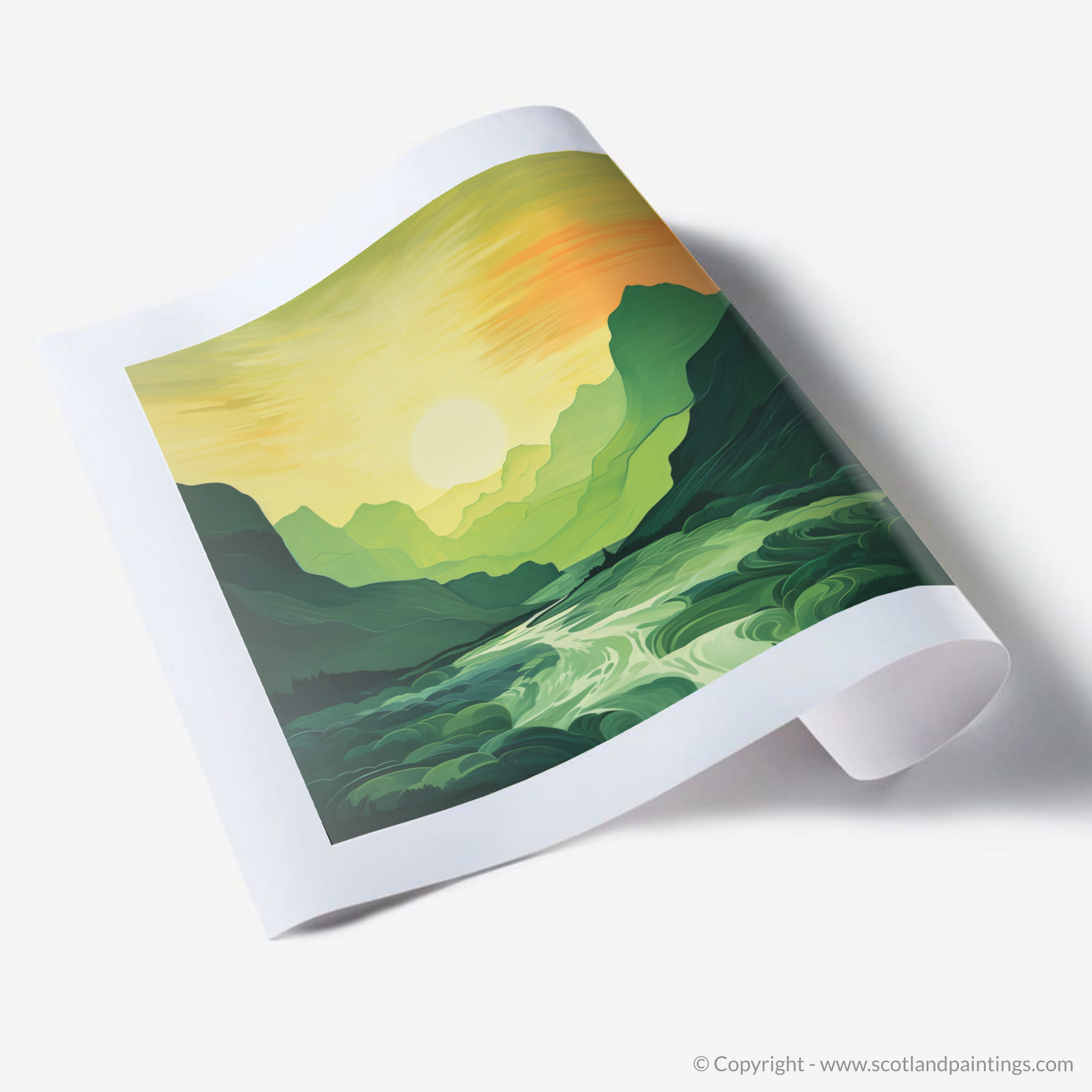 Immerse yourself in the serene beauty of the Scottish Highlands with our exclusive print. As the sun dips toward the horizon, the sky is set ablaze with warm hues of amber, goldenrod, and soft tangerine, mirroring the tranquillity of Glencoe's famed landscape. The minimalist interpretation of this verdant glen captures the unspoiled splendour of nature with broad, flowing brushstrokes that simplify the complexity of this rugged terrain into pleasing shapes and lines.