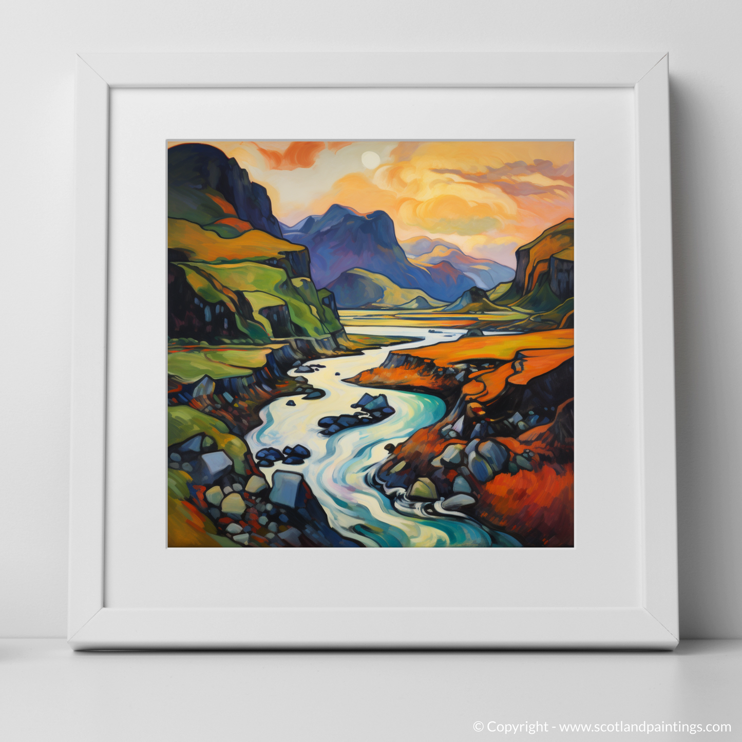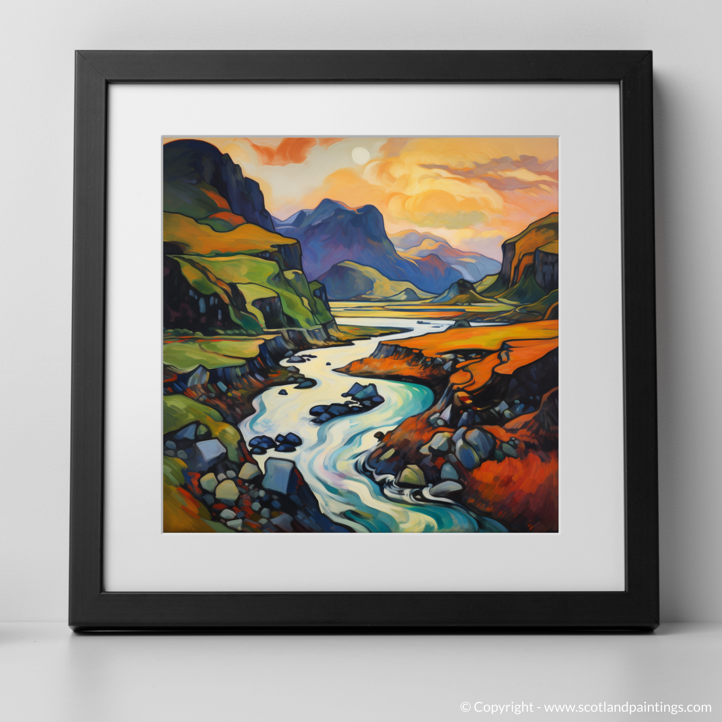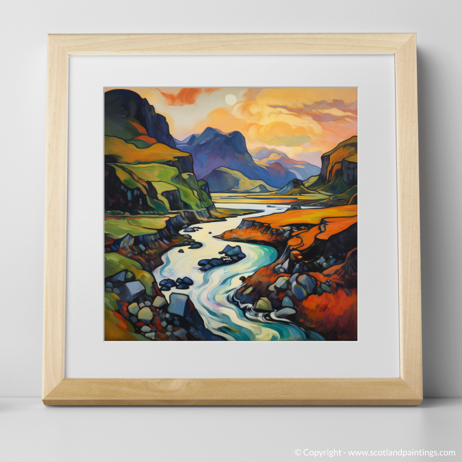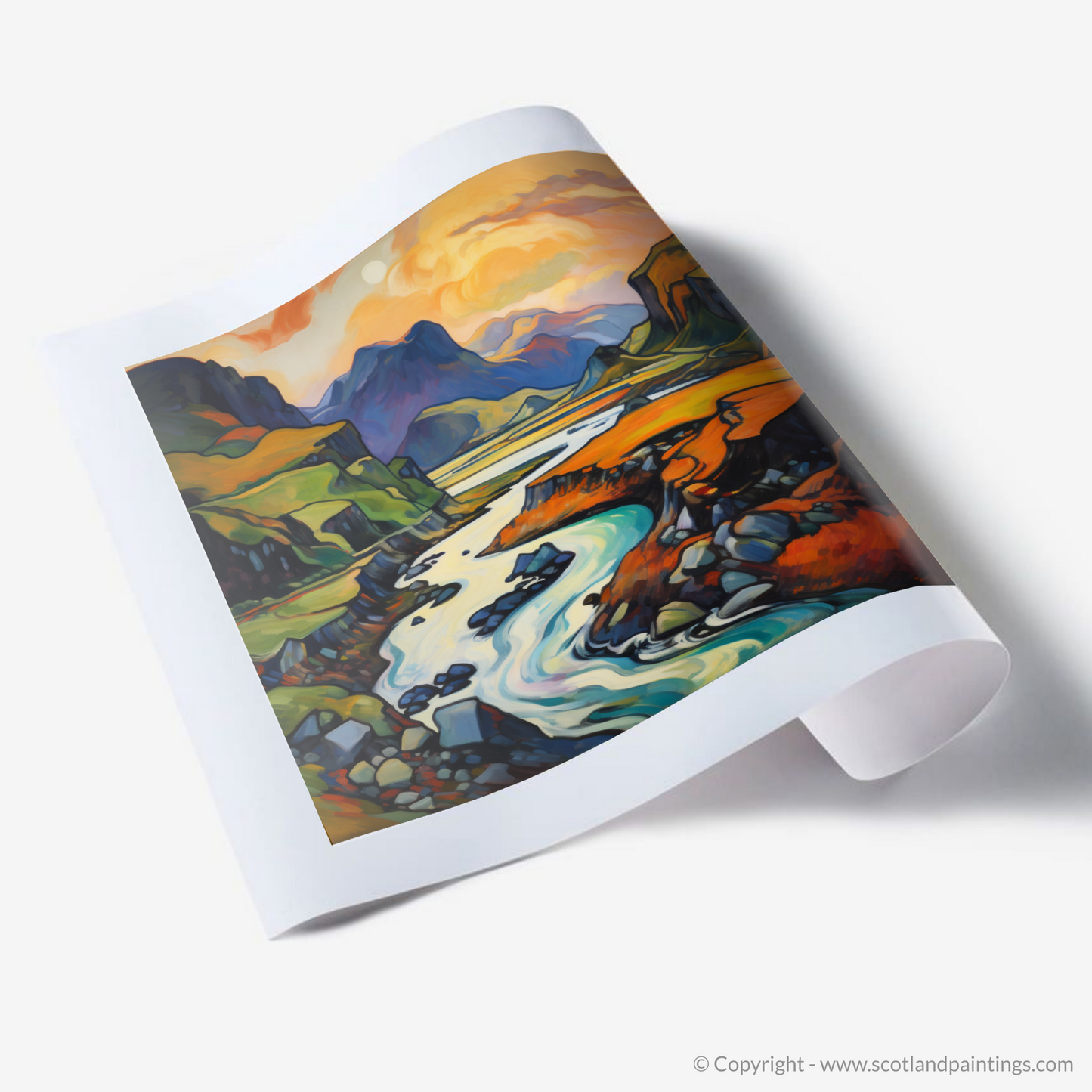 Immerse yourself in the vibrant hues and fluid lines of the Scottish Highlands with this captivating print, a dazzling homage to the wild and untamed beauty of Càrn an t-Sagairt Mòr. The artwork is alive with the expressive colour palette characteristic of Fauvism, transforming a traditional landscape into an abstract symphony of colour.