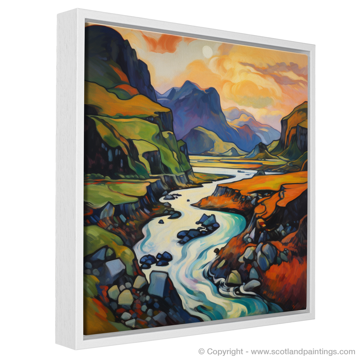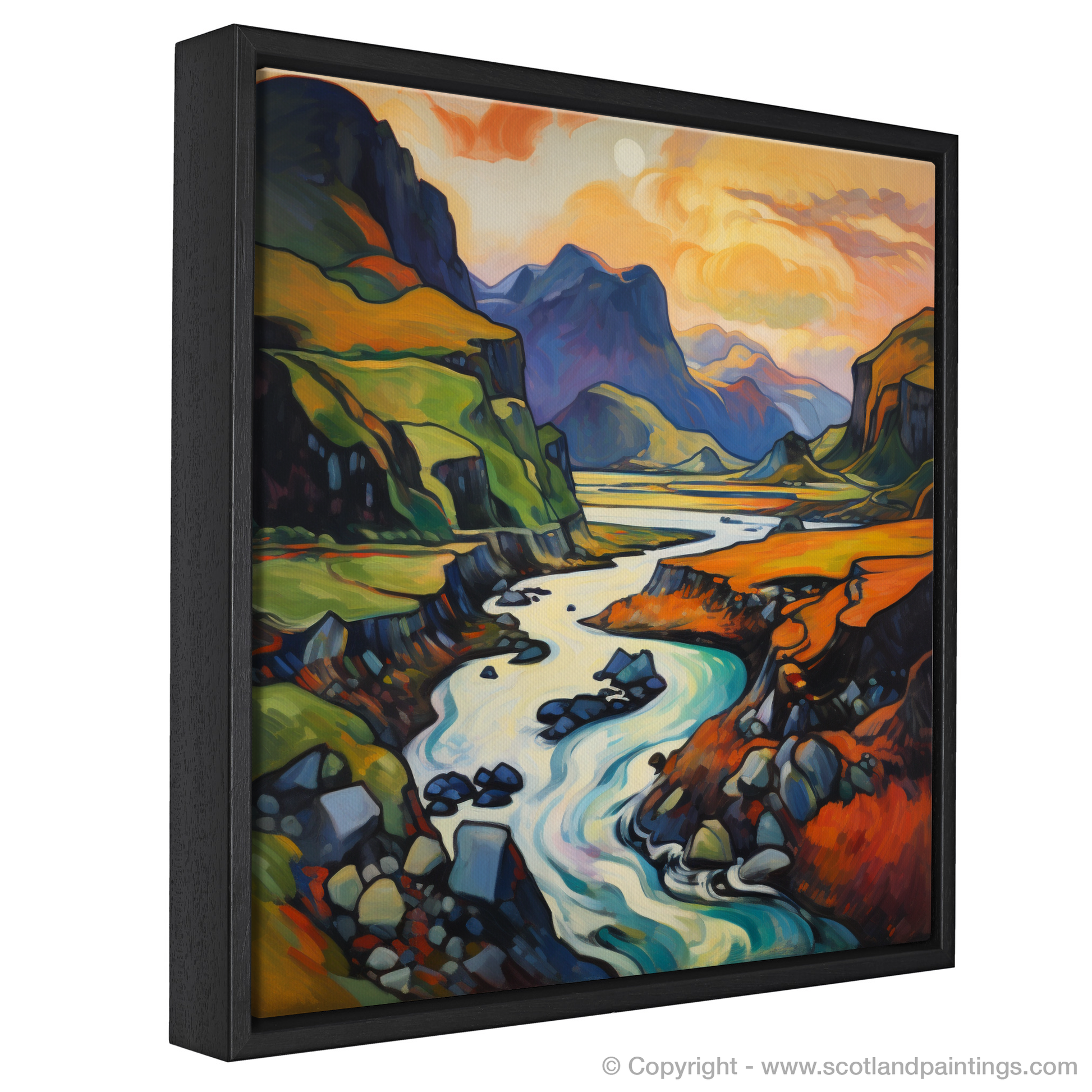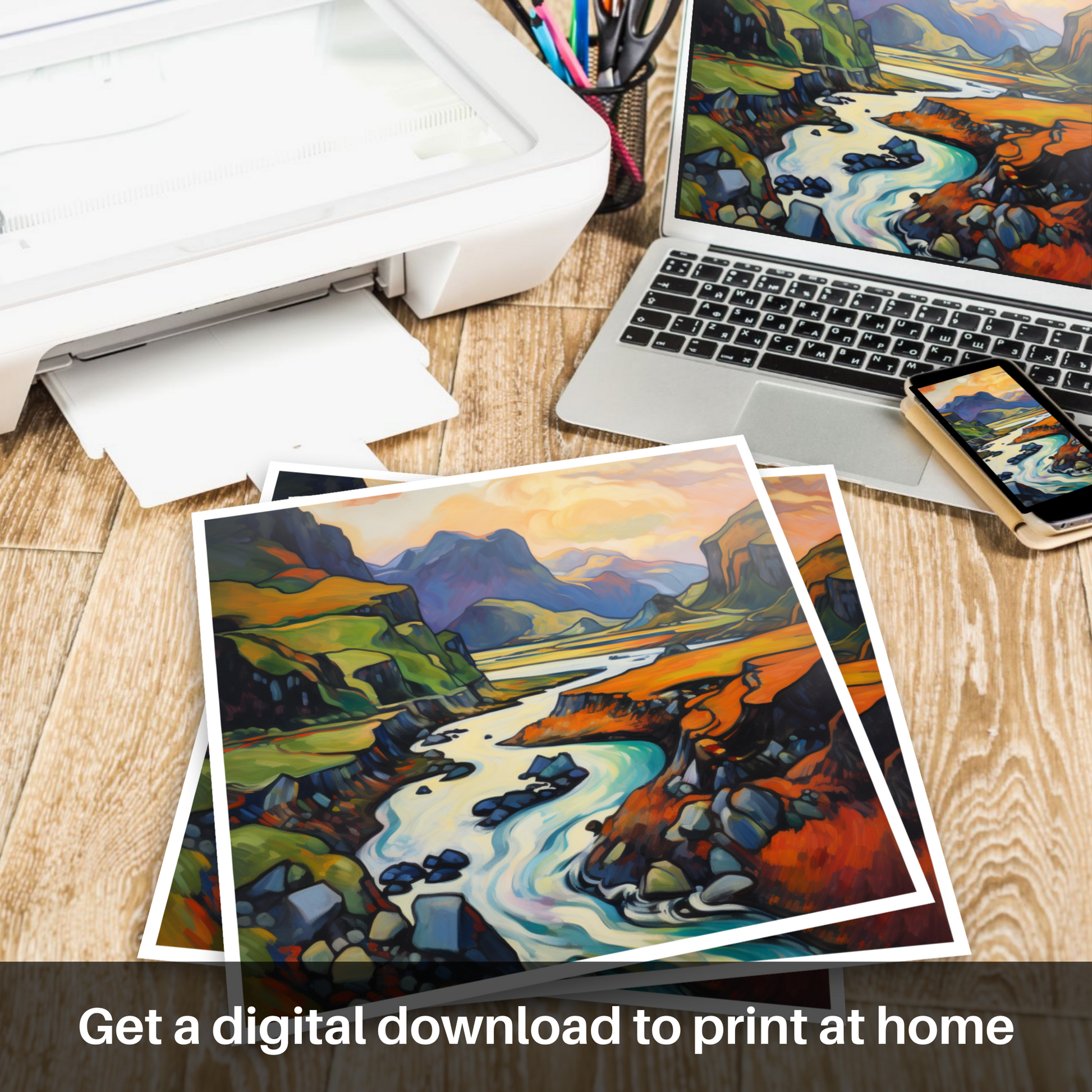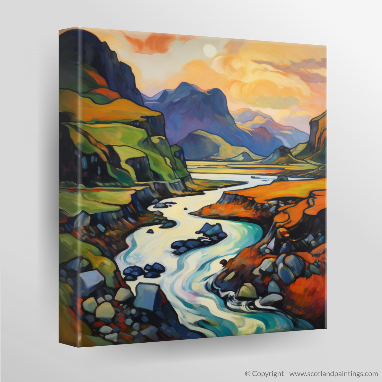 Immerse yourself in the vibrant hues and fluid lines of the Scottish Highlands with this captivating print, a dazzling homage to the wild and untamed beauty of Càrn an t-Sagairt Mòr. The artwork is alive with the expressive colour palette characteristic of Fauvism, transforming a traditional landscape into an abstract symphony of colour.
