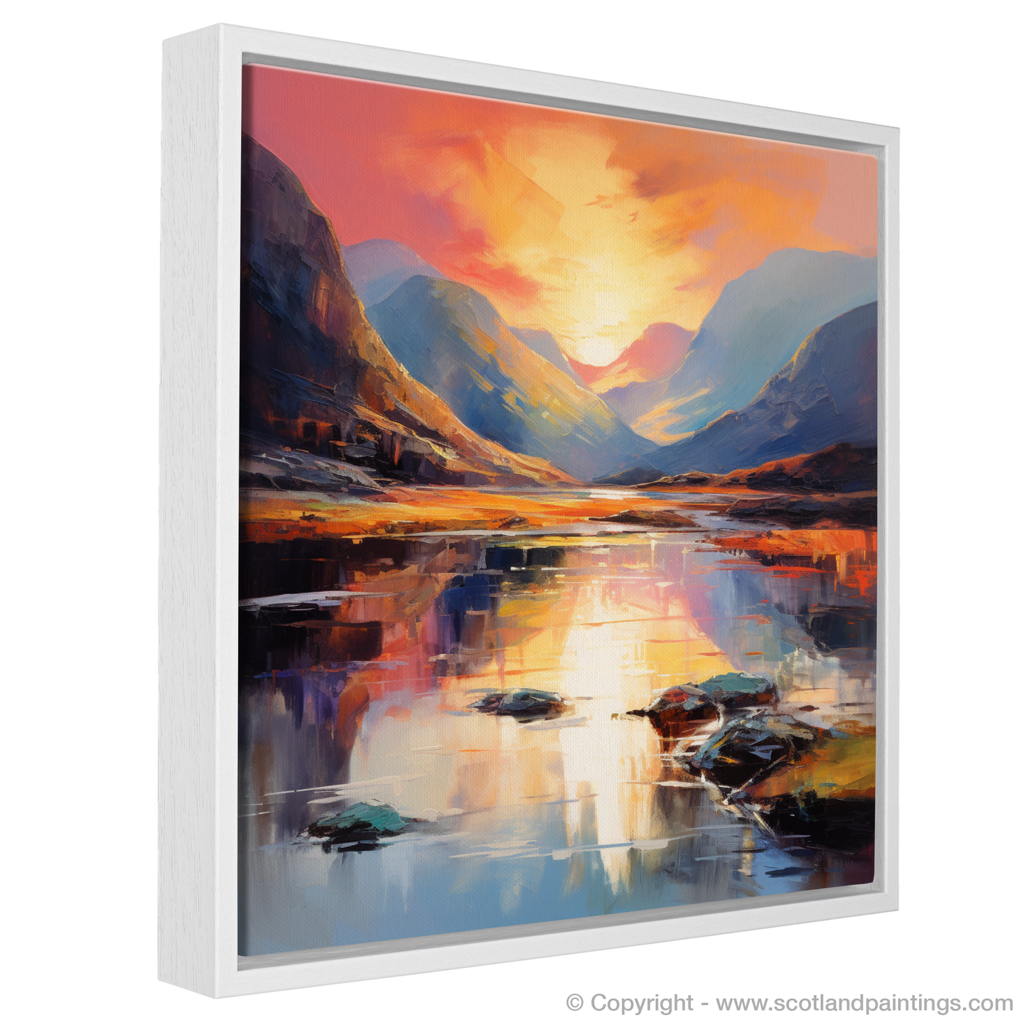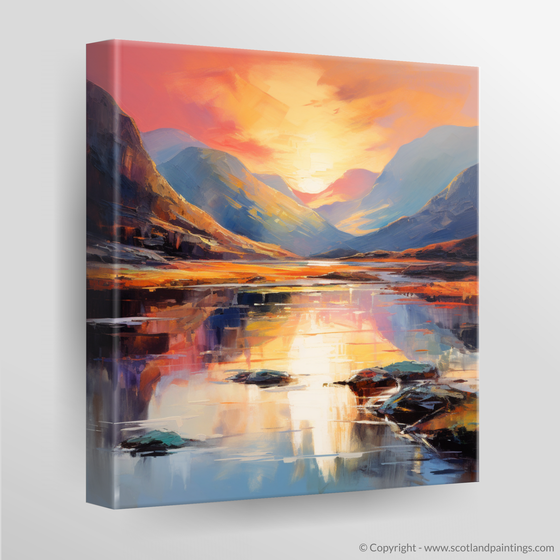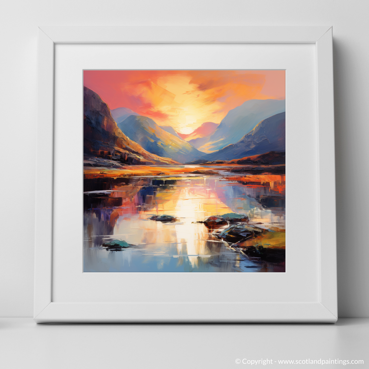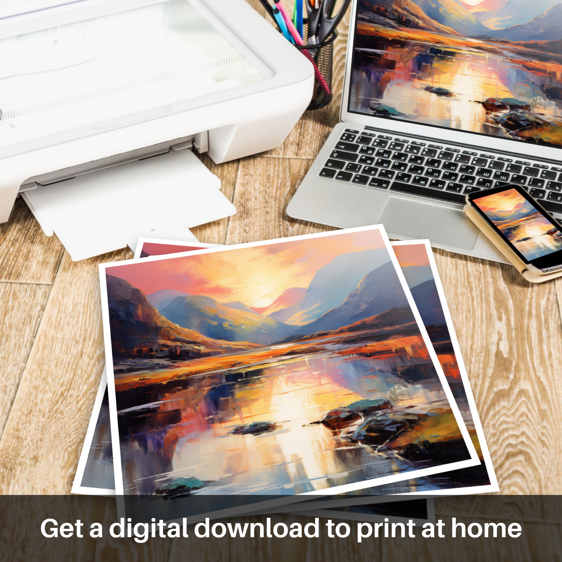 Immerse yourself in the dramatic allure of the Scottish Highlands with this captivating abstract expressionist print. Envisioned from the breathtaking reflections of a lochan at sunset in the mystical Glencoe Valley, the piece exudes a vibrant sense of calm and serenity.